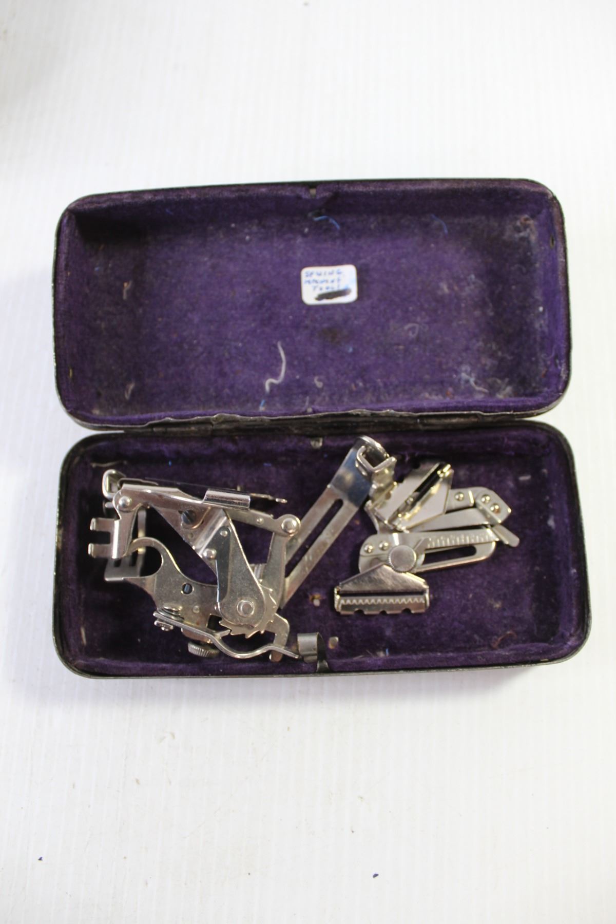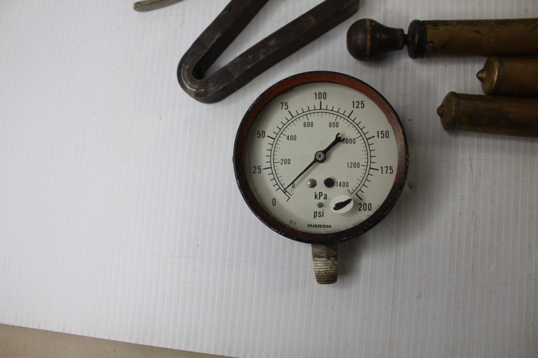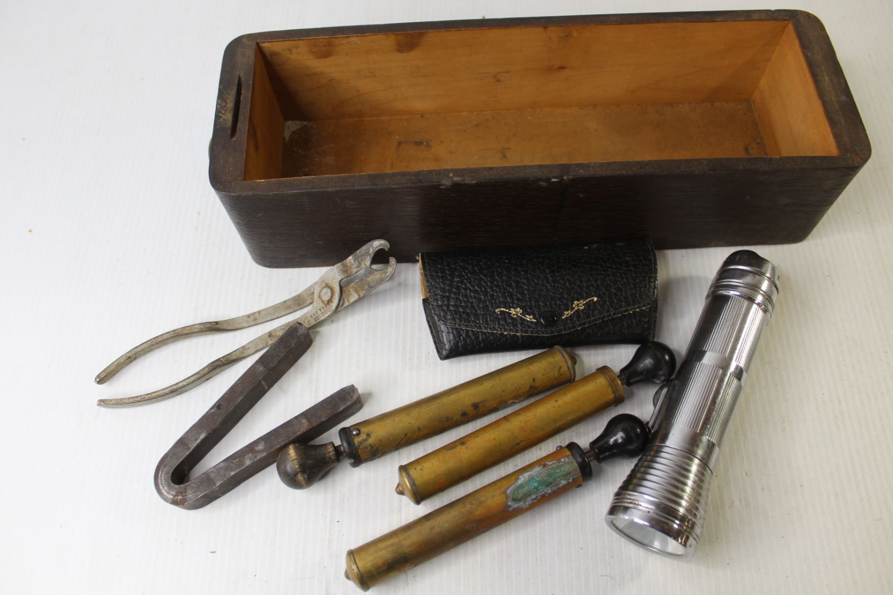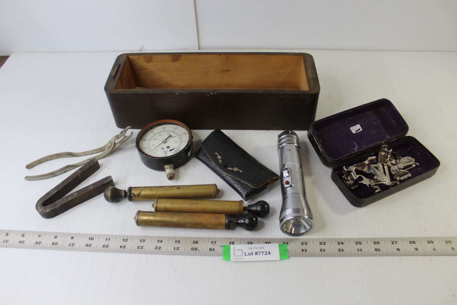 Vintage Sewing Machine Wood Drawer, Brass Air Pumps, Marsh Pressure Gauge, Vintage Sewing Machine Tool Kit, Vintage Flashlight, Misc.