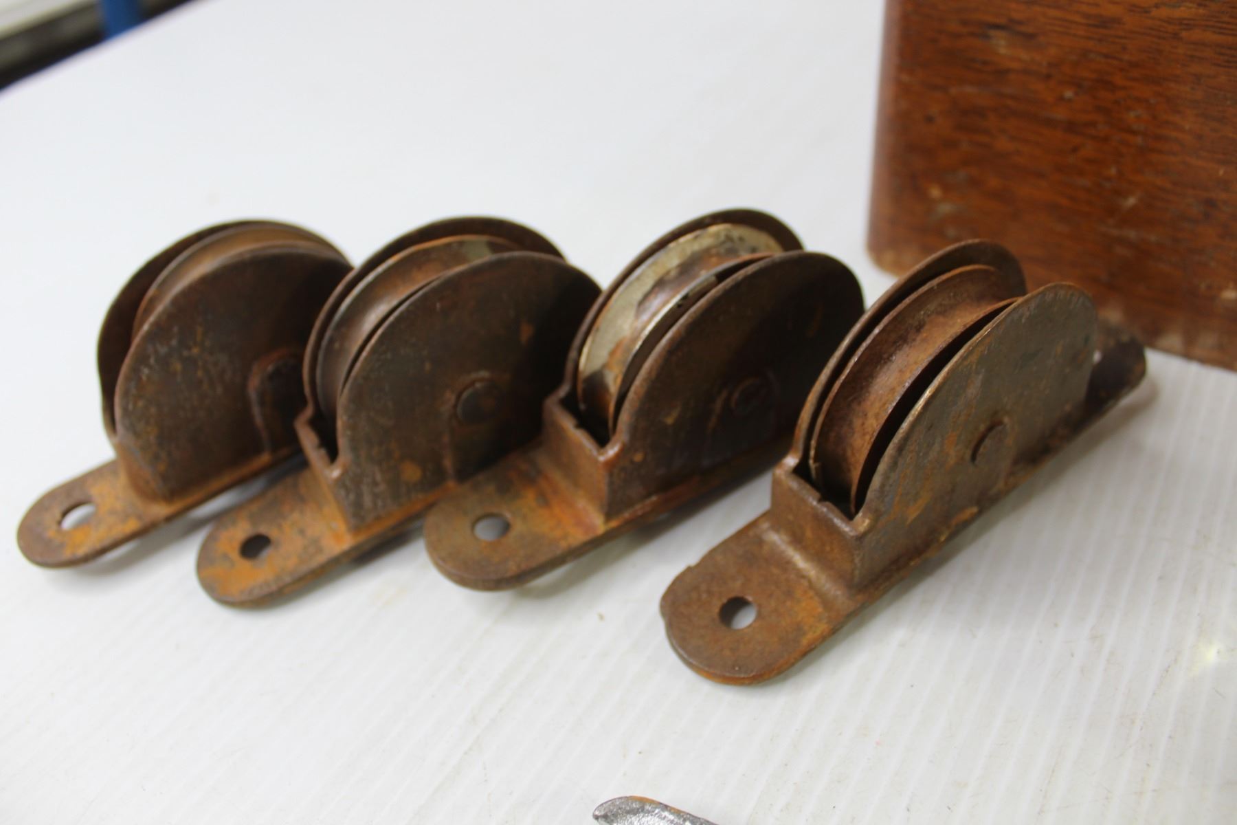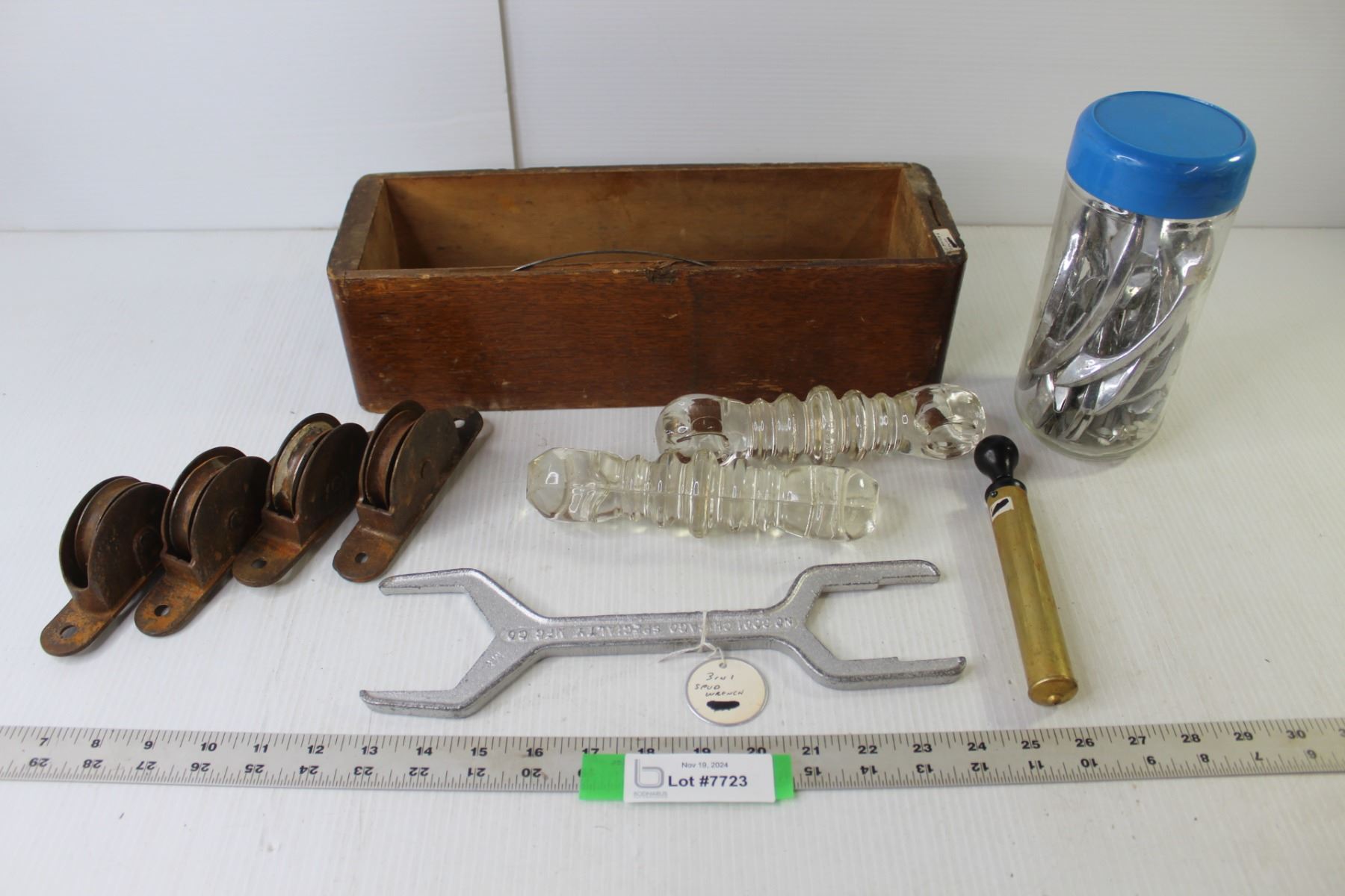Vintage Sewing Machine Wood Drawer, Jar Kitchen Cabinet Handles, Spud Wrench, Vintage Pulleys & Insulators