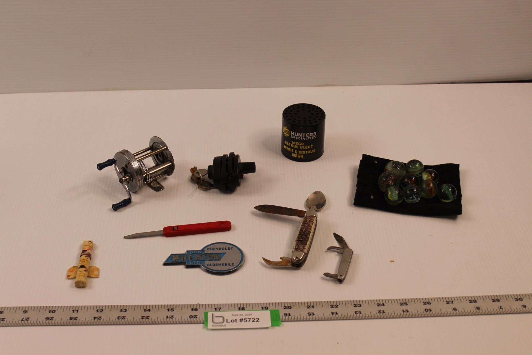 Vintage Shakespeare True Blue 1956 Fishing Reel(Incomplete), Trigger Lock w/Keys, (3) Pocket Knives, Small Bone Totem, (9) Vintage Shooter Marbles(Few Chipped), Don Weaton LTD. Chevrolet/Oldsmobile Dealer Badge & Hunters Specialties "Mega Estrus Bleet" Call