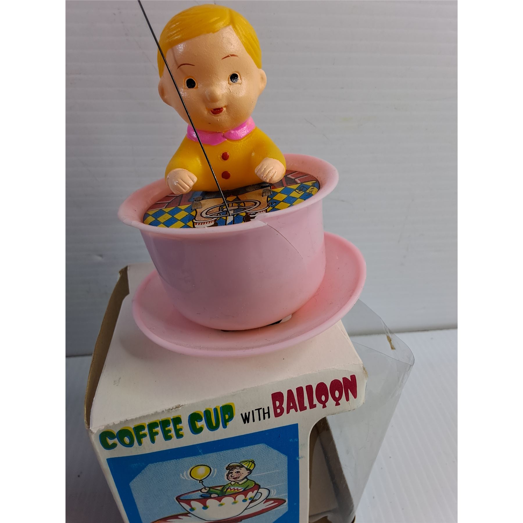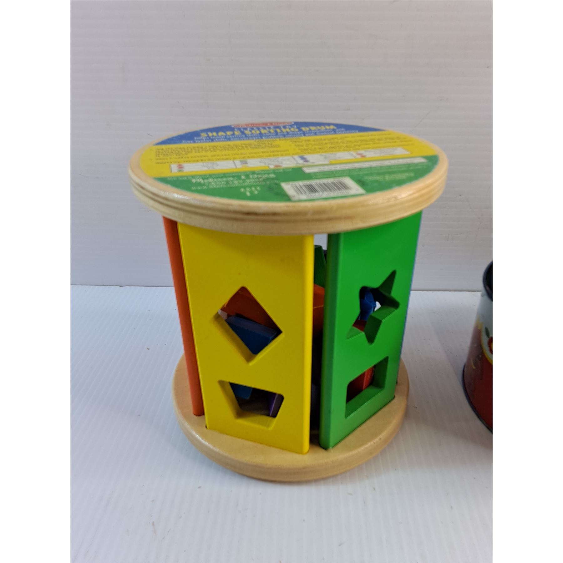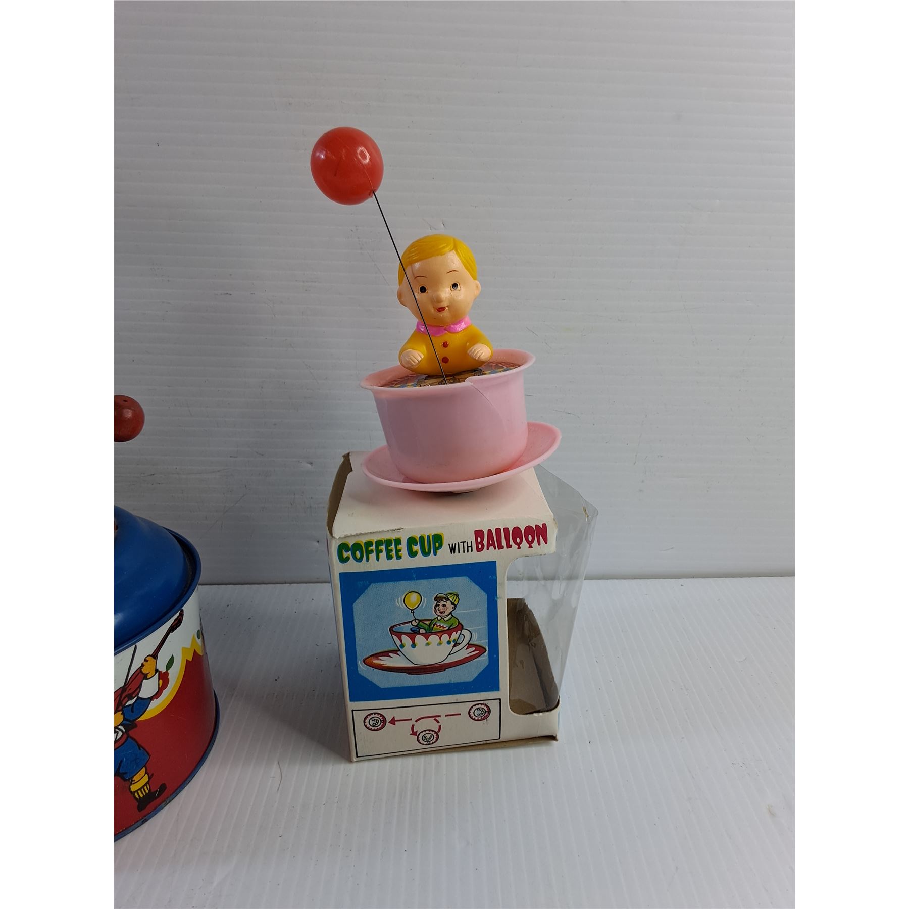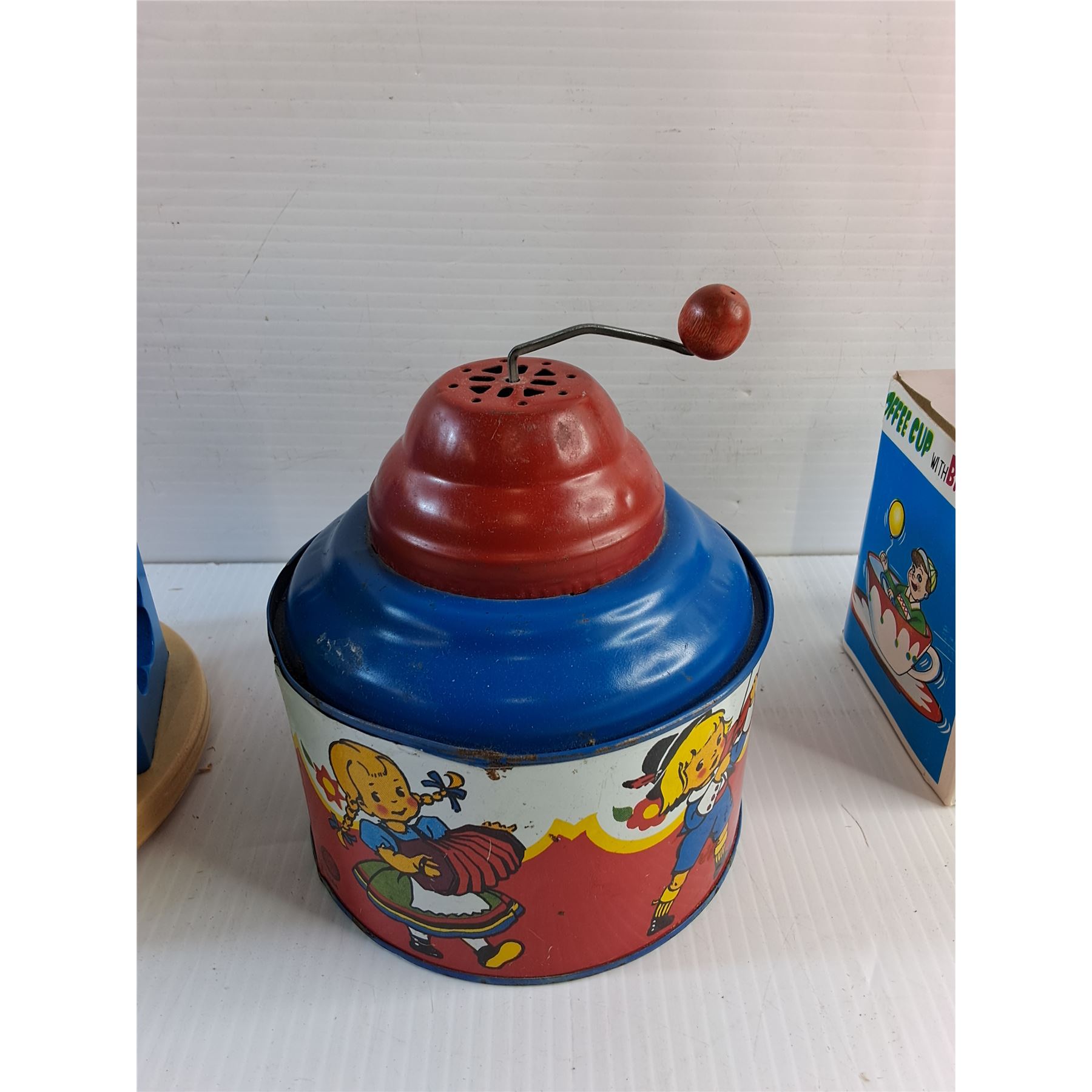 Vintage Shape Sorting Drum, Coffee Cup with Balloon and Musical Tin Box