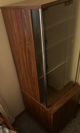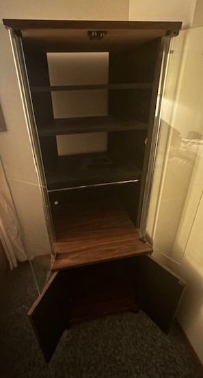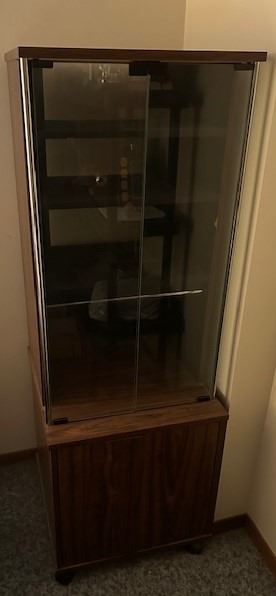 Vintage Stereo Cabinet - Rolling Stereo Cabinet - vertical style; glass and wood doors. All intact and functioning - Measures 59" H x 21" W x 21.5" Deep