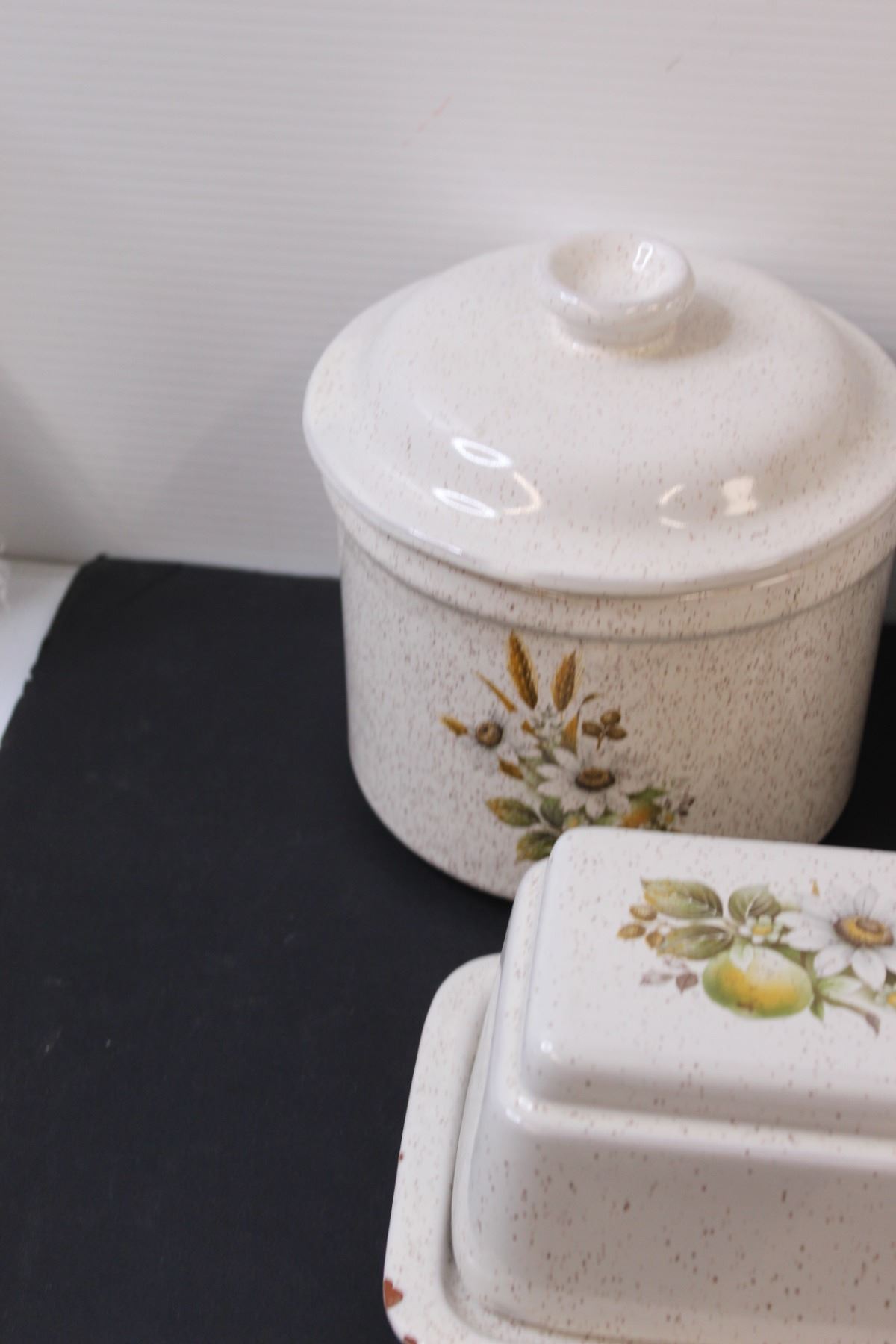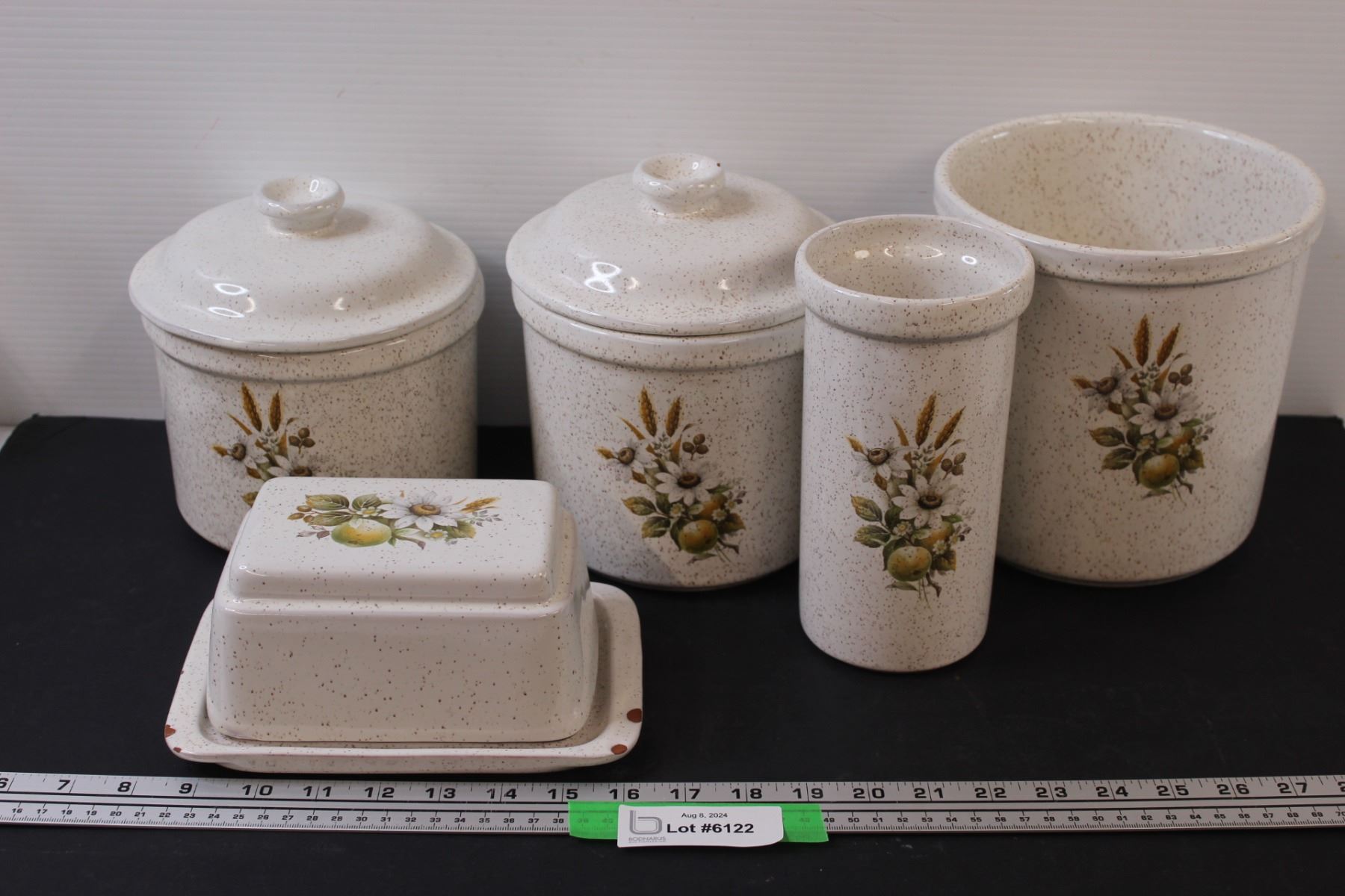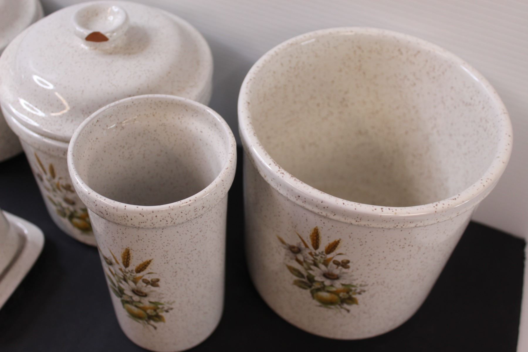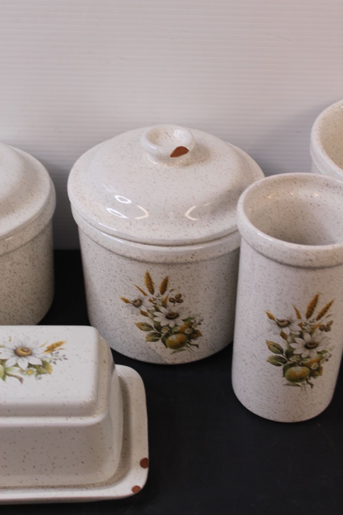 Vintage Stoneware Kitchen Set - (3) Crocks (One Missing Lid, Lid Has Chip, Butter Dish (Has Chips), (1) Kitchen Utensil Holder