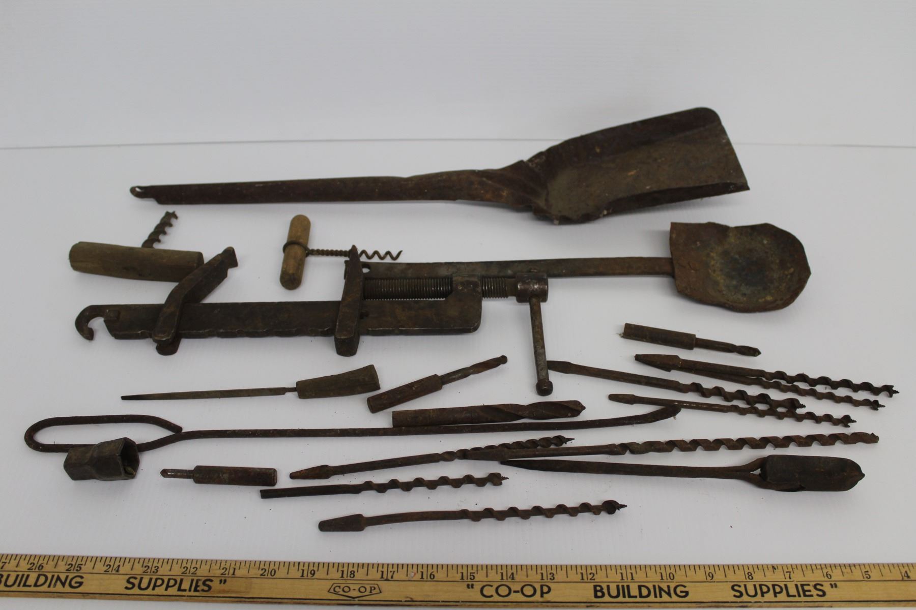 Vintage Tool Lot: Bar Clamp, Drill Bits, Soldering Iron, (2) Stove Shovels, Misc.