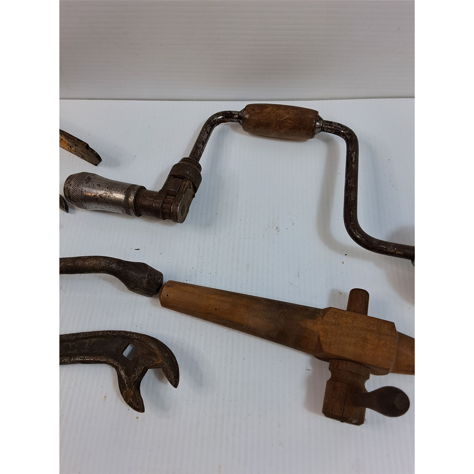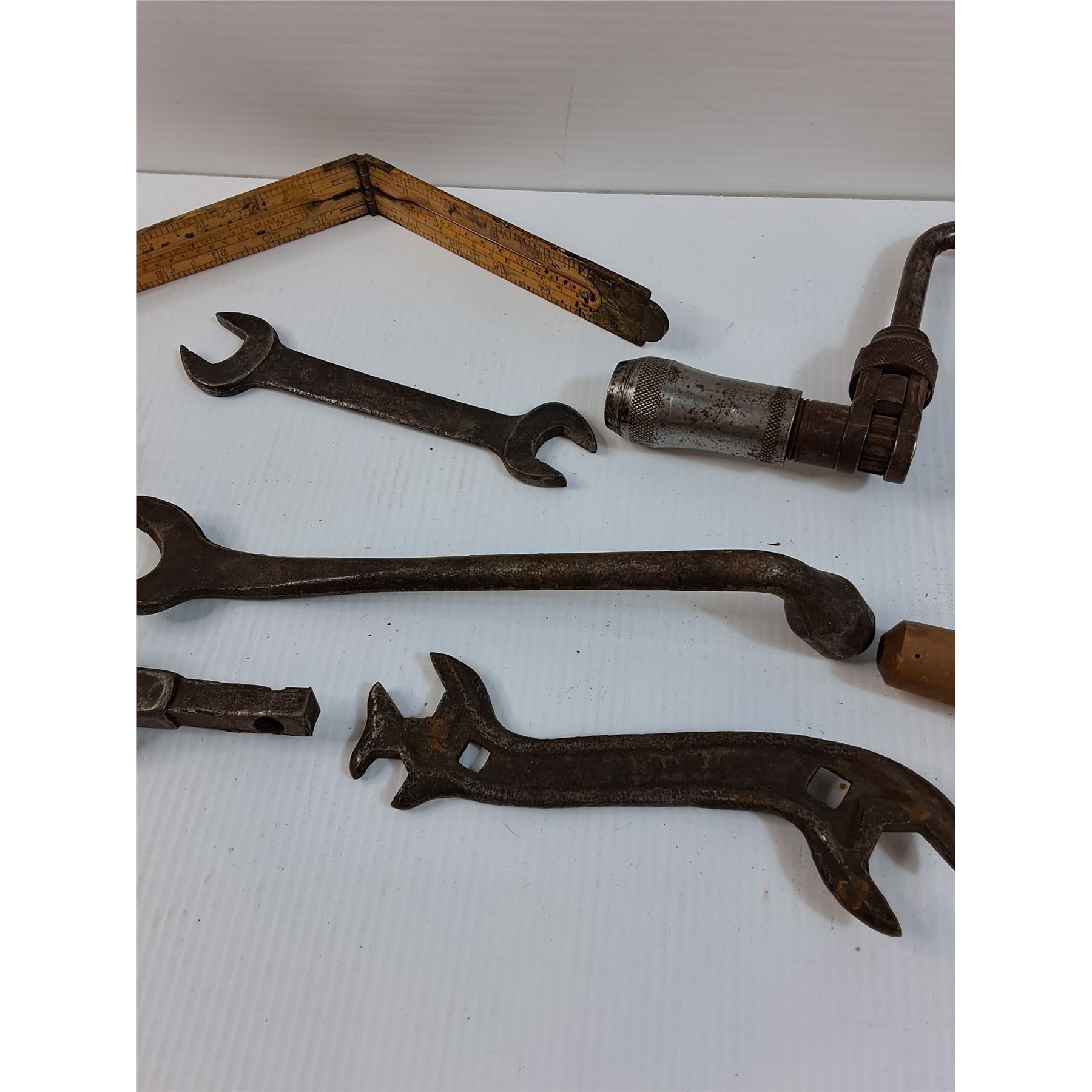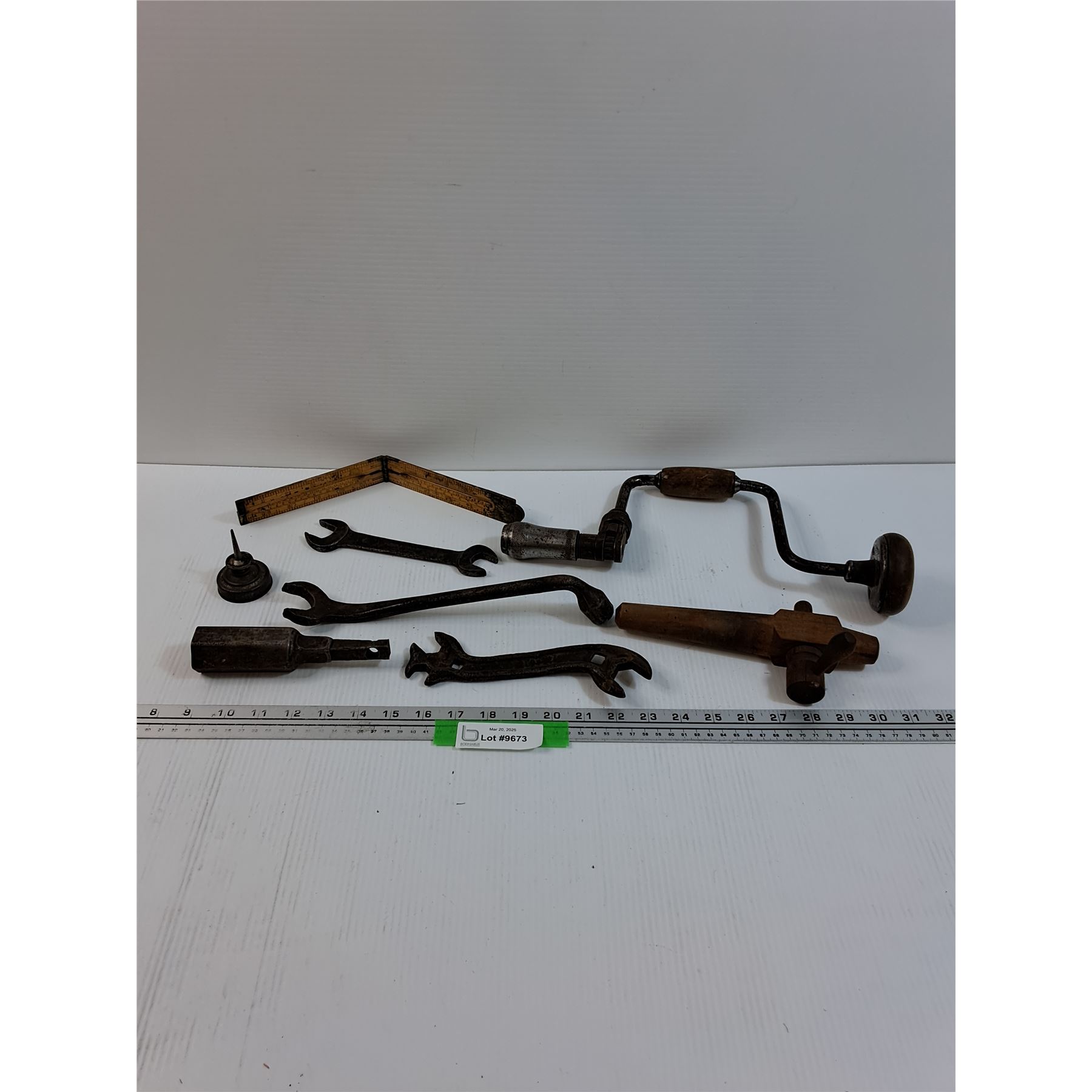 Vintage Tool Lot: Folding Ruler, Hand Drill, Wrenches, Oiler, Tire Socket, Misc
