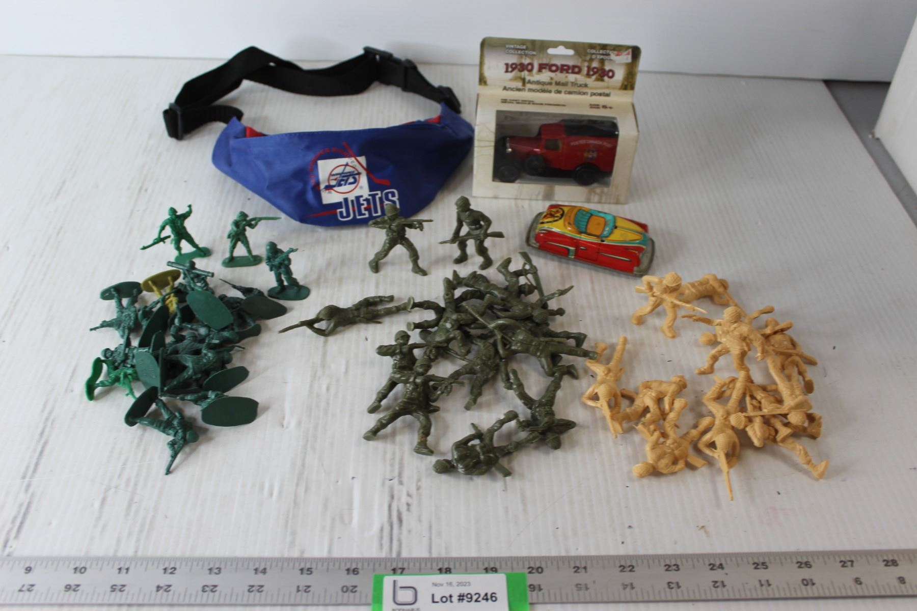 Vintage Toy Tin Car, Die Cast 1930 Ford Antique Mail Truck, Winnipeg Jets Fanny Pack, Plastic Toy Soldiers