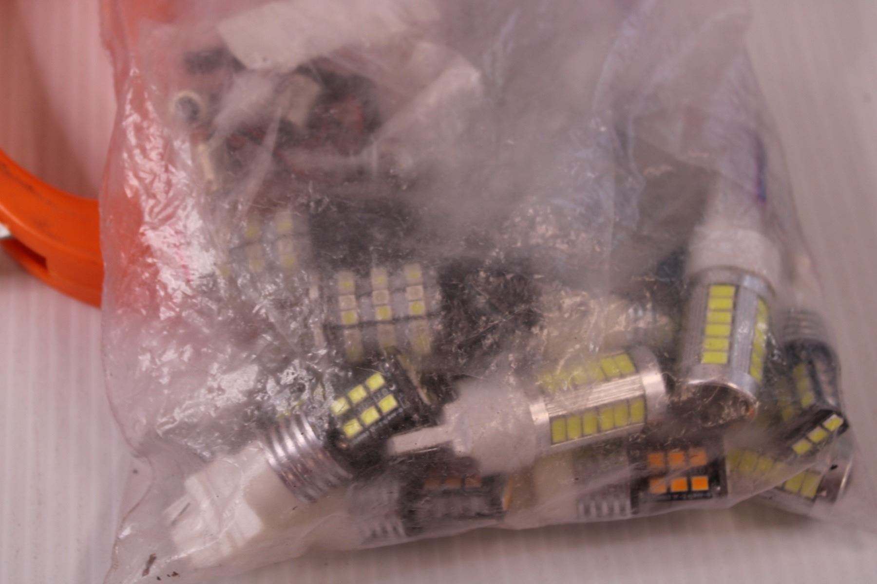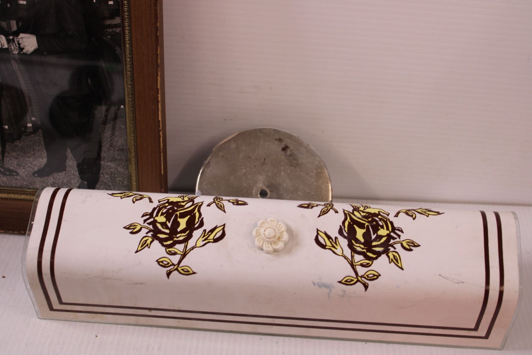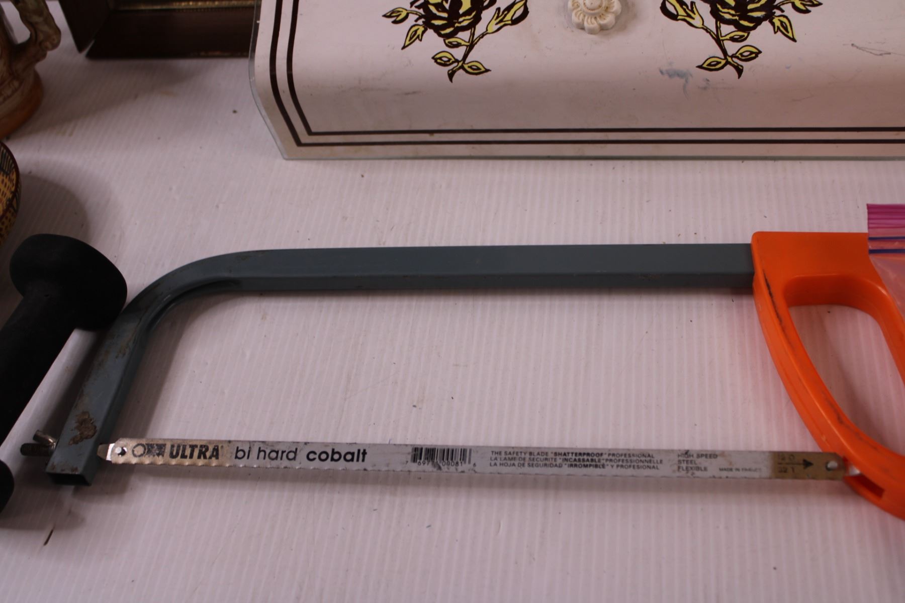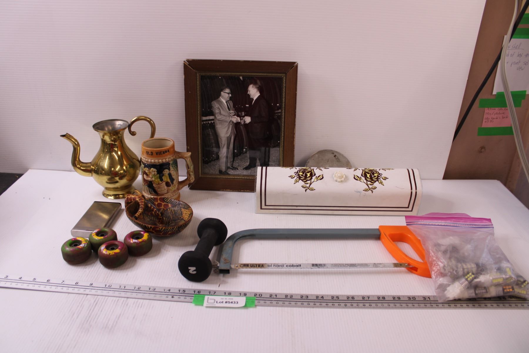 Vintage Wall Mount Light Fixture, Beer Stein, Brass Teapot, Hack Saw, Skateboard Wheels, Various Light Bulbs, Misc