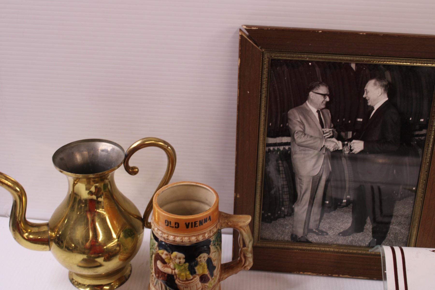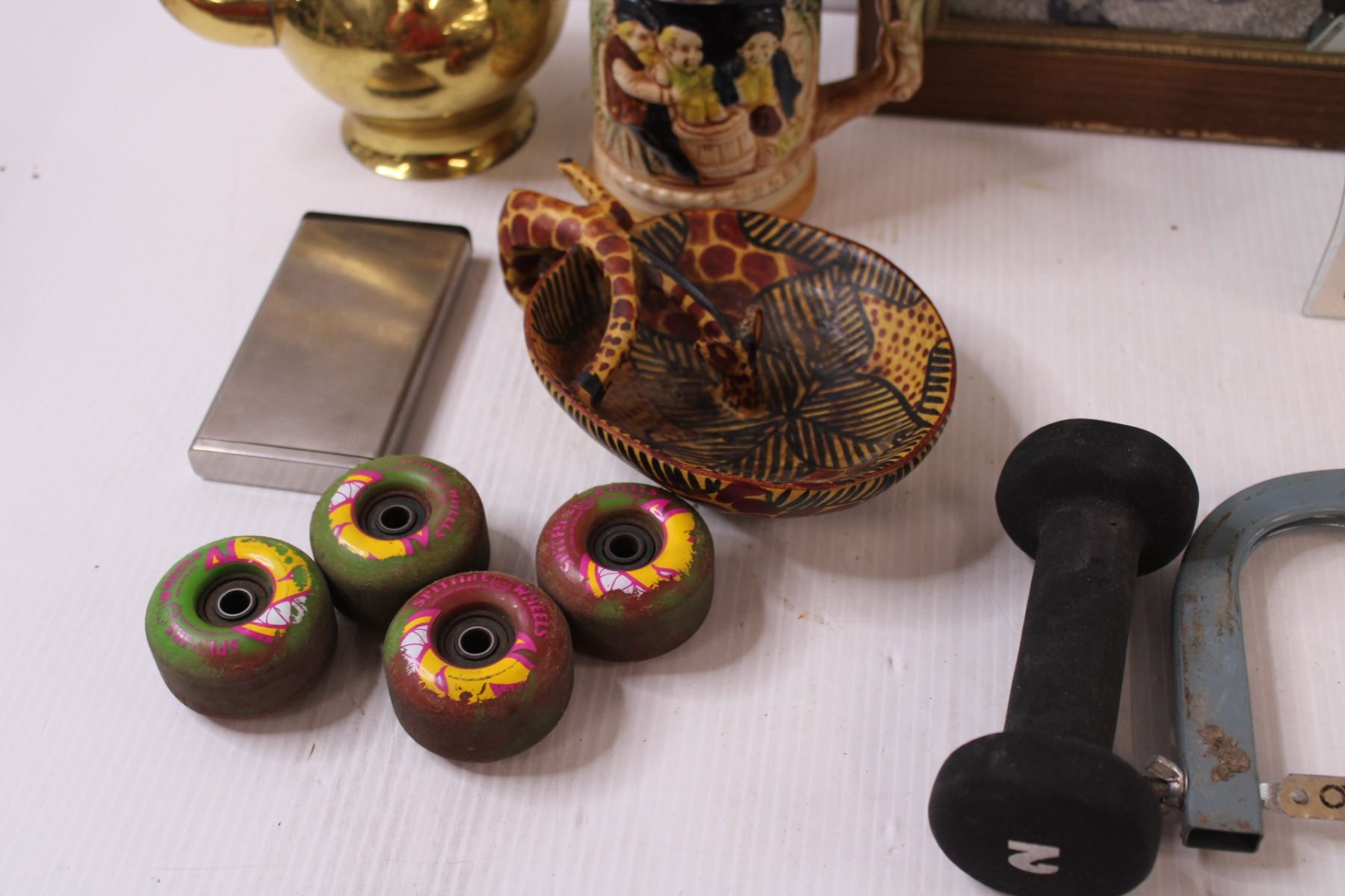 Vintage Wall Mount Light Fixture, Beer Stein, Brass Teapot, Hack Saw, Skateboard Wheels, Various Lig