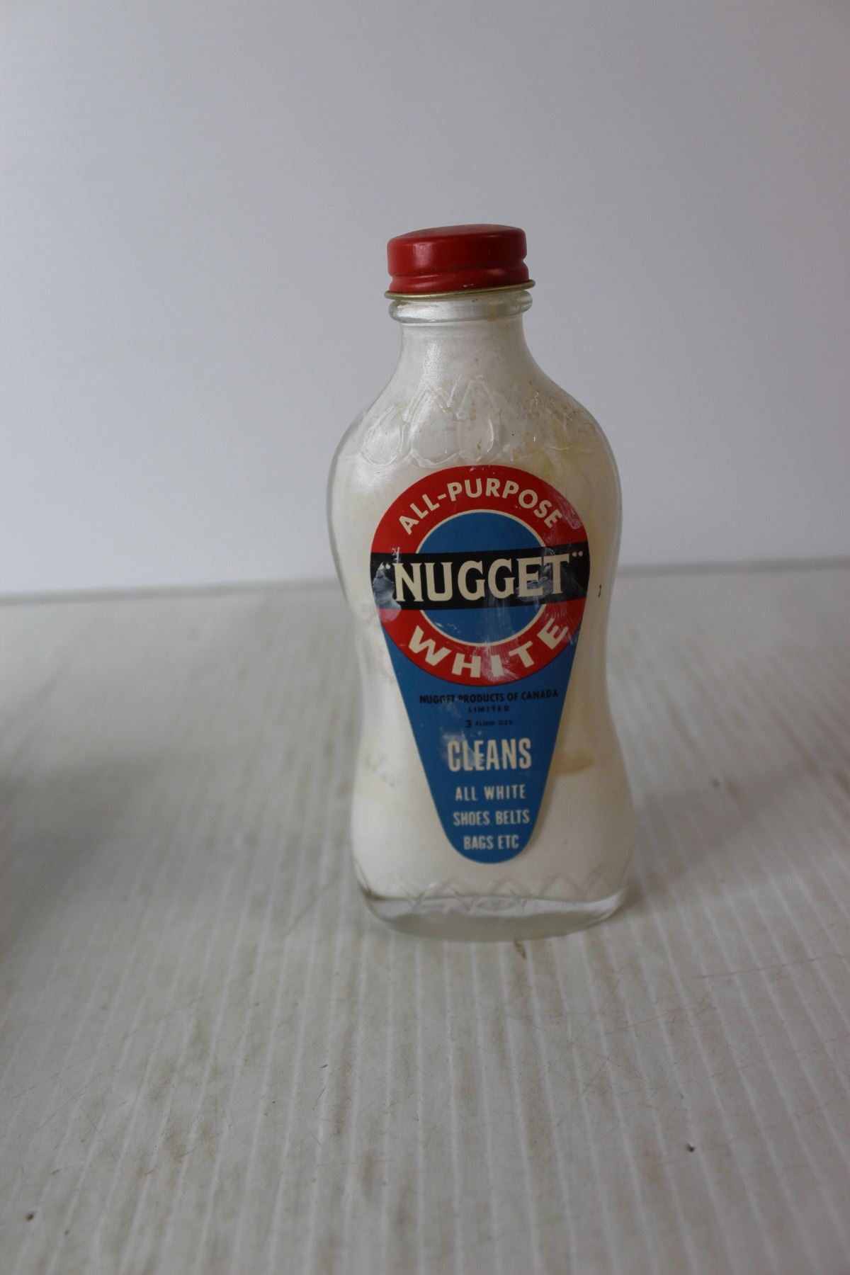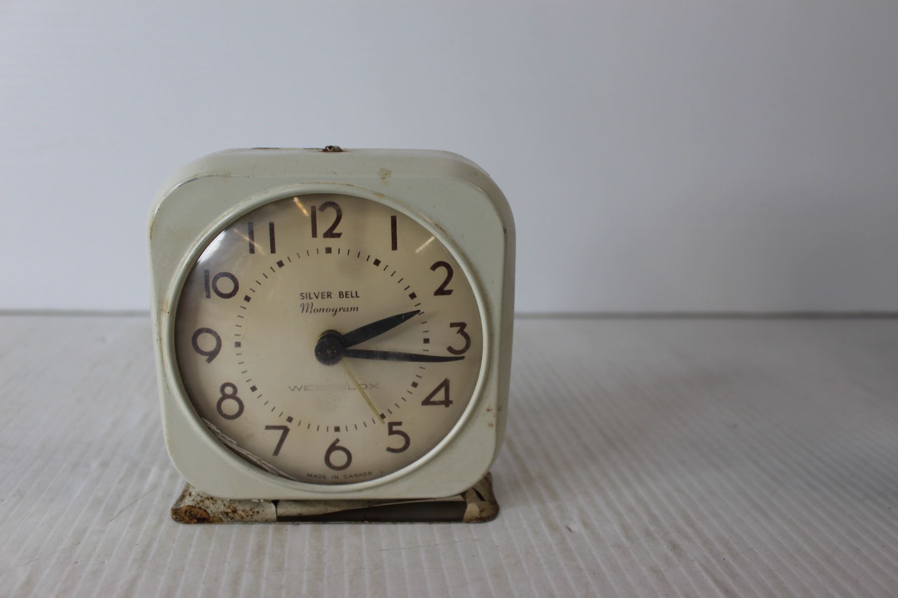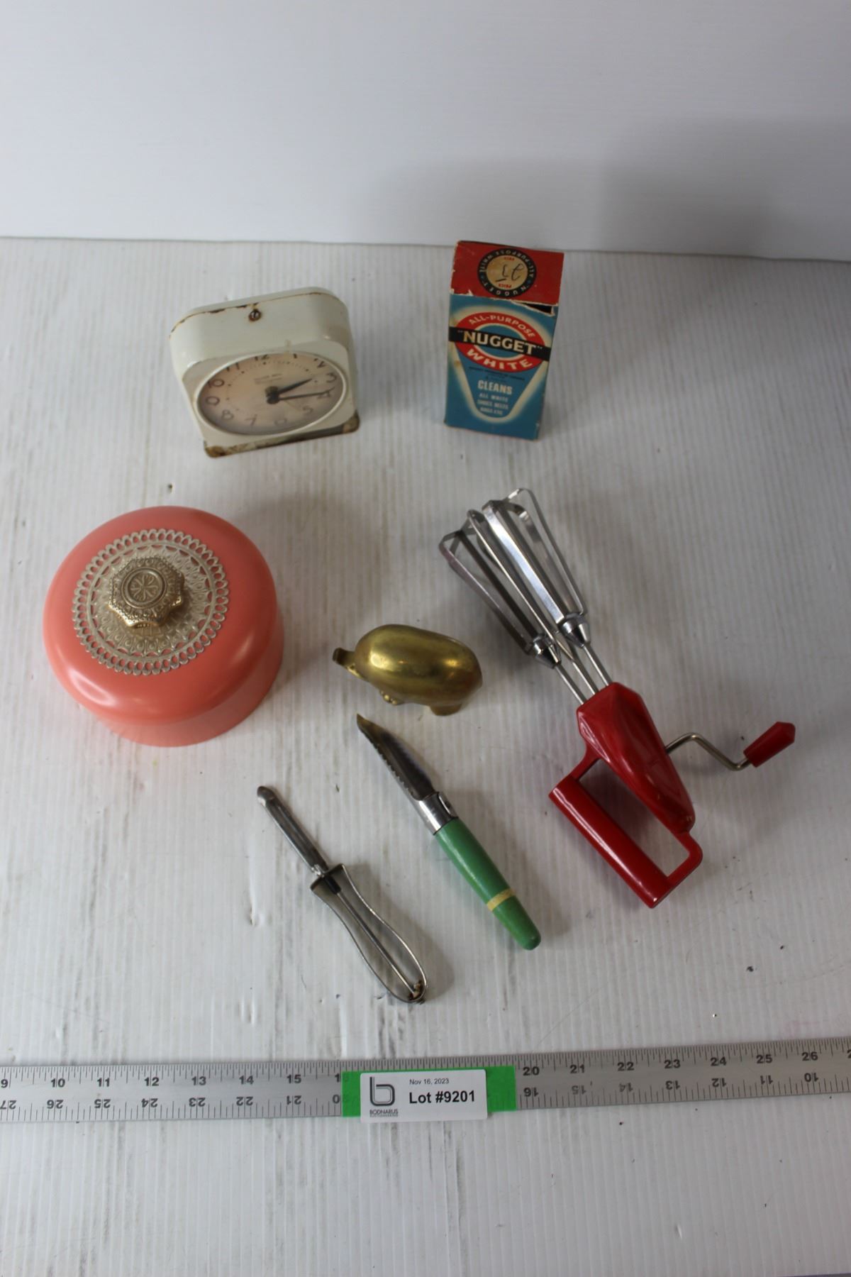 Vintage Westclox Silver Bell Alarm Clock, Avon Beauty Dust Covered Dish, "Nugget" White Cleaner Bottle & Box, Brass Elephant, Hand Mixer, Kitchen Utensils