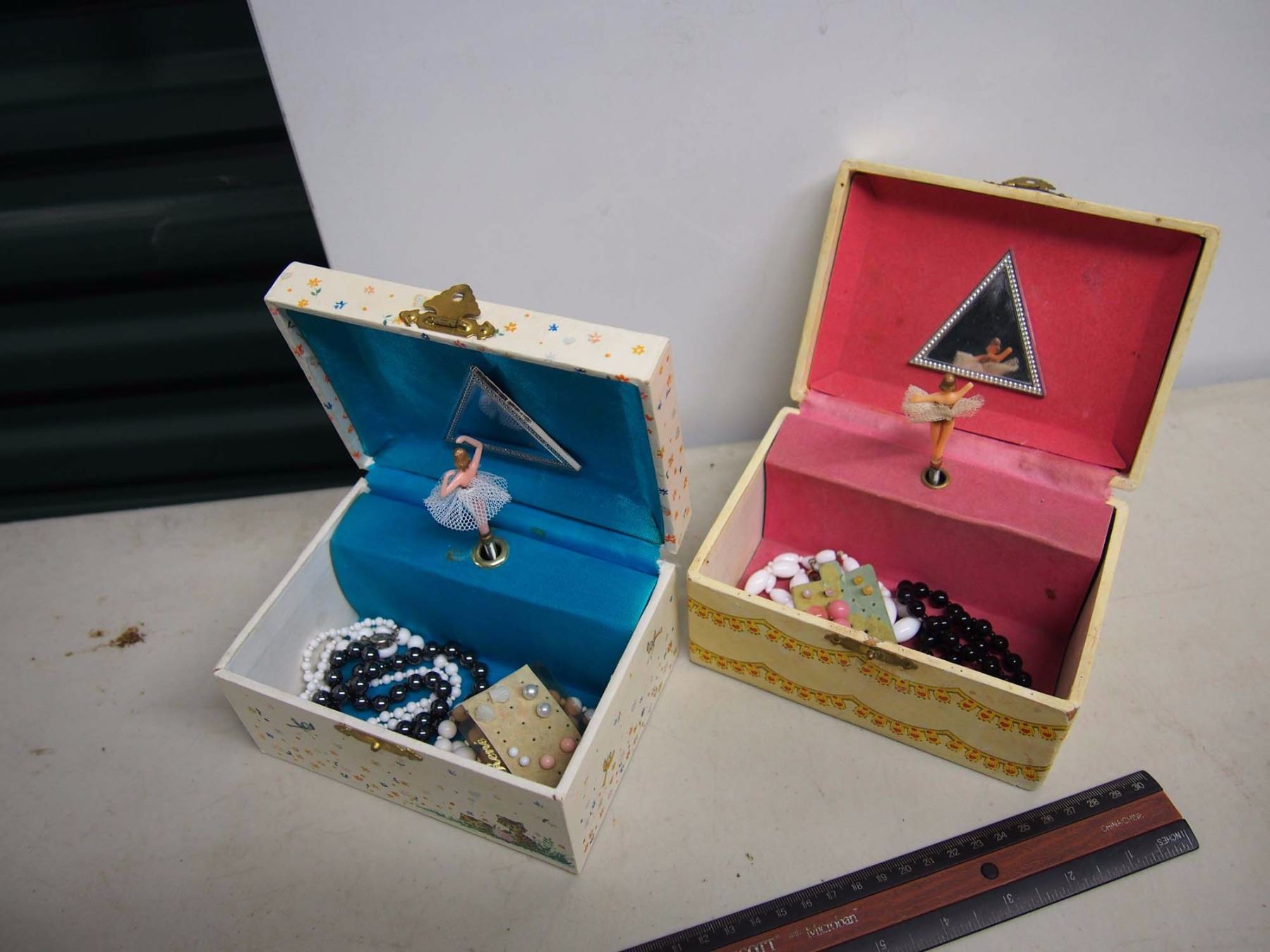 Vintage Windup Childrens Jewelry Boxes, (2) W/ Contents, Beads, Earrings