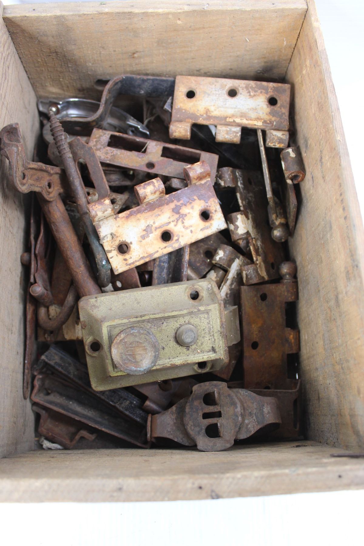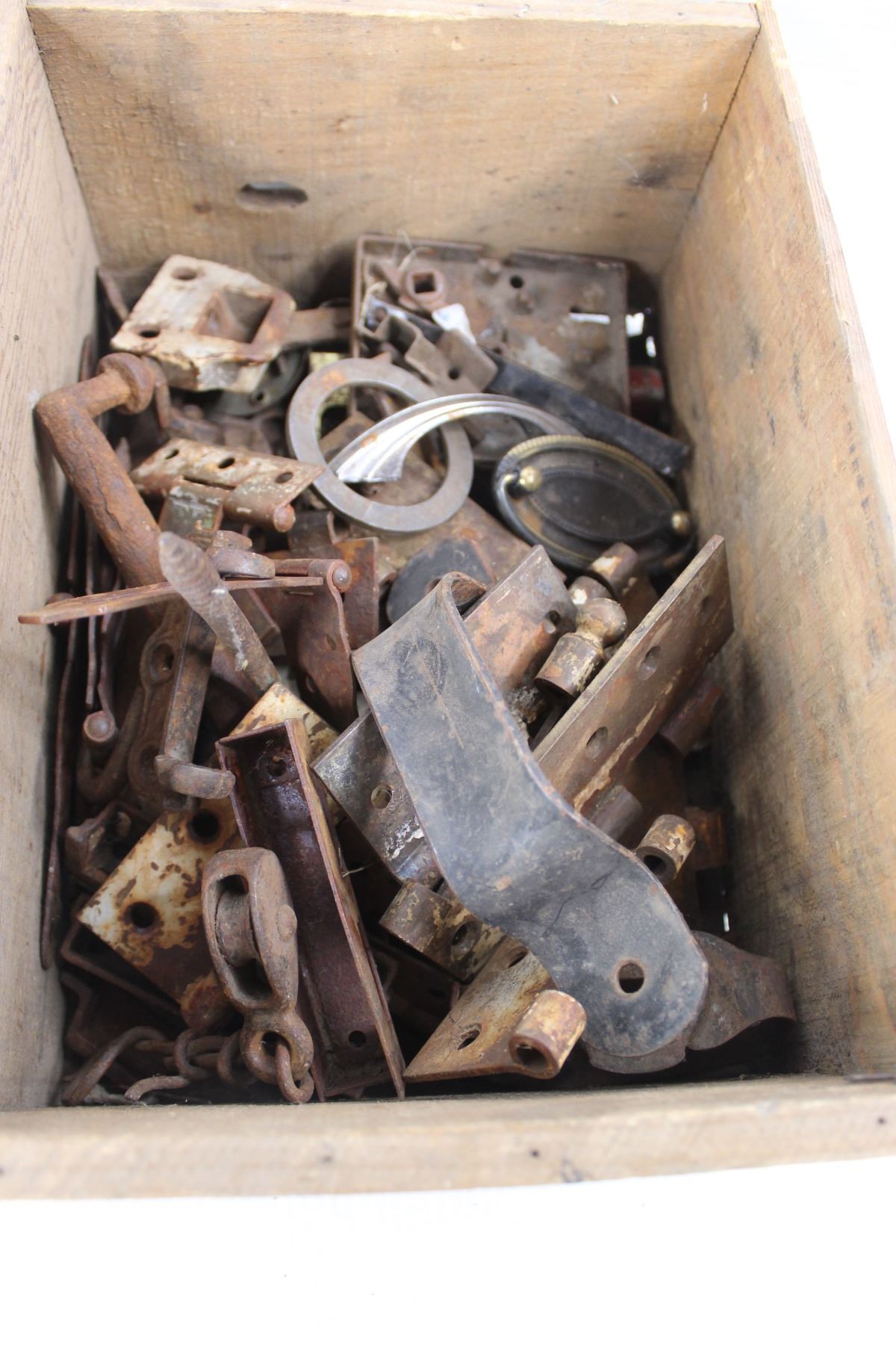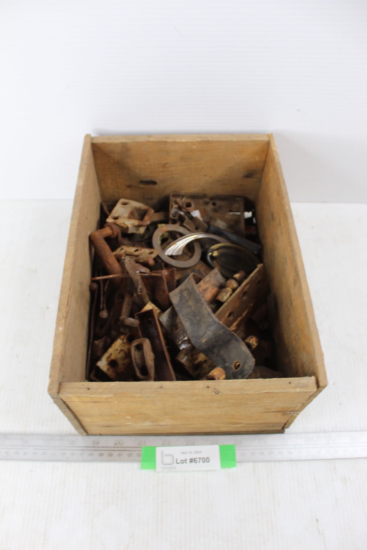 Vintage Wooden Box Full Of Various Vintage Furniture Hinges/ Drawer Knobs