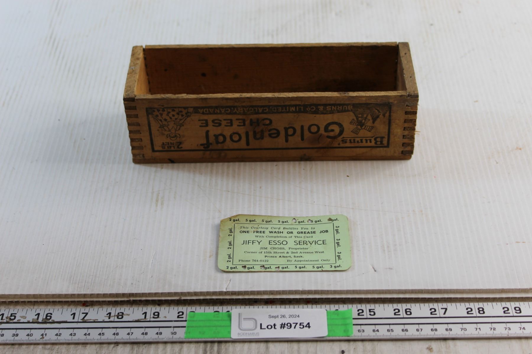 Vintage Wooden Burn's Goldenloaf Cheese Crate and Vintage Jiffy Esso Courtesy Card