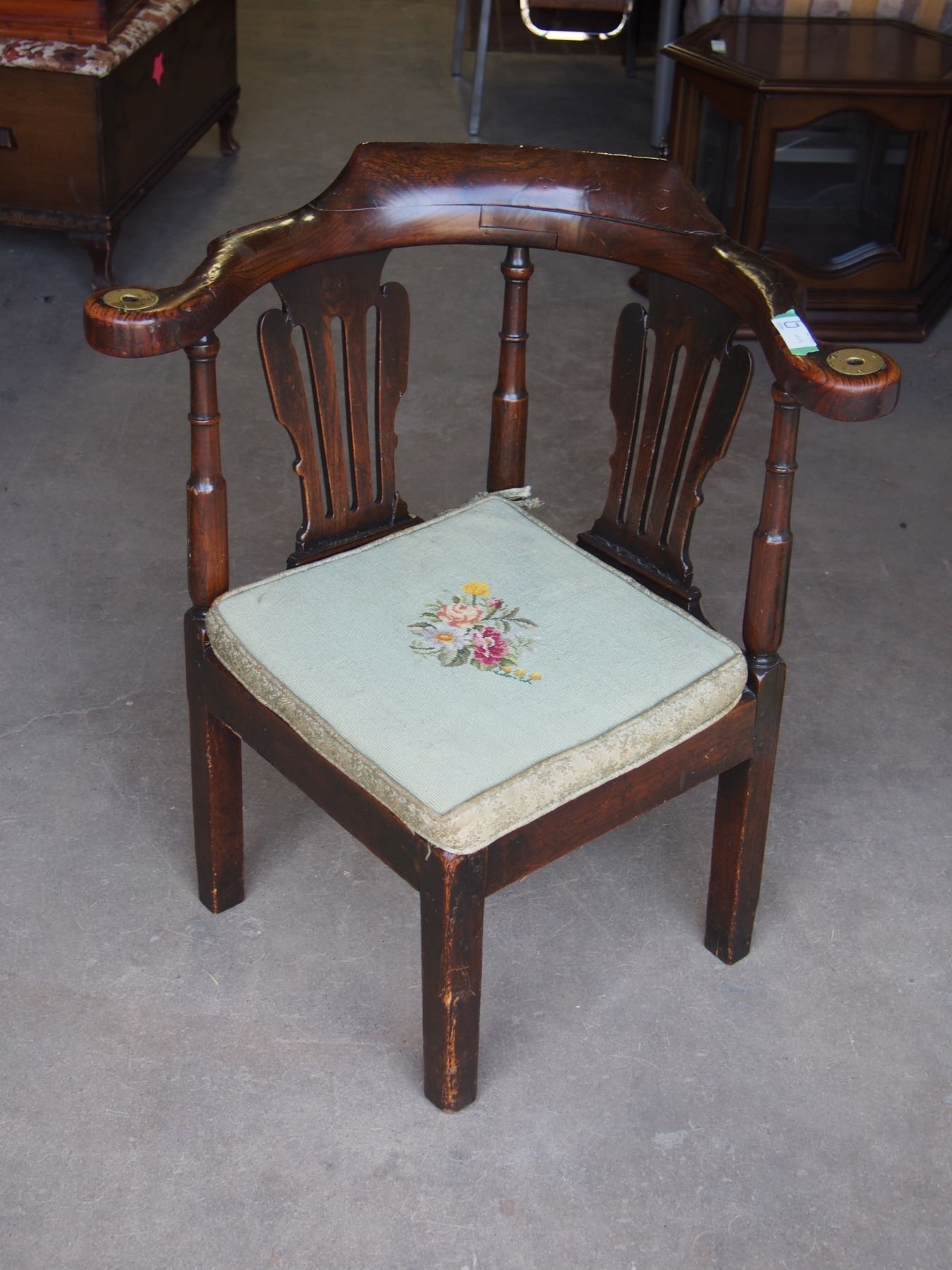 Vintage Wooden Corner Chair with Brass Arm Inserts 29" W by 32" T