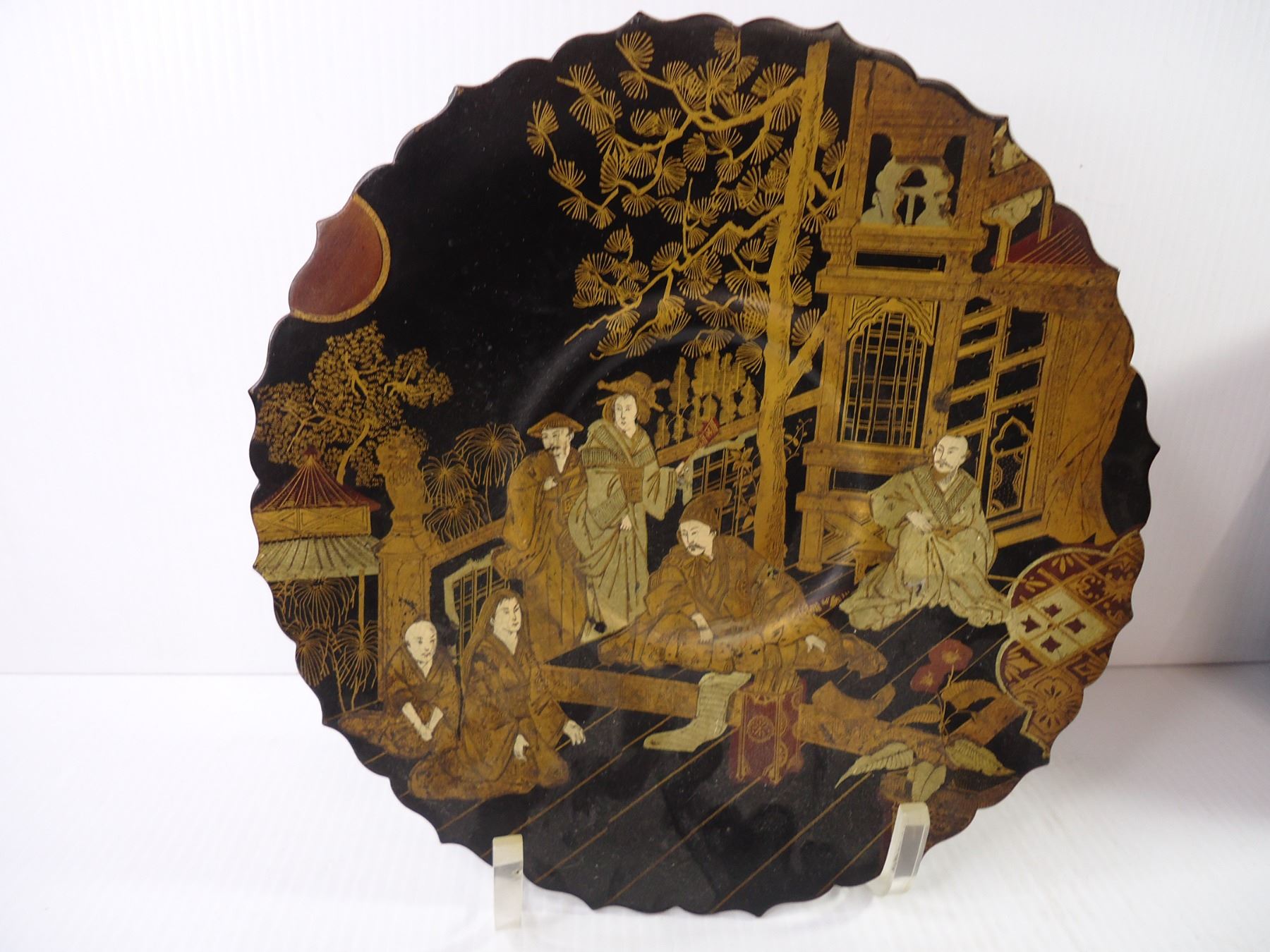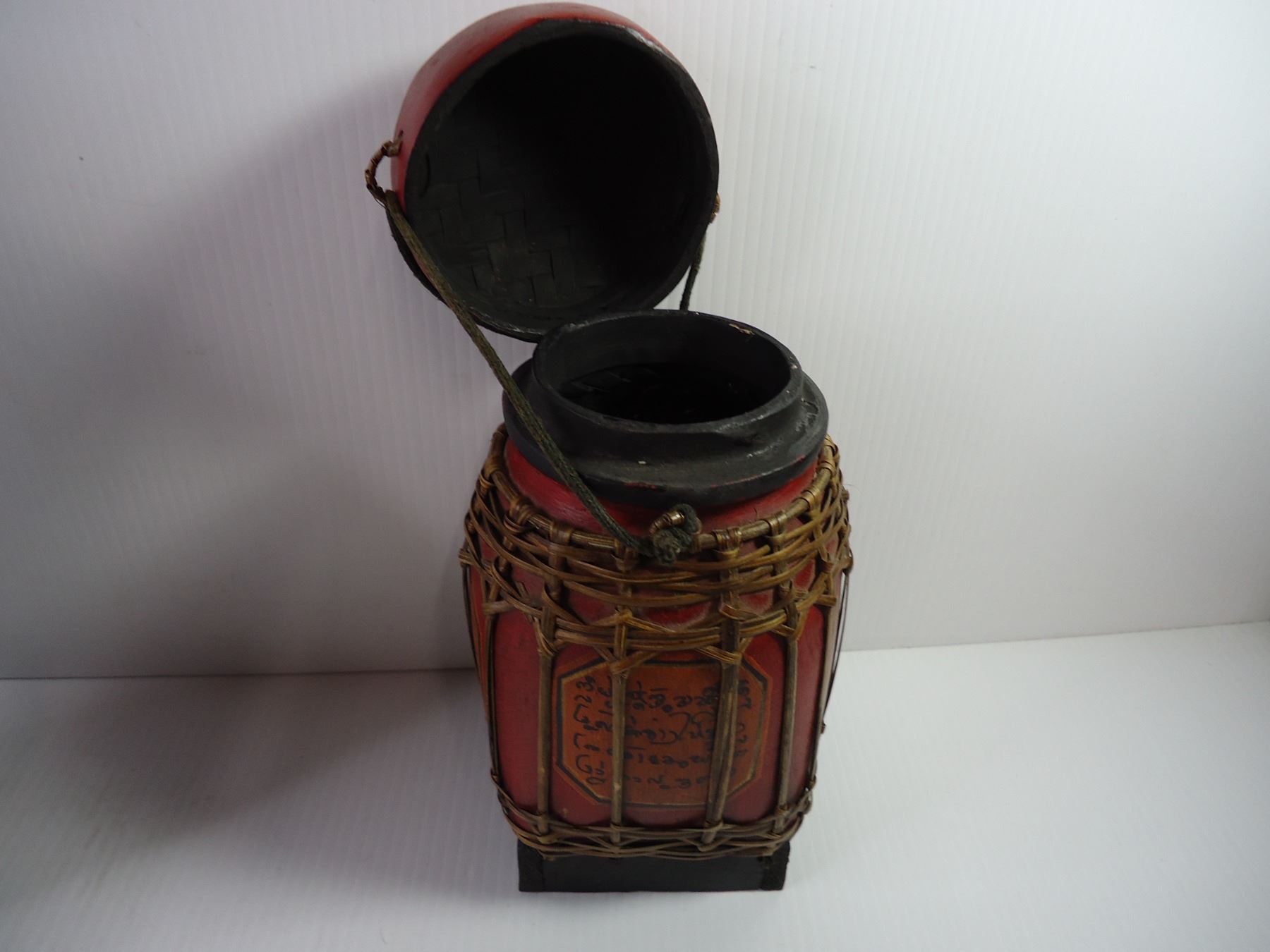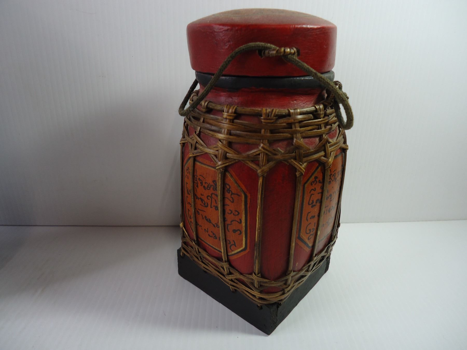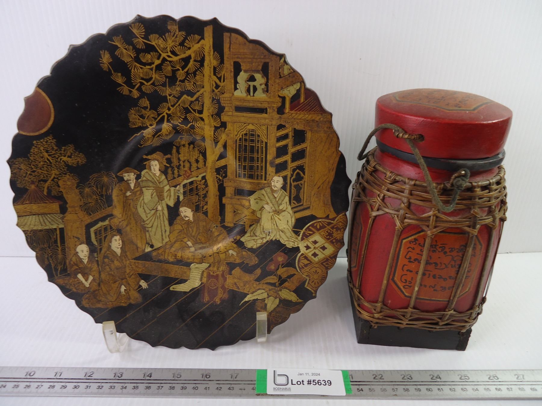 Vintage Woven Bamboo Canister and Lacquered Hand Painted Plate