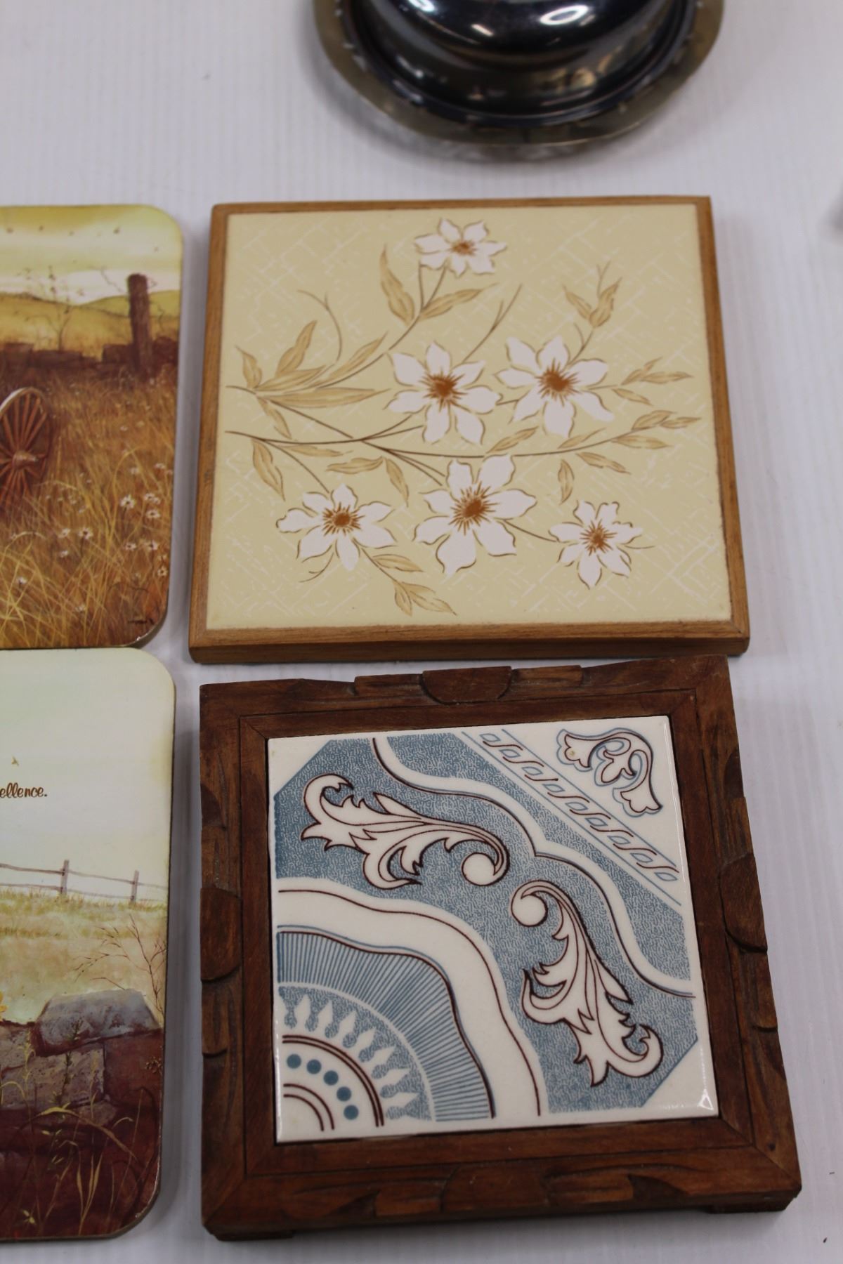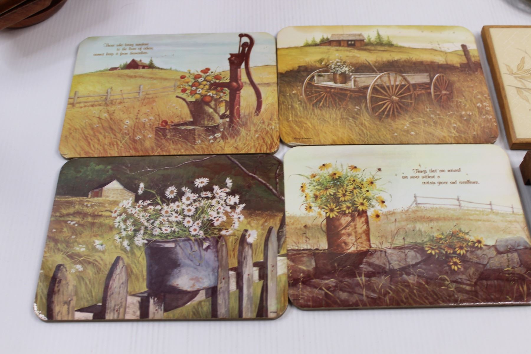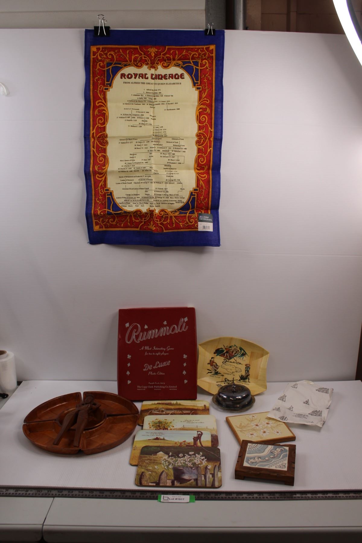Vintage Woven Wooden Serving Trays w/Saucer, Wooden "Lolita" Nut Cracker, 1940 Rummoli Game, Jamaica Wooden Souvenir Platter, (6) Pot Holders, Butter Dish (Silver Plated Cover) & Royal Lineage Linen Tea Towel