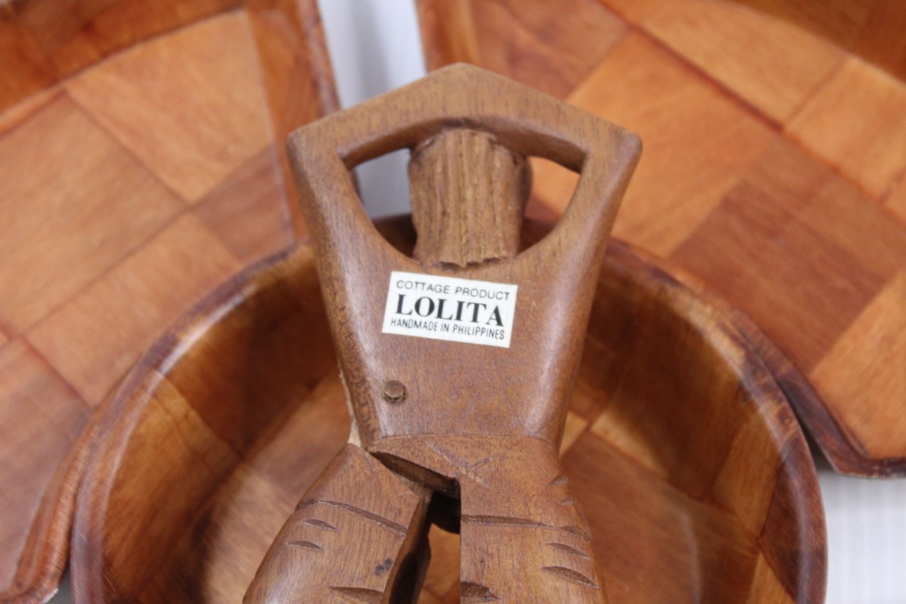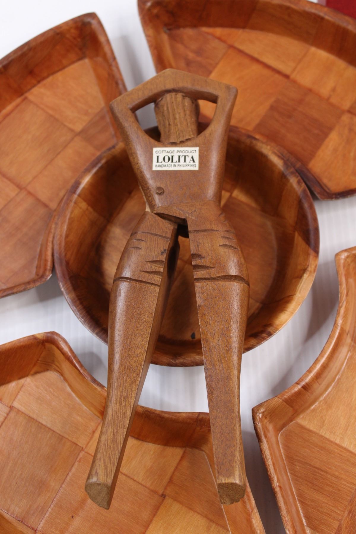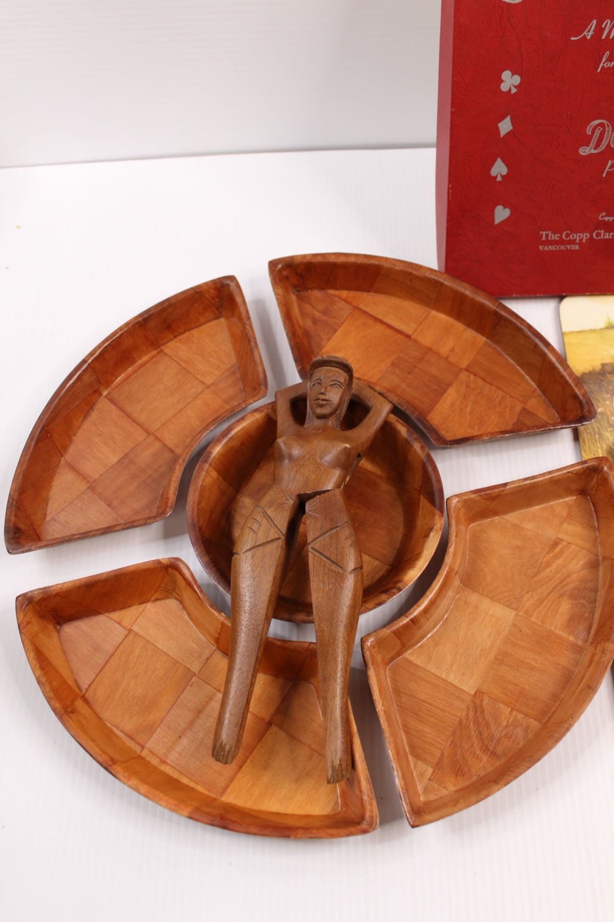 Vintage Woven Wooden Serving Trays w/Saucer, Wooden "Lolita" Nut Cracker, 1940 Rummoli Game, Jamaica