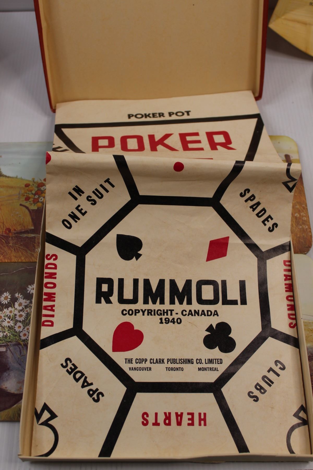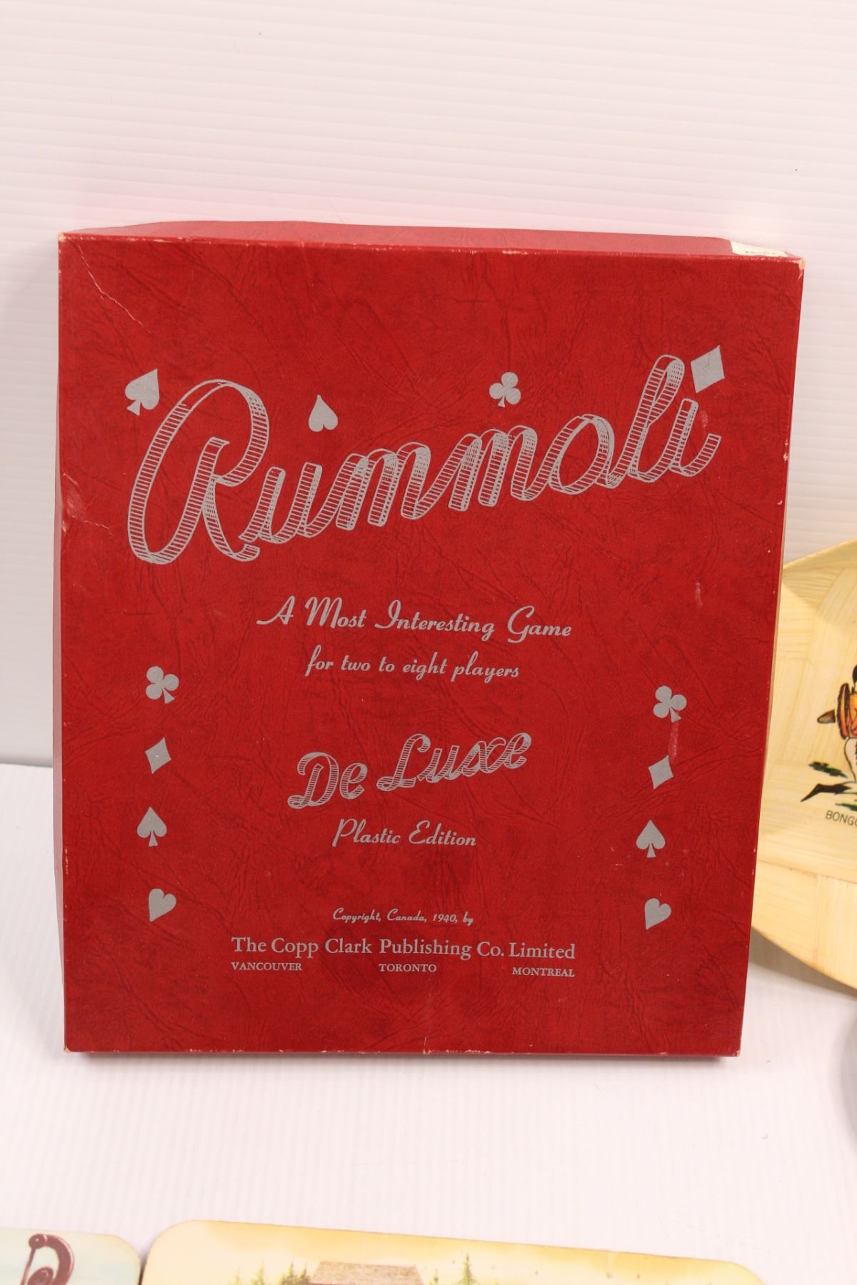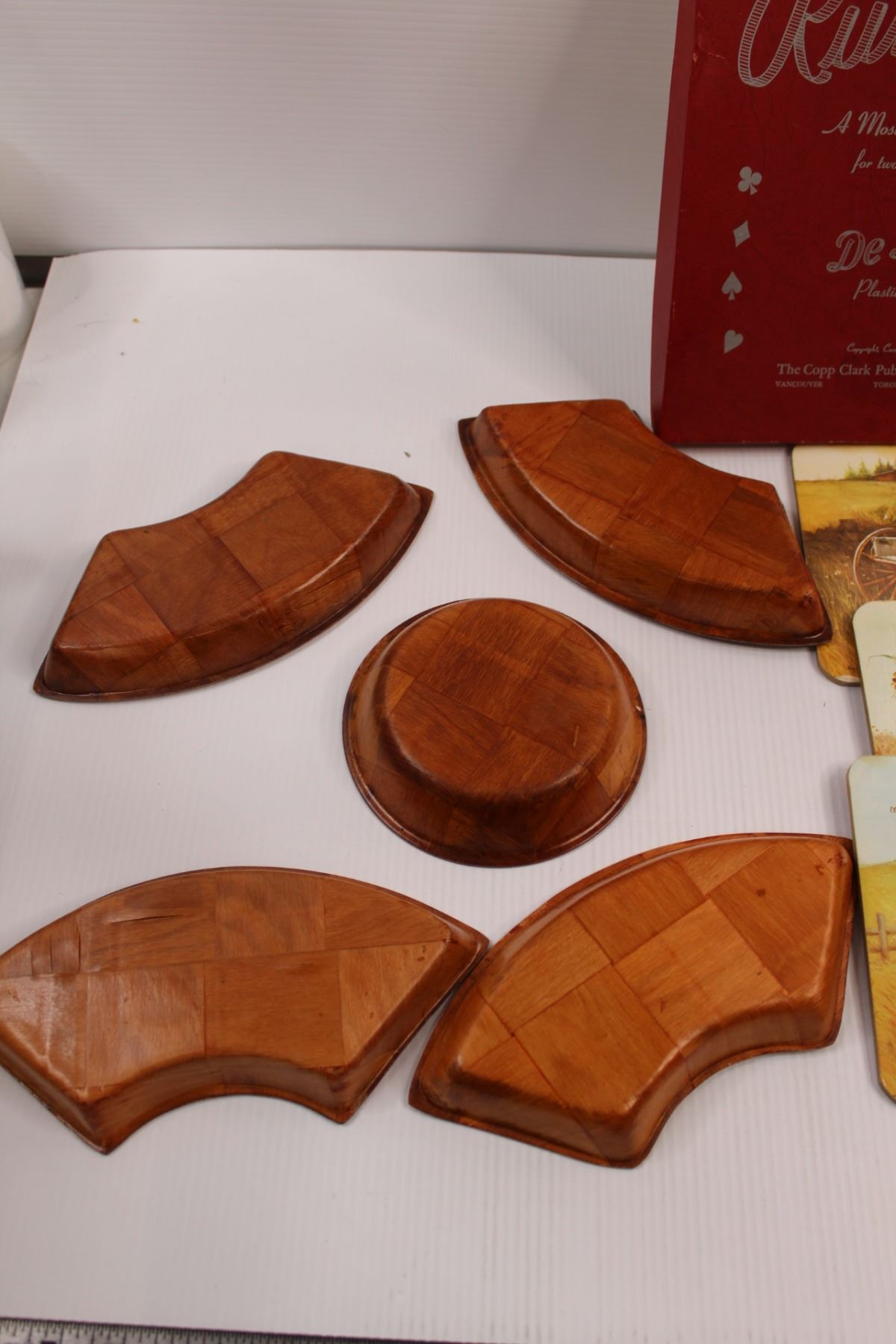 Vintage Woven Wooden Serving Trays w/Saucer, Wooden "Lolita" Nut Cracker, 1940 Rummoli Game, Jamaica