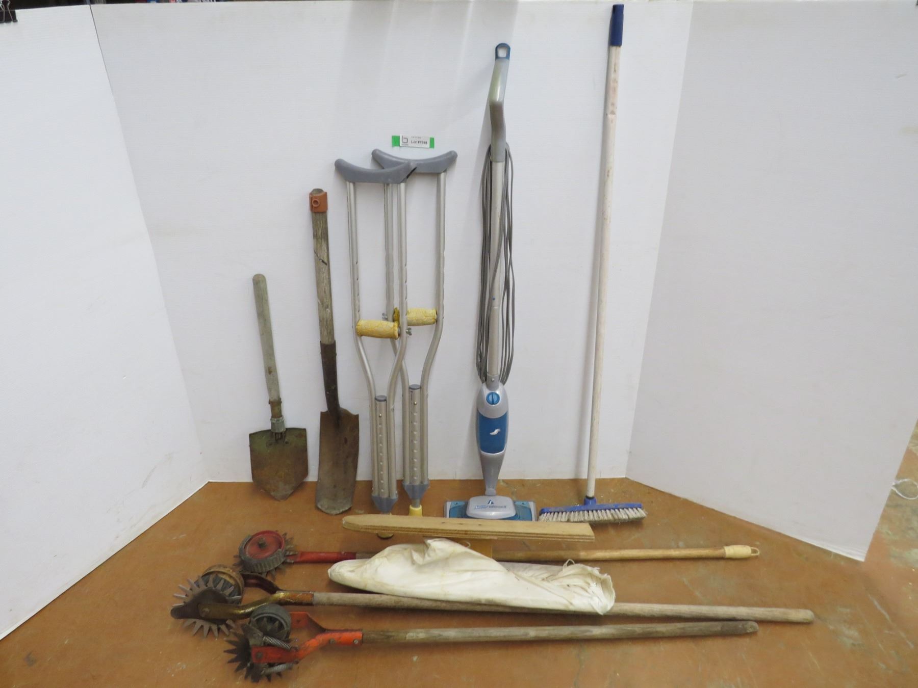 Vintage Yard Tools - Ironing Board - Crutches - Broom - Floor Sweeper