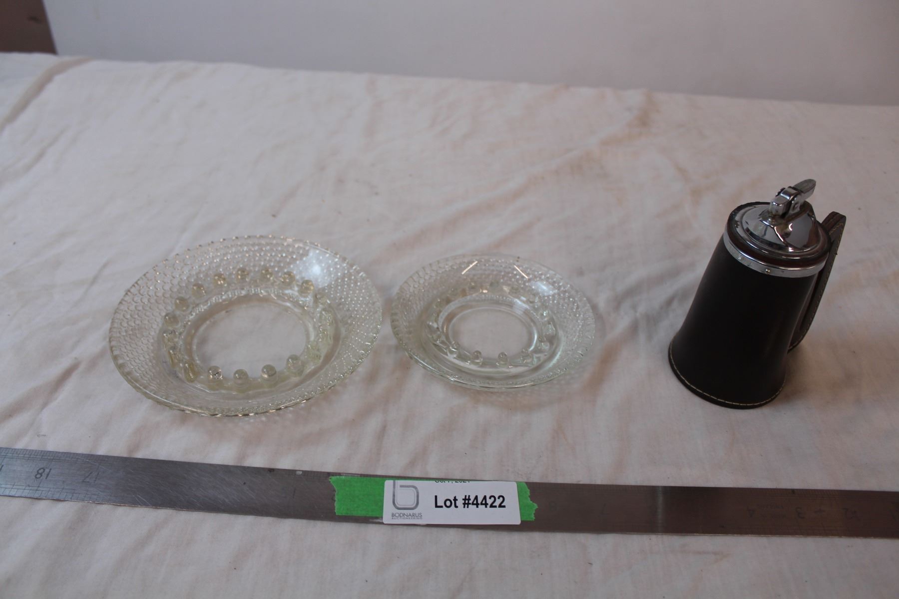 Vintage glass ashtrays + lighter holder with dice (leather?)