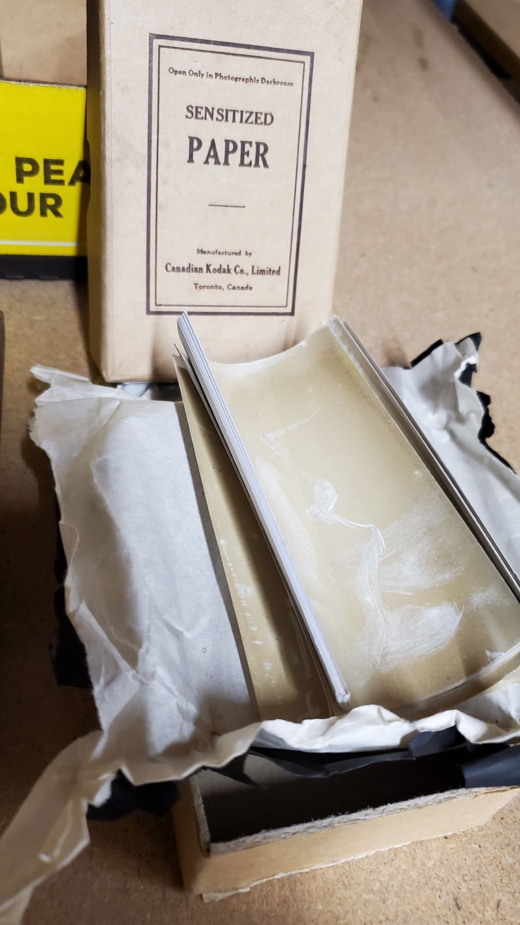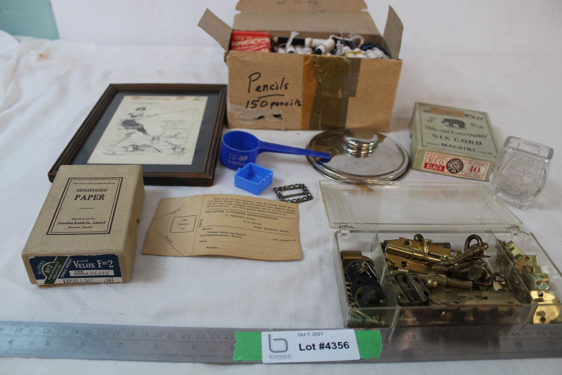 Vintage lot - Box of Shortpencils + Thumb Tacks, Jim Bean Horseshoe shotglass, 1941 sensitized paper, old photo