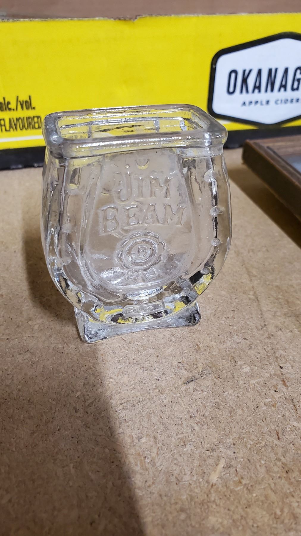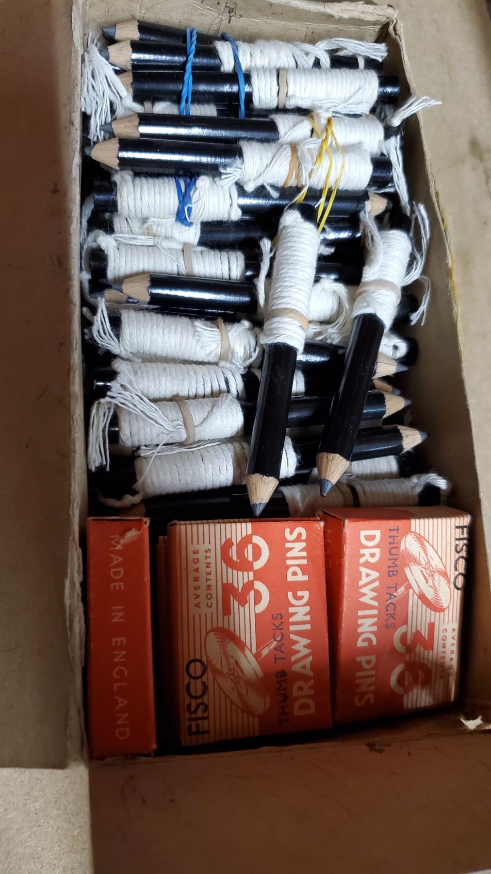 Vintage lot - Box of Shortpencils + Thumb Tacks, Jim Bean Horseshoe shotglass, 1941 sensitized paper