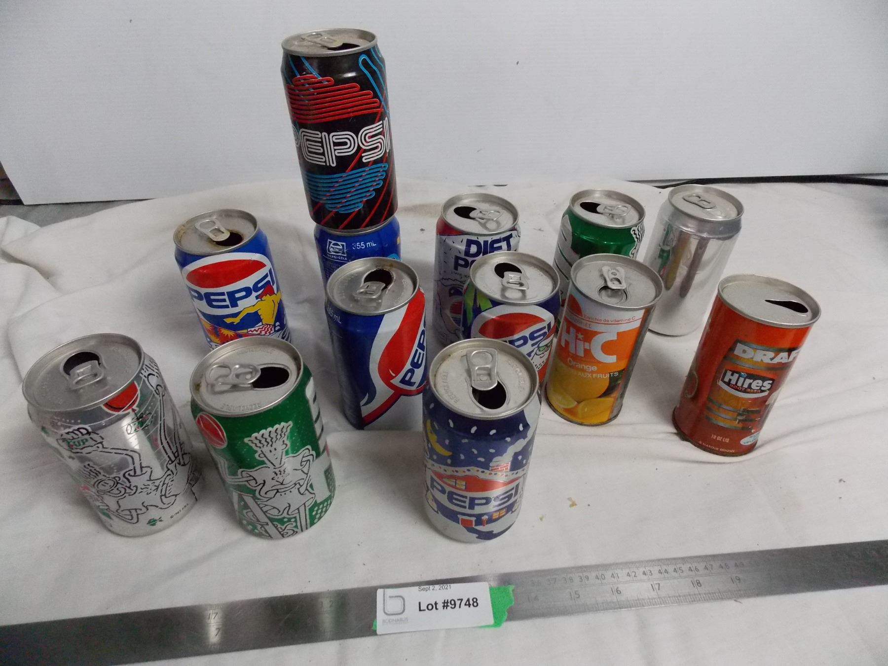 Vintage pop cans - hires, 7-up (fido dido), pepsi (sex can) etc