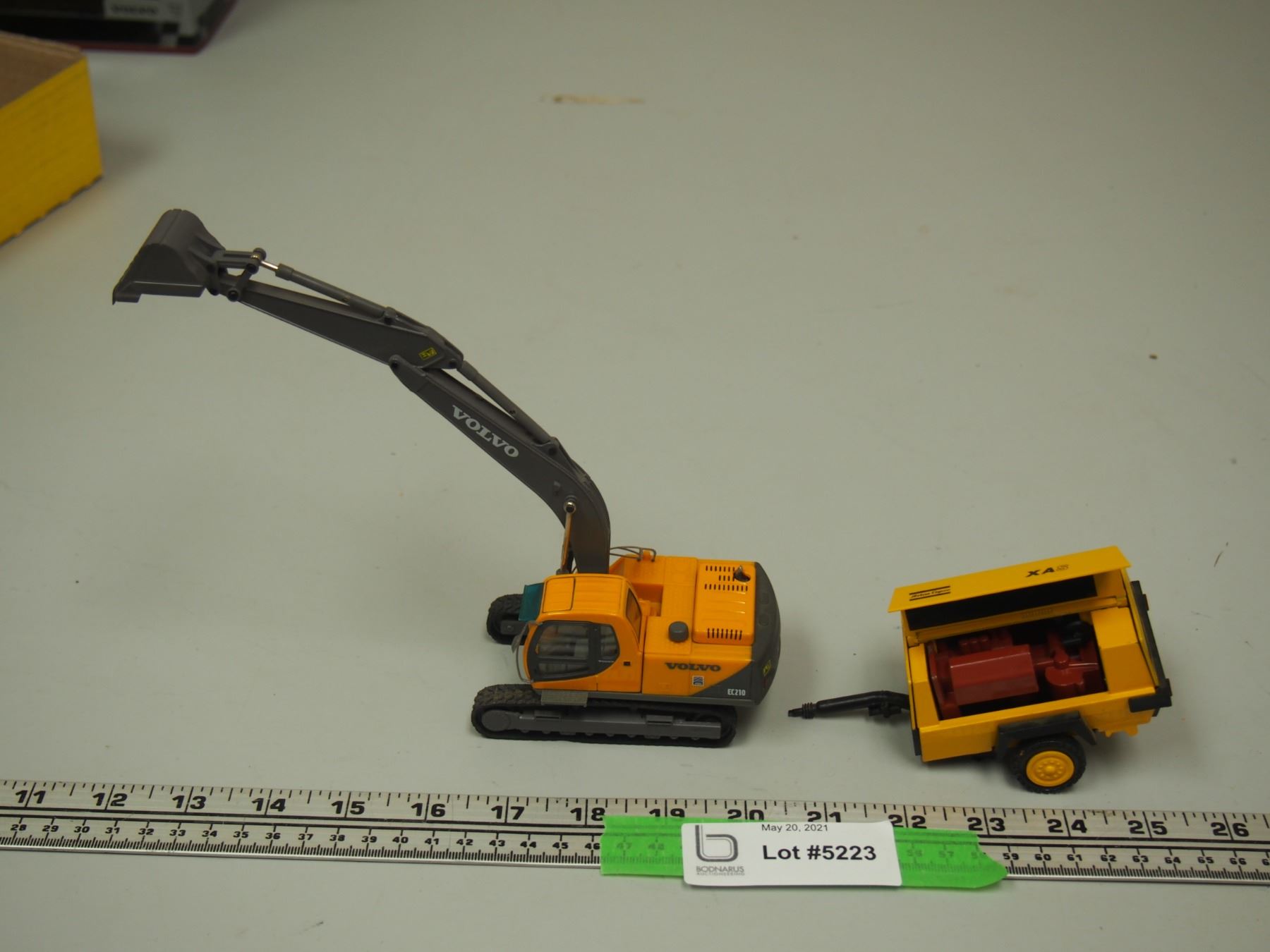 Volvo EC210 Excavator 1/50 Scale? Extended is 9" long, plus Atlas Copco Generator Compressor (5" L) N2G Made in W. Germany (Looks like Hitch and Jack are Broken Off)