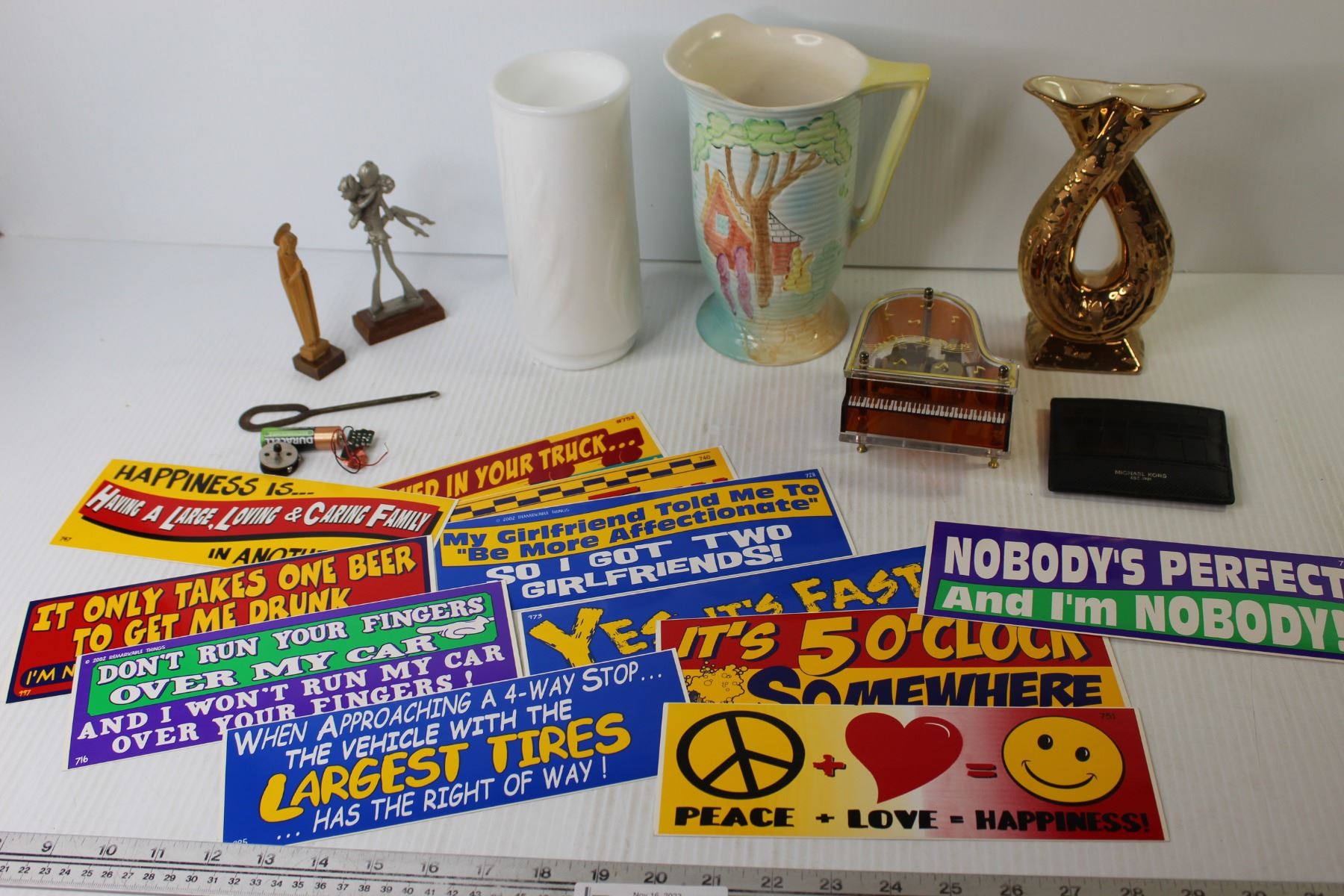 Vulcan Ceramic Pitcher - Milk Glass Vase - Ceramic Vase - Music Box Piano - Vintage Bumper Stickers - Misc. Items