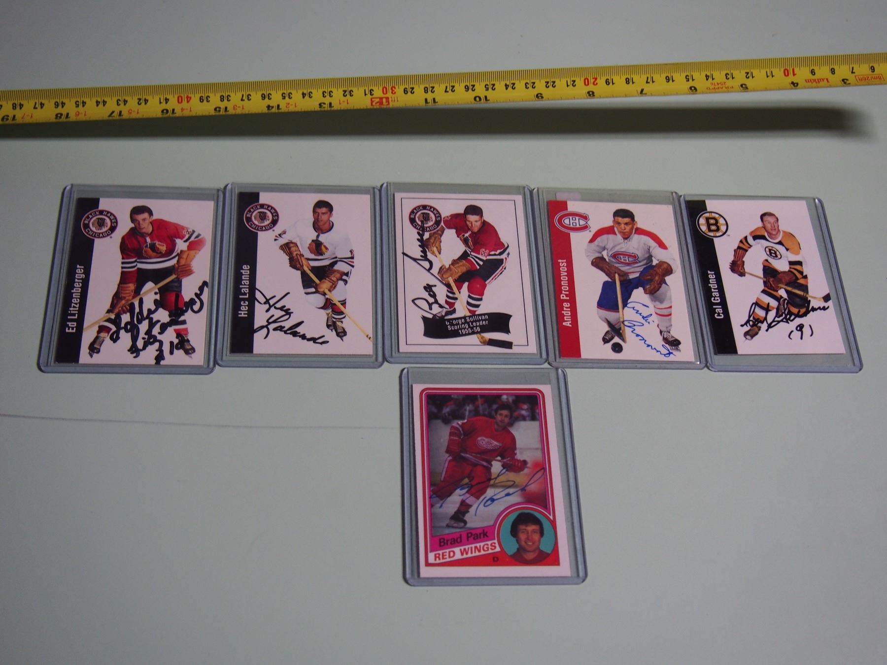 Lot Of Signed Parkhurst Hockey Cards (5) (George Sullivan, Andre Pronovost, Cal Gardner, Hec Lalande, Ed Litzenberger) W/ Opeechee Signed Brad Park