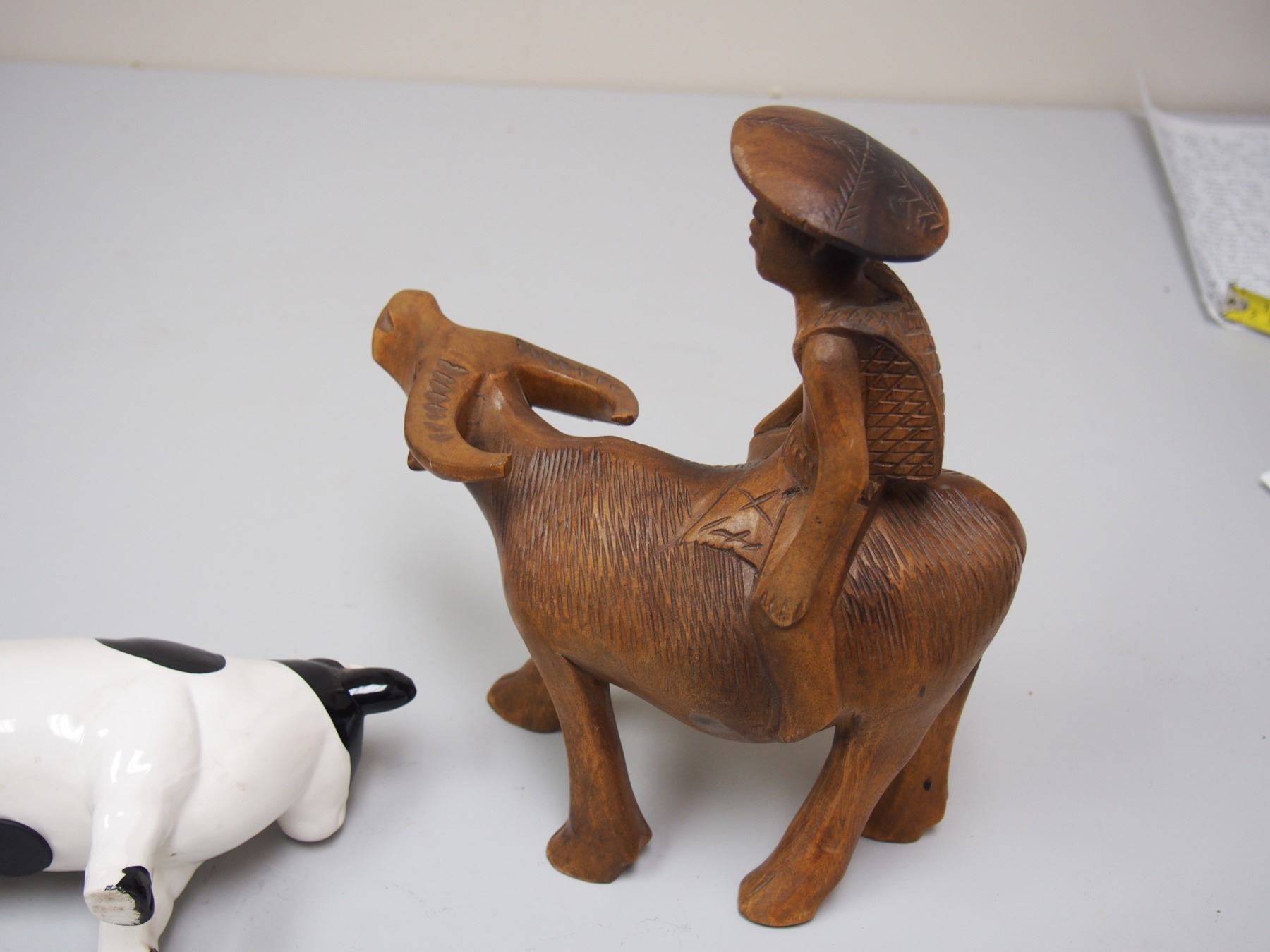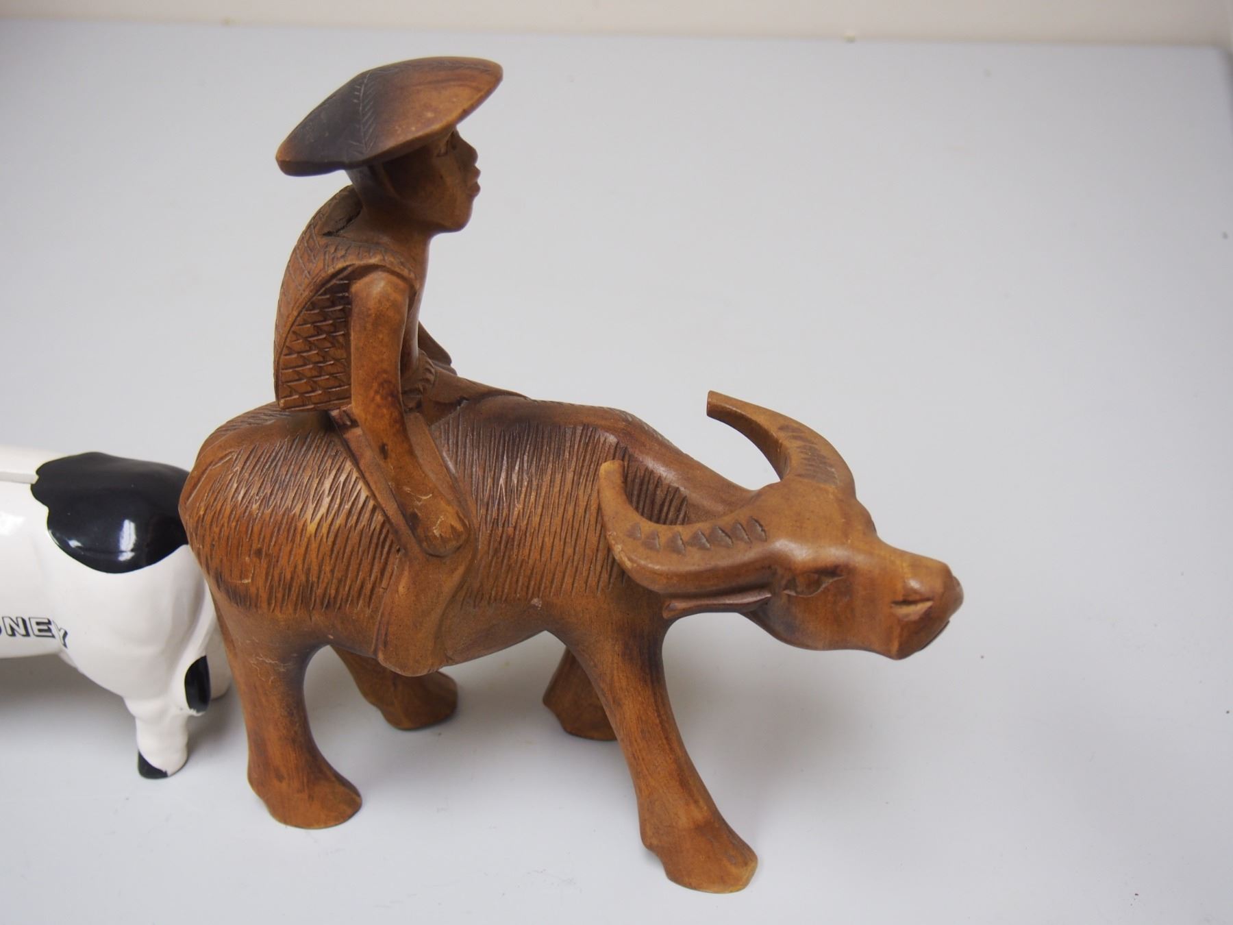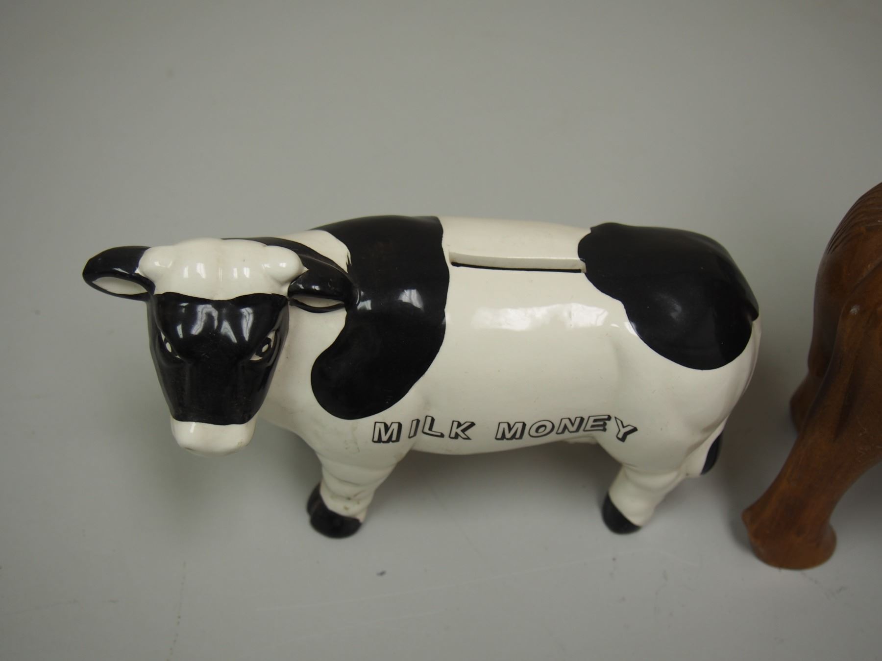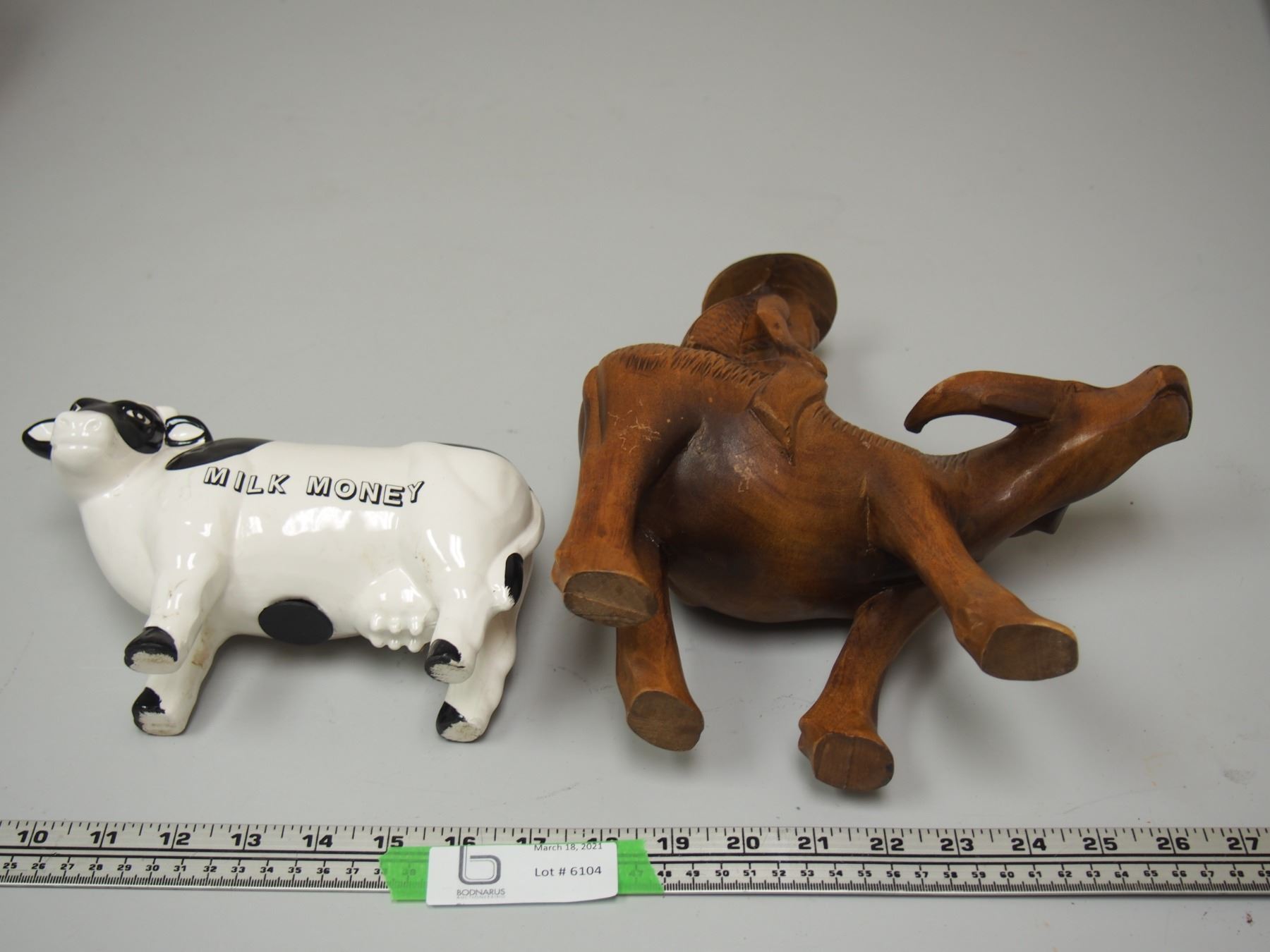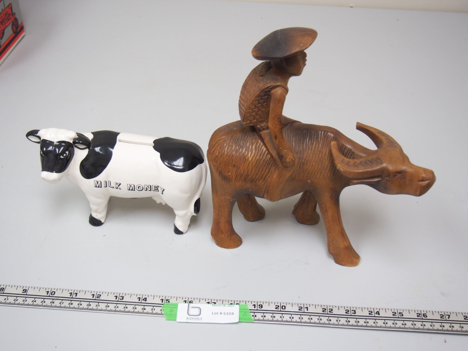 WOODEN FIGURINE & MILK MONEY COIN BANK