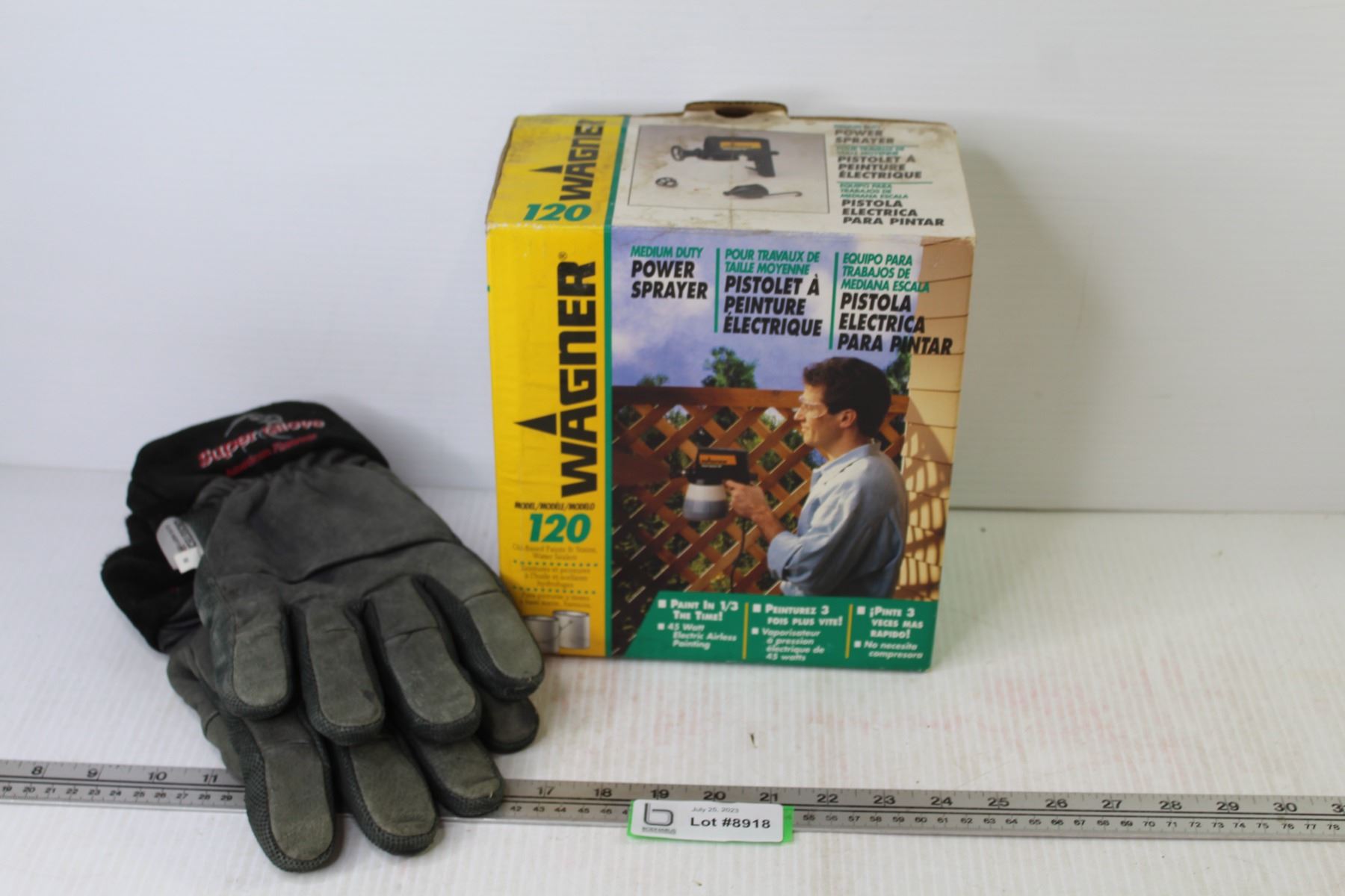 Wagner 120 Paint Sprayer (unused in water damaged box)- Pair of Men's Gloves (size m)