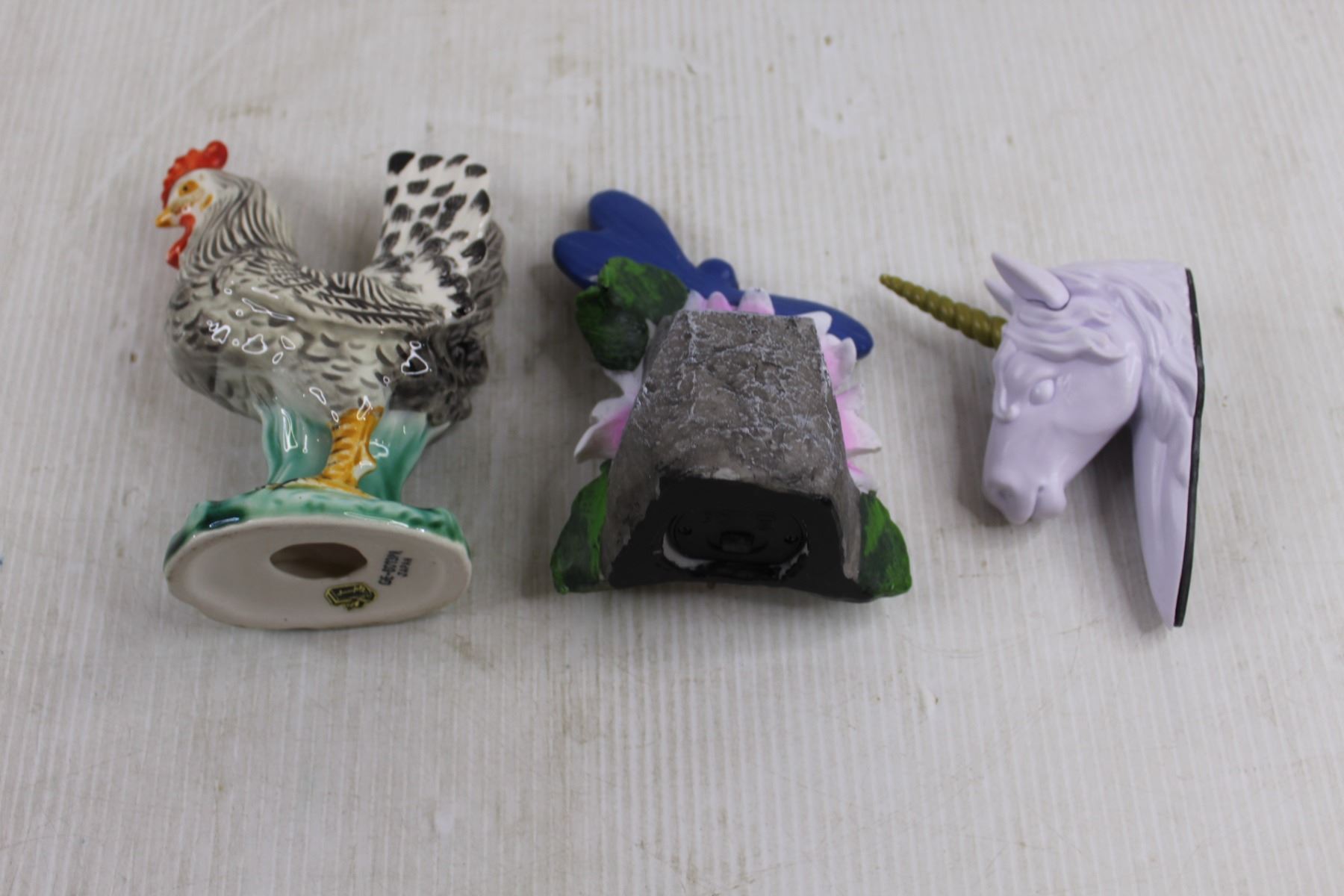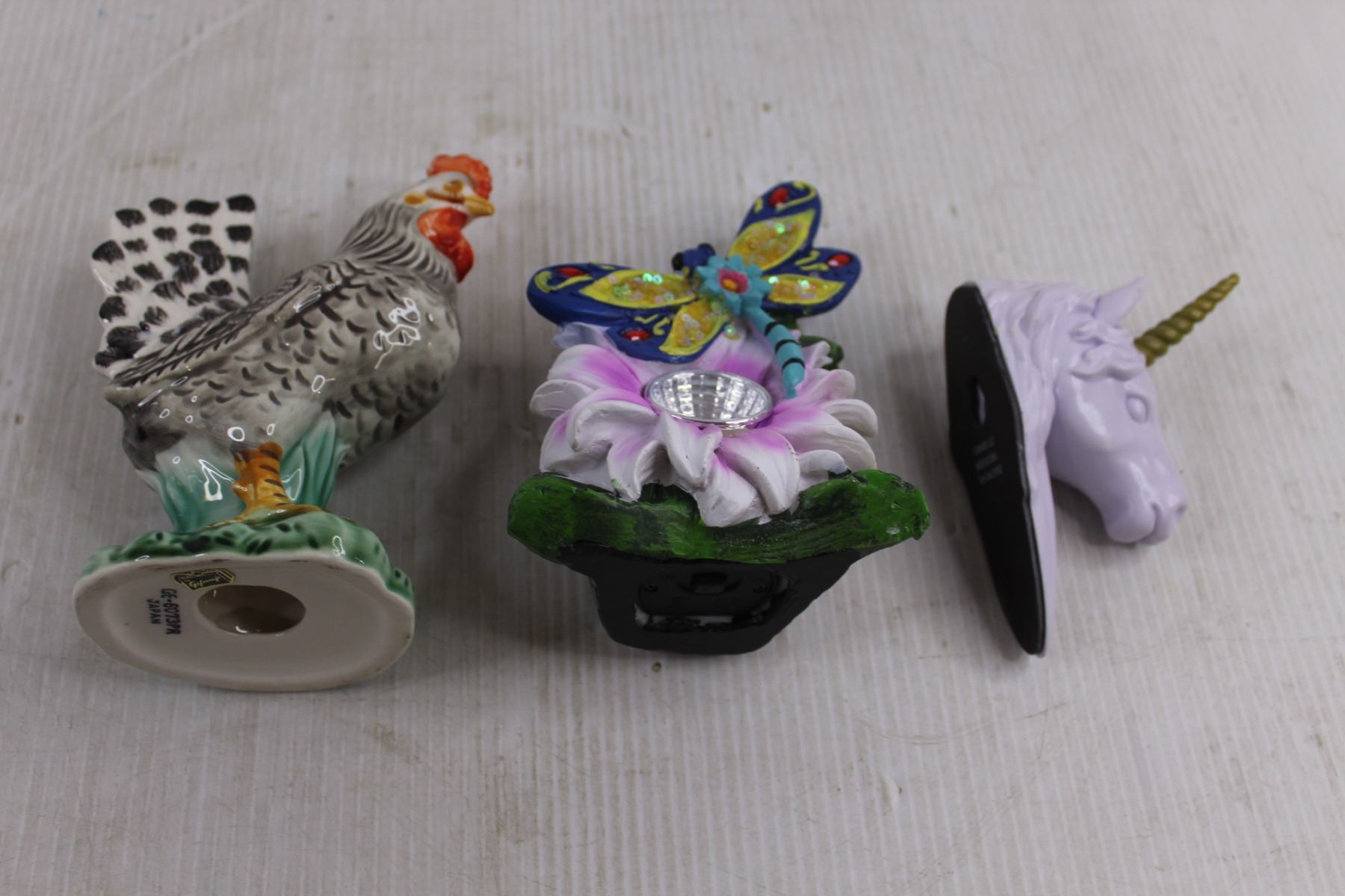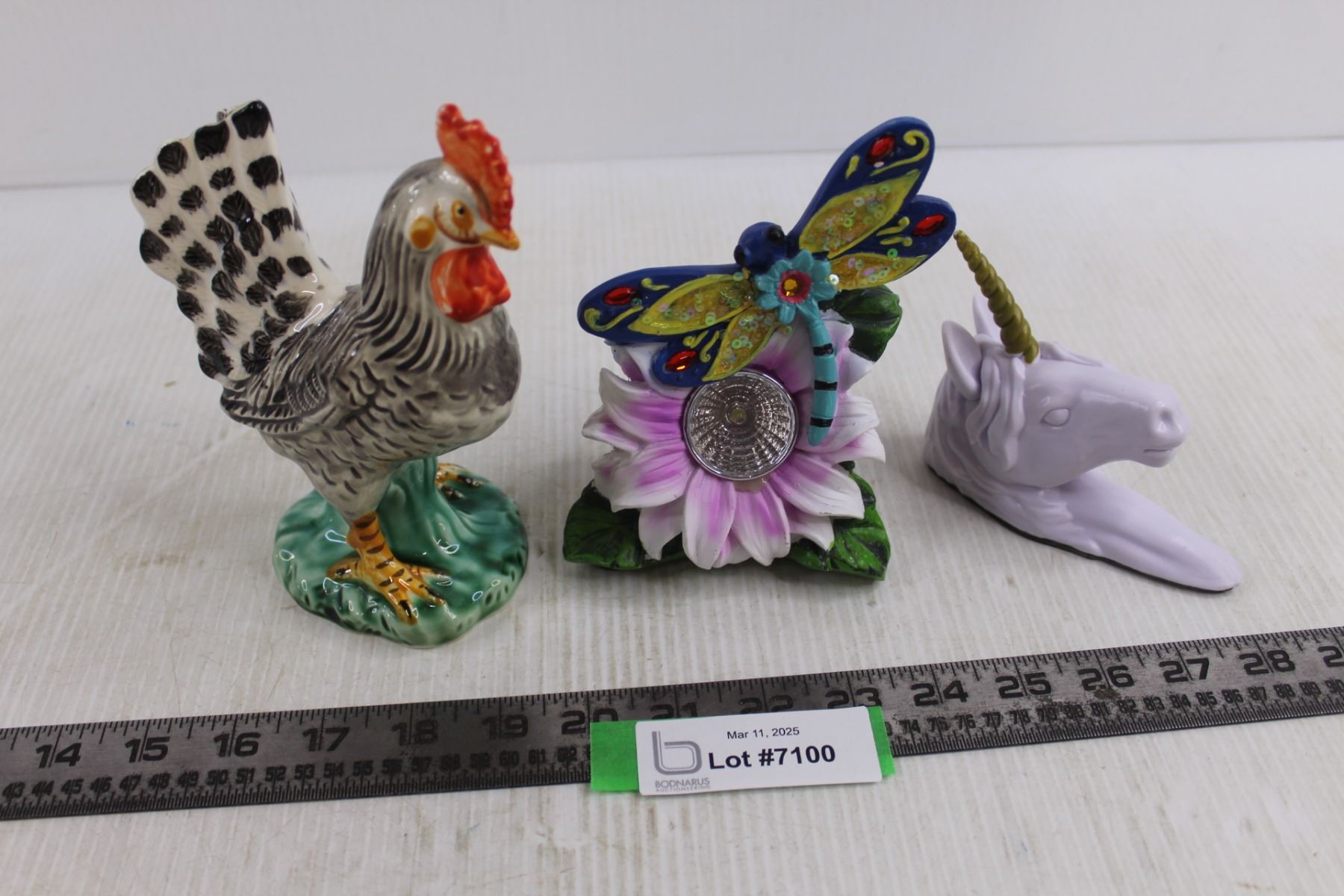 Wall Mount Unicorn Head, Ceramic Chicken Ornament, Dragonfly Motion Light - Needs Battery