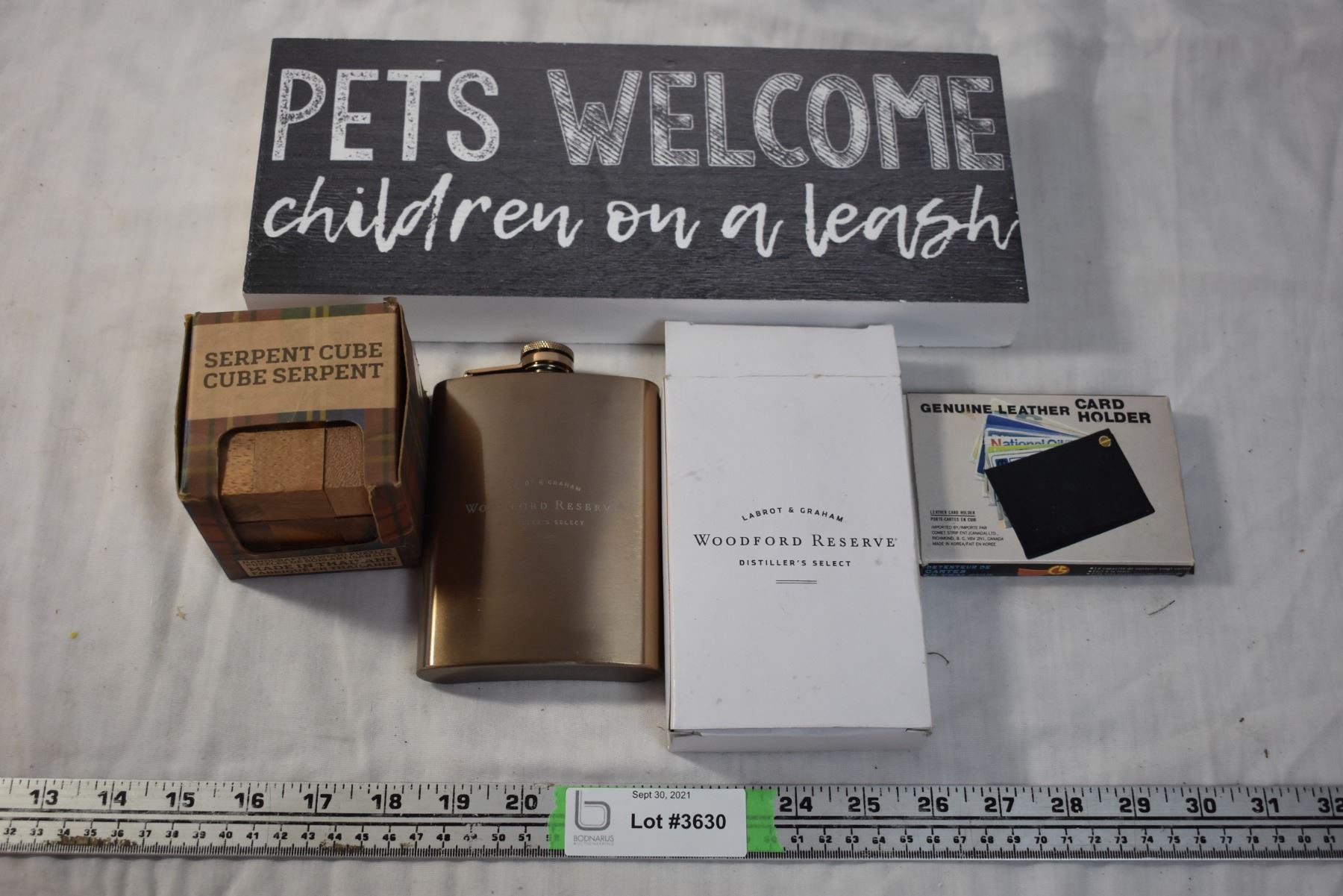 Wall Placard, Wooden Cube, Card Holder, and Flask