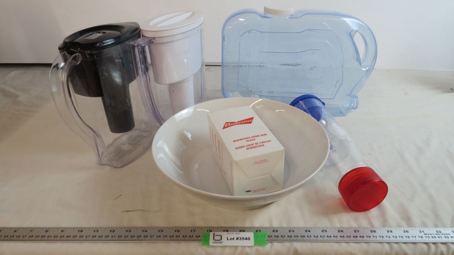 Water Container, (2) water jugs , Budweiser glasses, Large Porcelain bowl