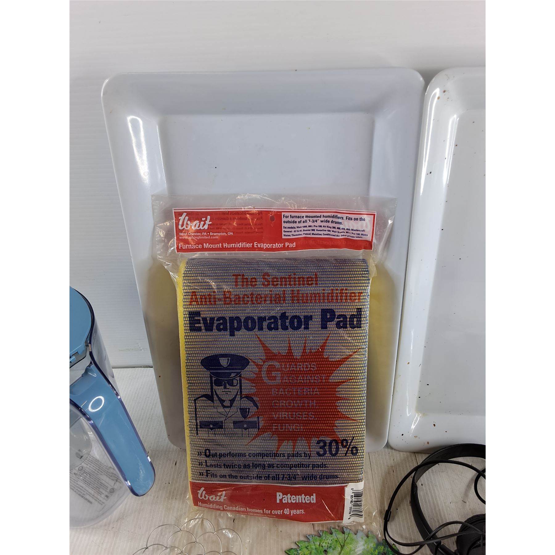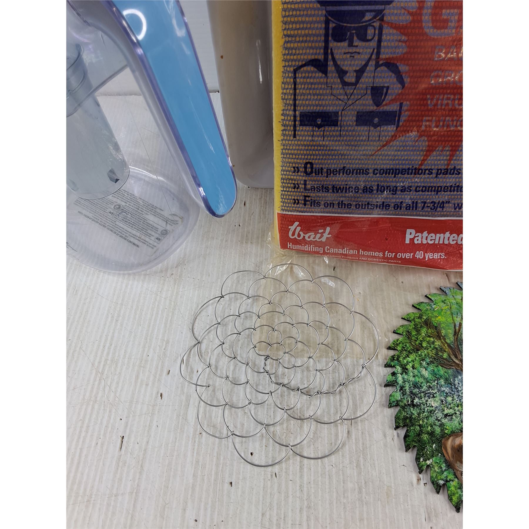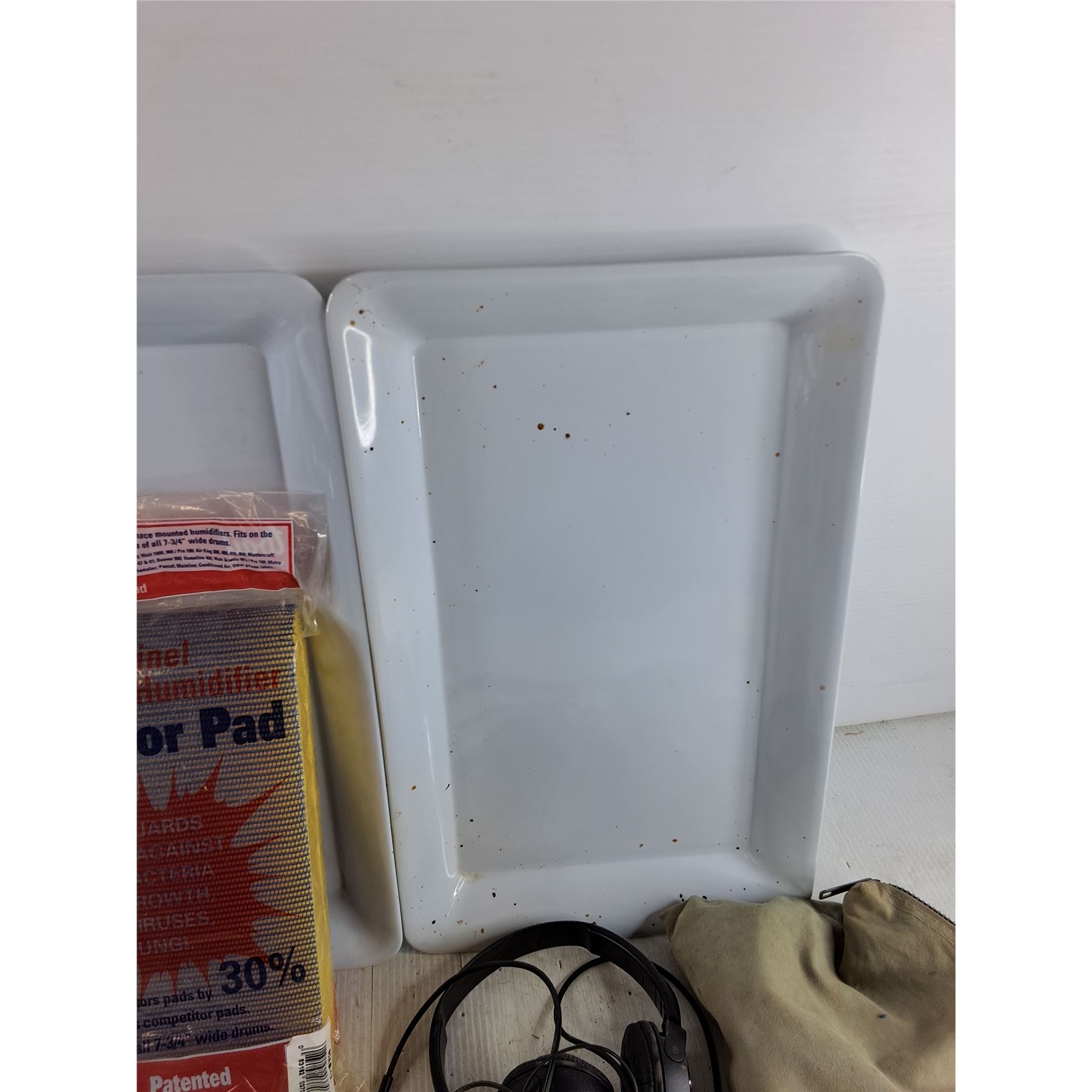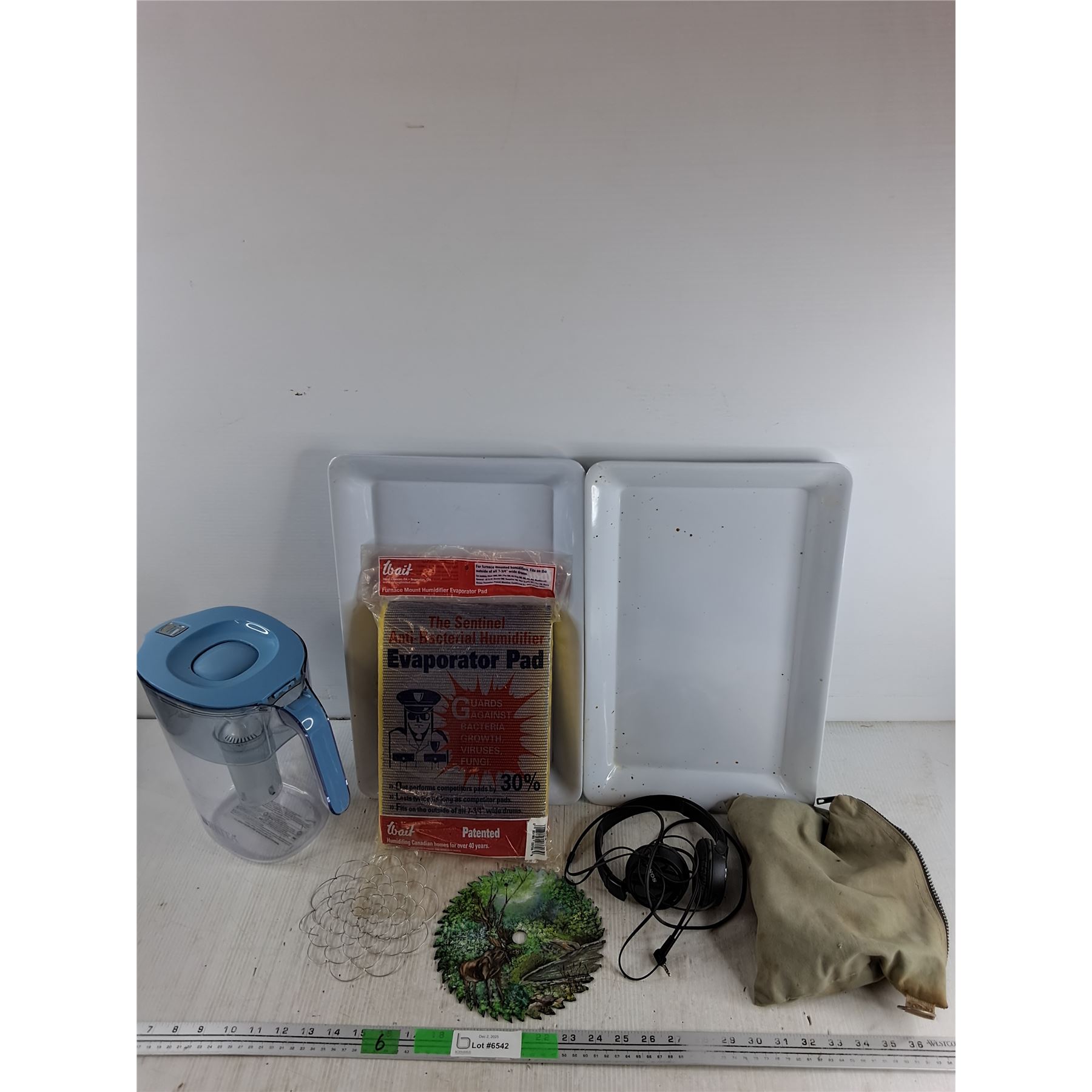 Water Pitcher, Evaporator Pad, Sony Headphones, (2) Plastic Trays, Circular Blade Art, Misc