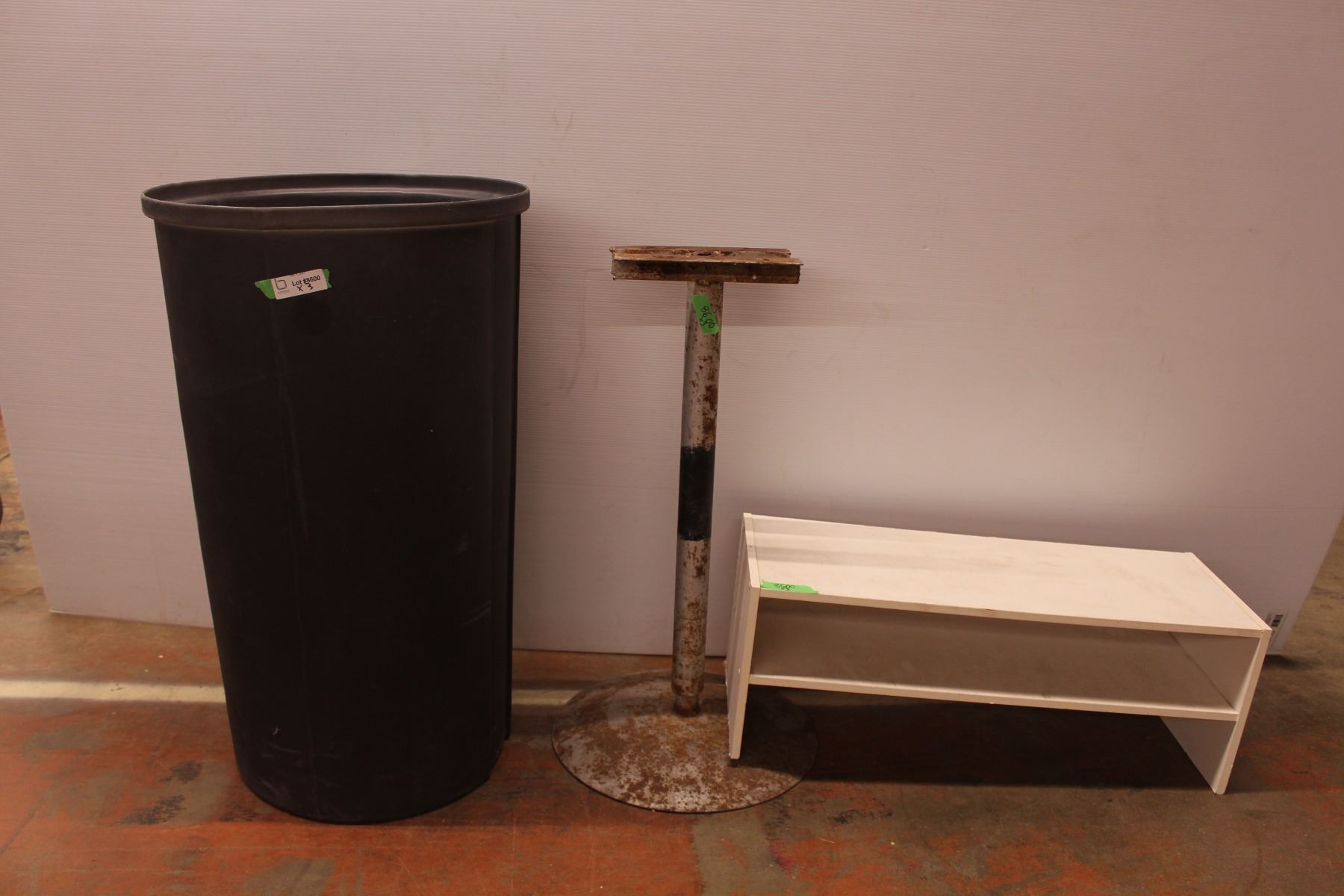 Water softener tub, metal stand, wooden shoe rack