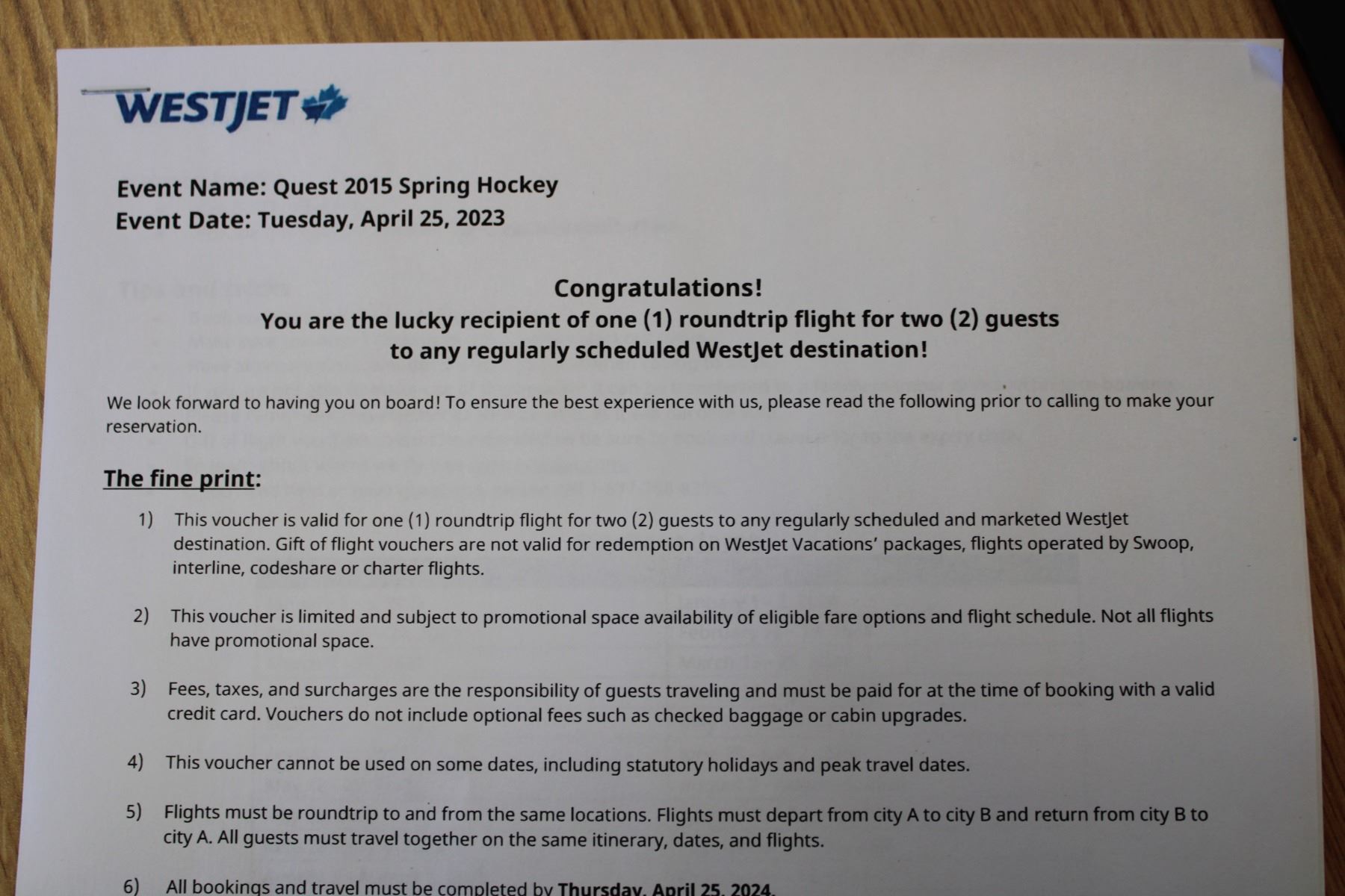 One Roundtrip Flight for two guests to any regularly scheduled and marketed WestJet destination* plus an ultra light, soft-sided, expandable 28" luggage piece with 360-degree spinner wheels! (* No cash value. Fees, taxes, surcharges not included. Blackout dates and restrictions apply.)