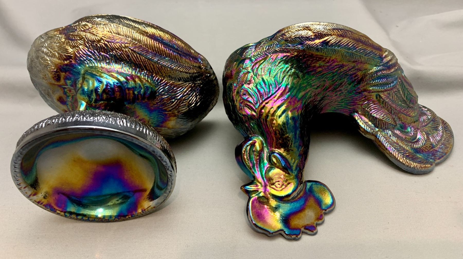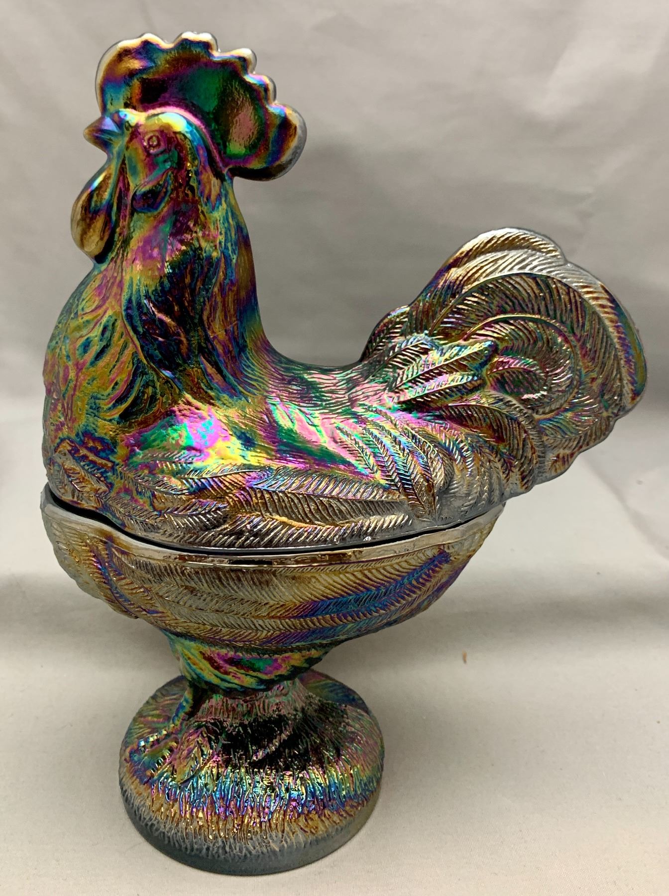 Westmoreland Amethyst Carnival Glass "Top of the Morning Covered ROOSTER" Very rare in Carnival Glass!
