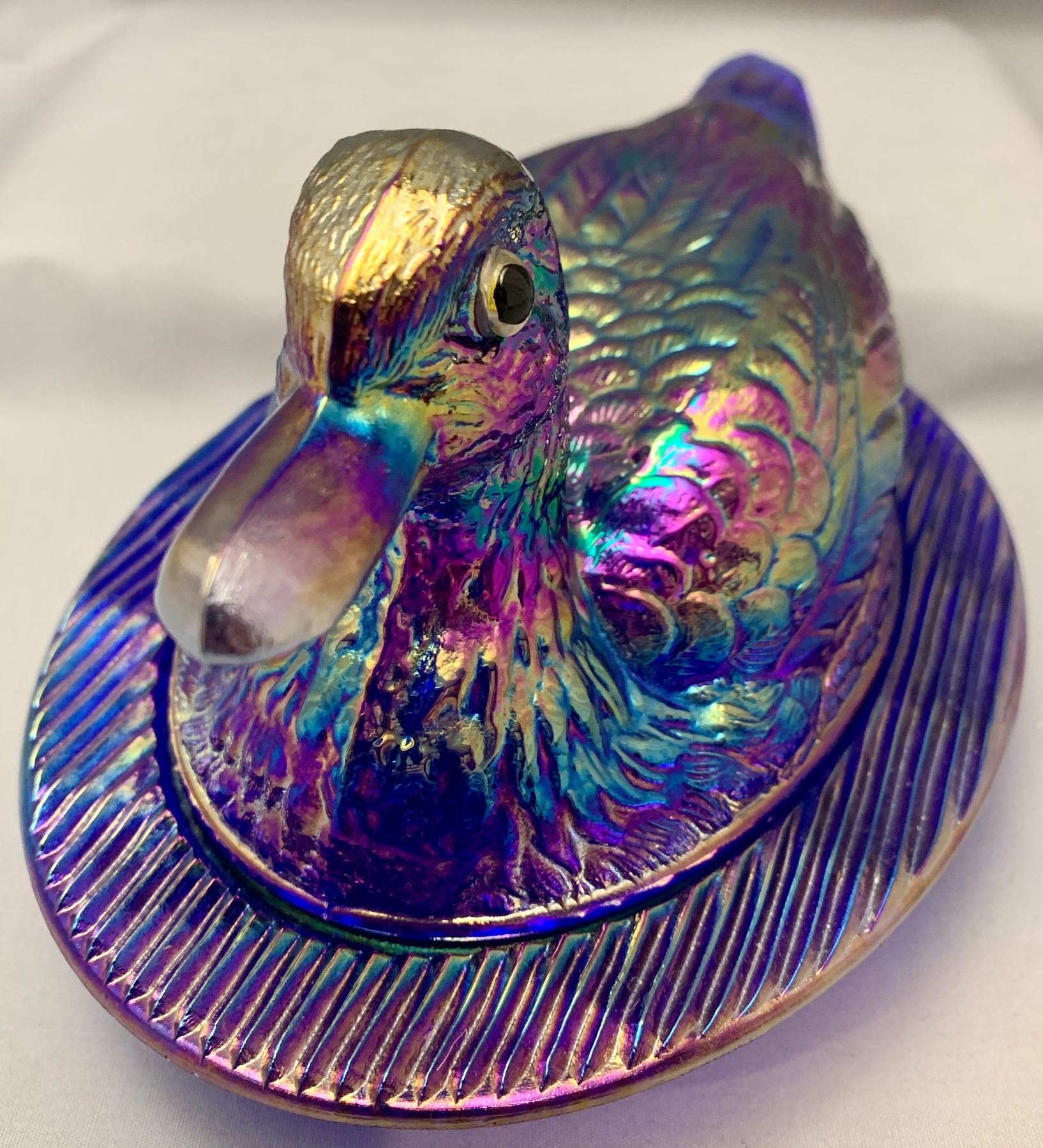Westmoreland Carnival Glass 9" cobalt blue Duck on Nest with Glass Eyes!