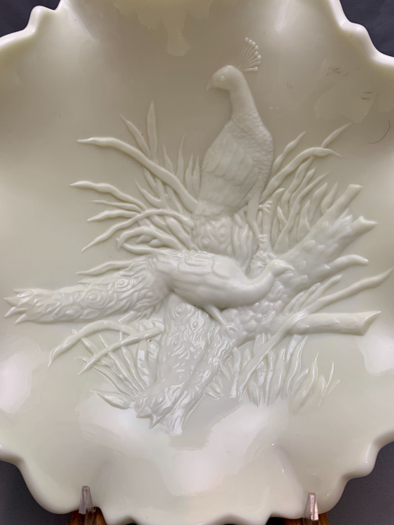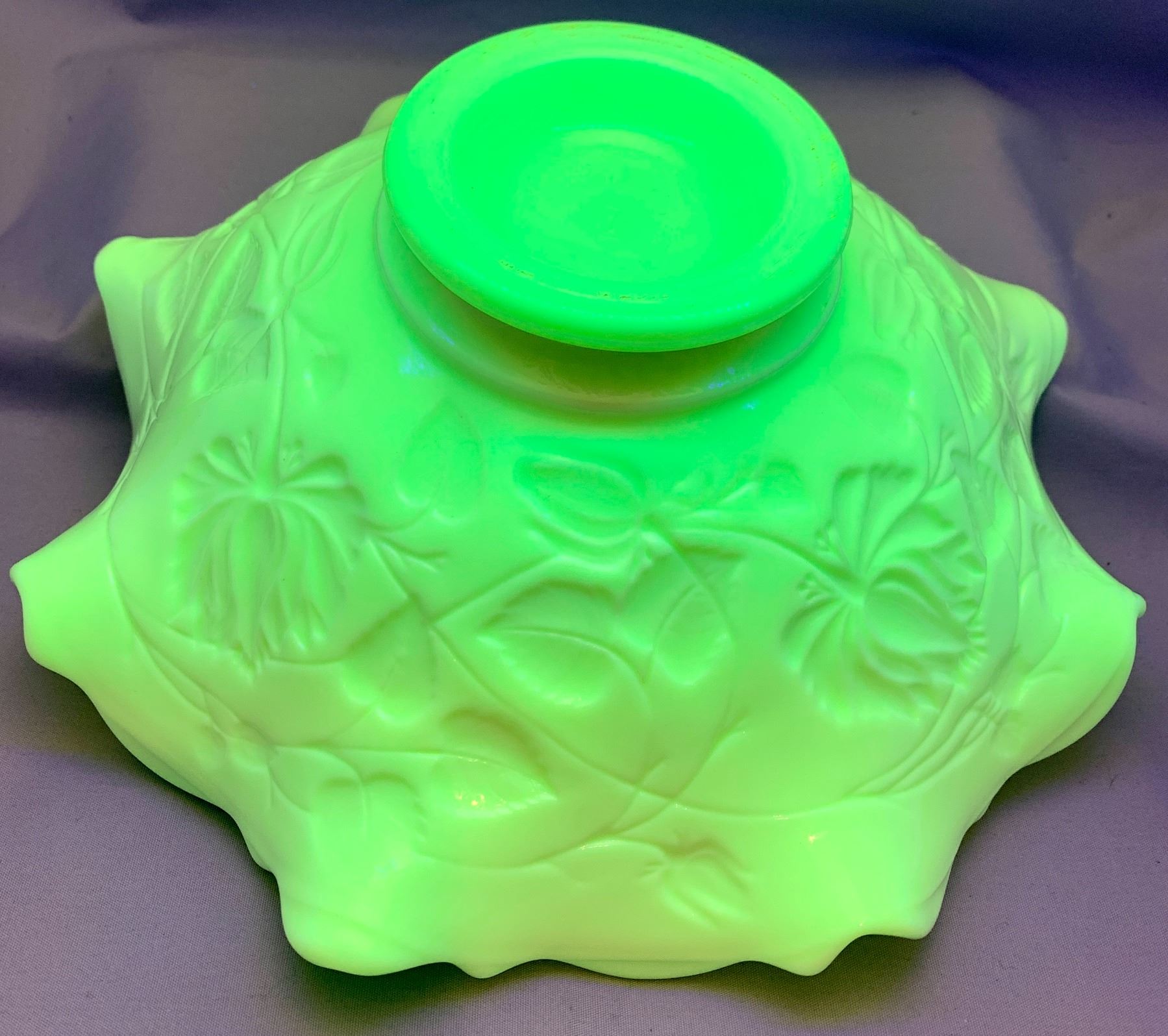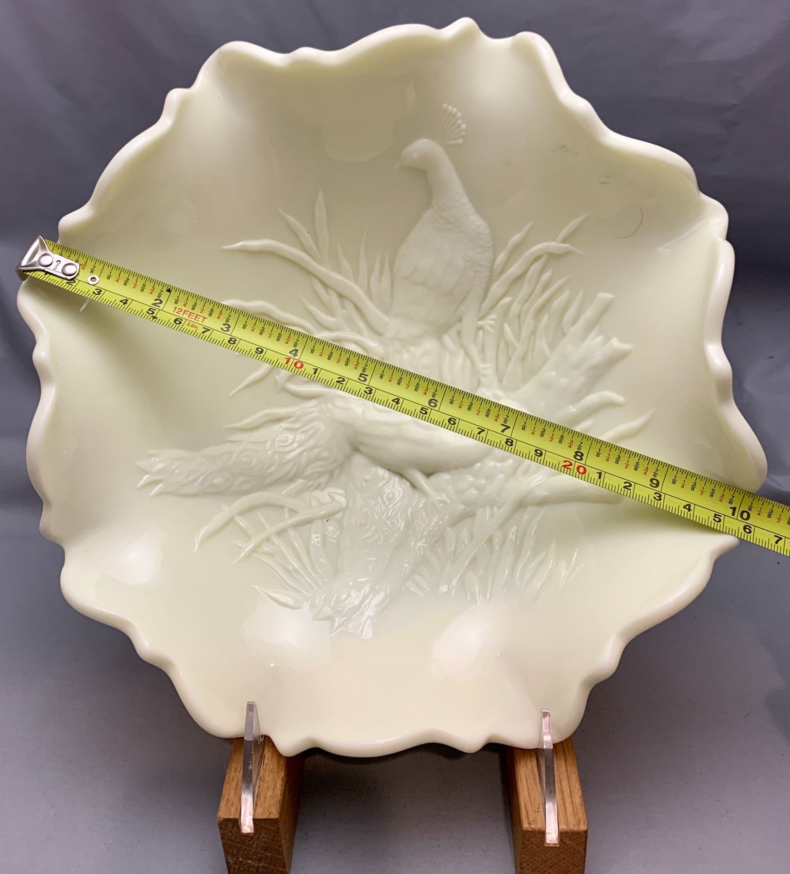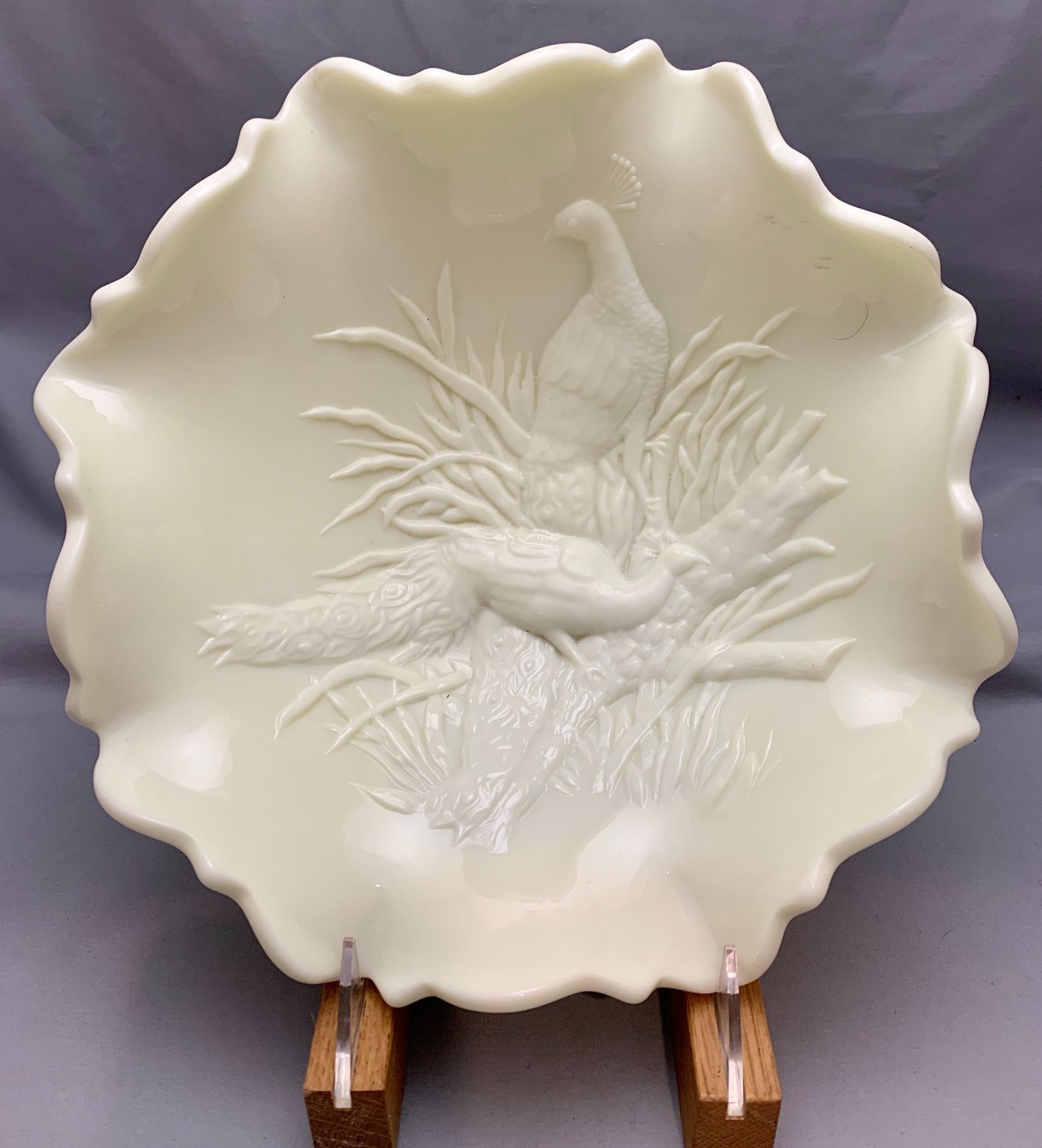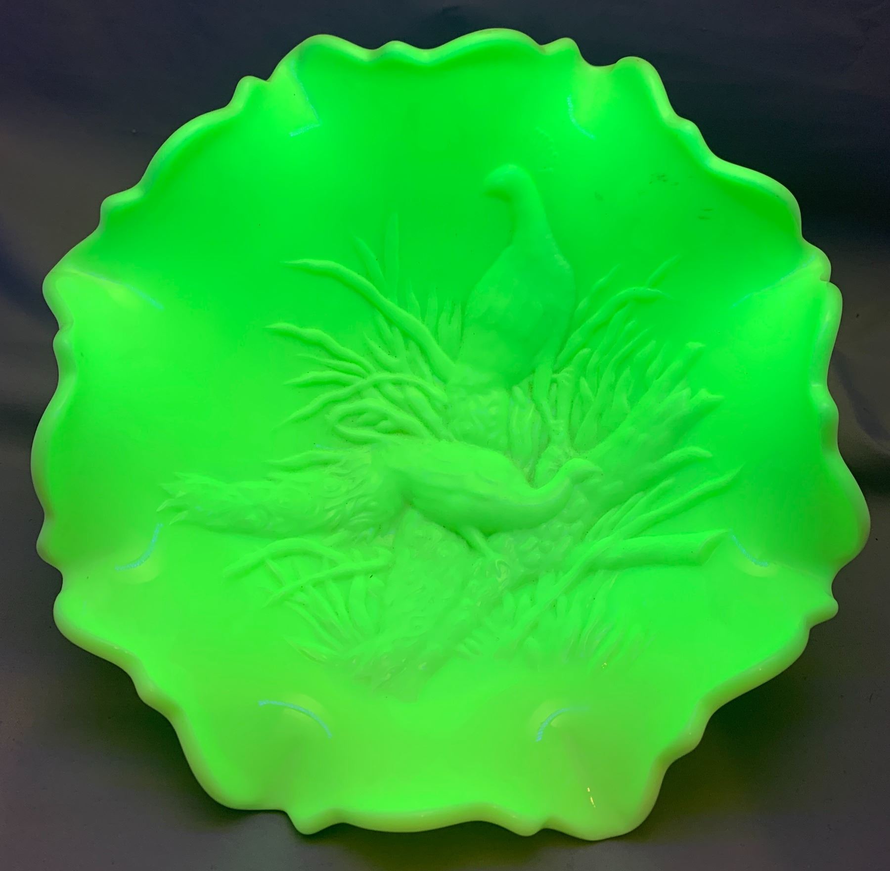 Westmoreland Uranium Custard Glass "Peacocks" Large Master Centrepiece Fruit Ruffled Bowl.