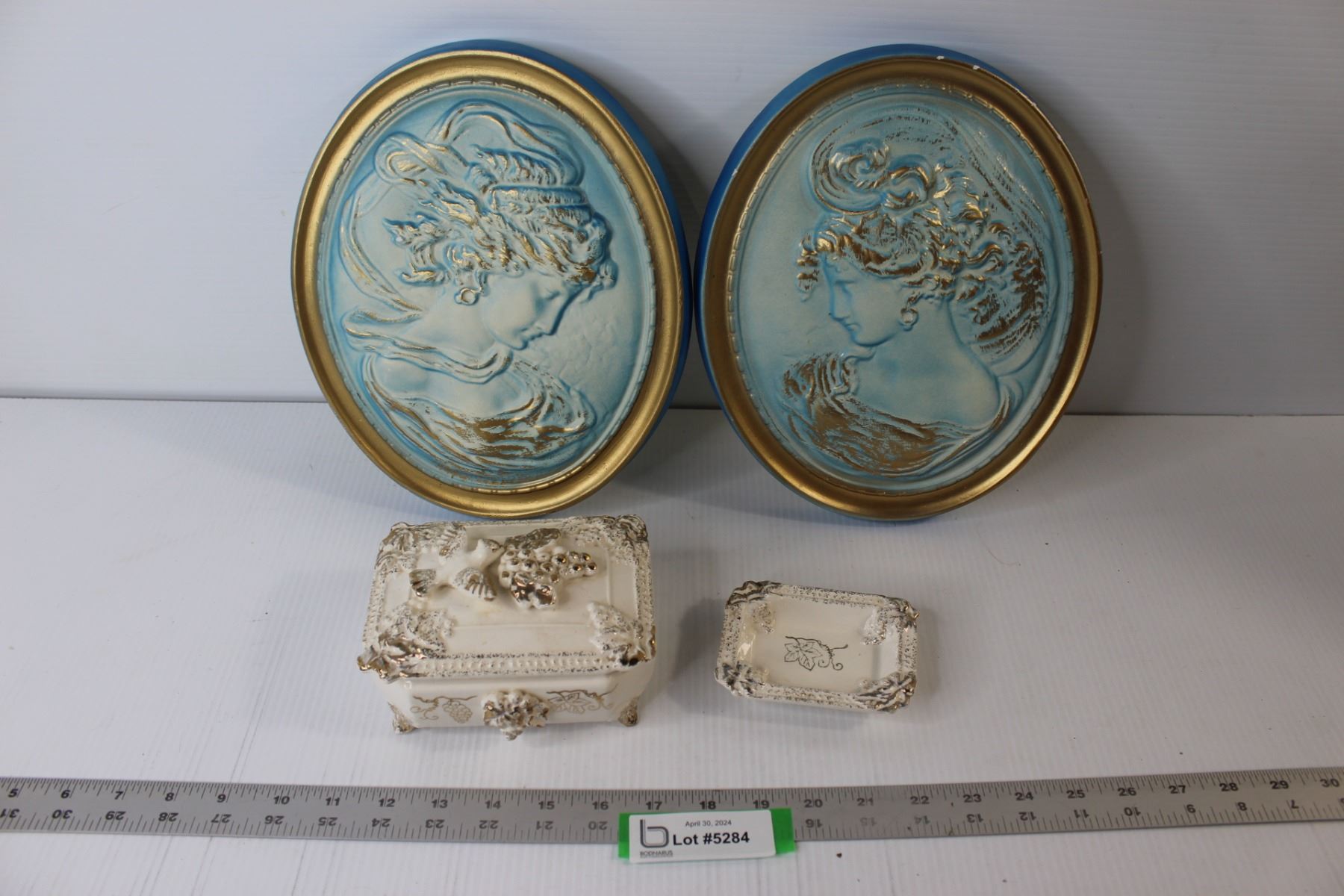 White Ceramic Cigarette Case & Ashtray, (2) Plaster Wall Hangings