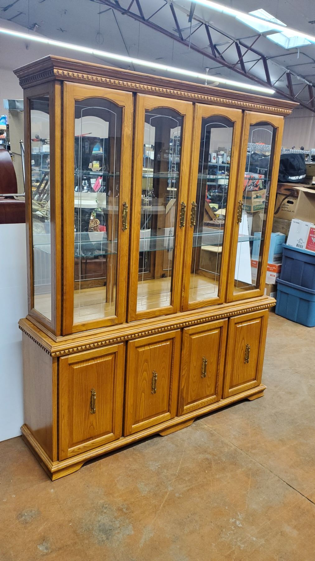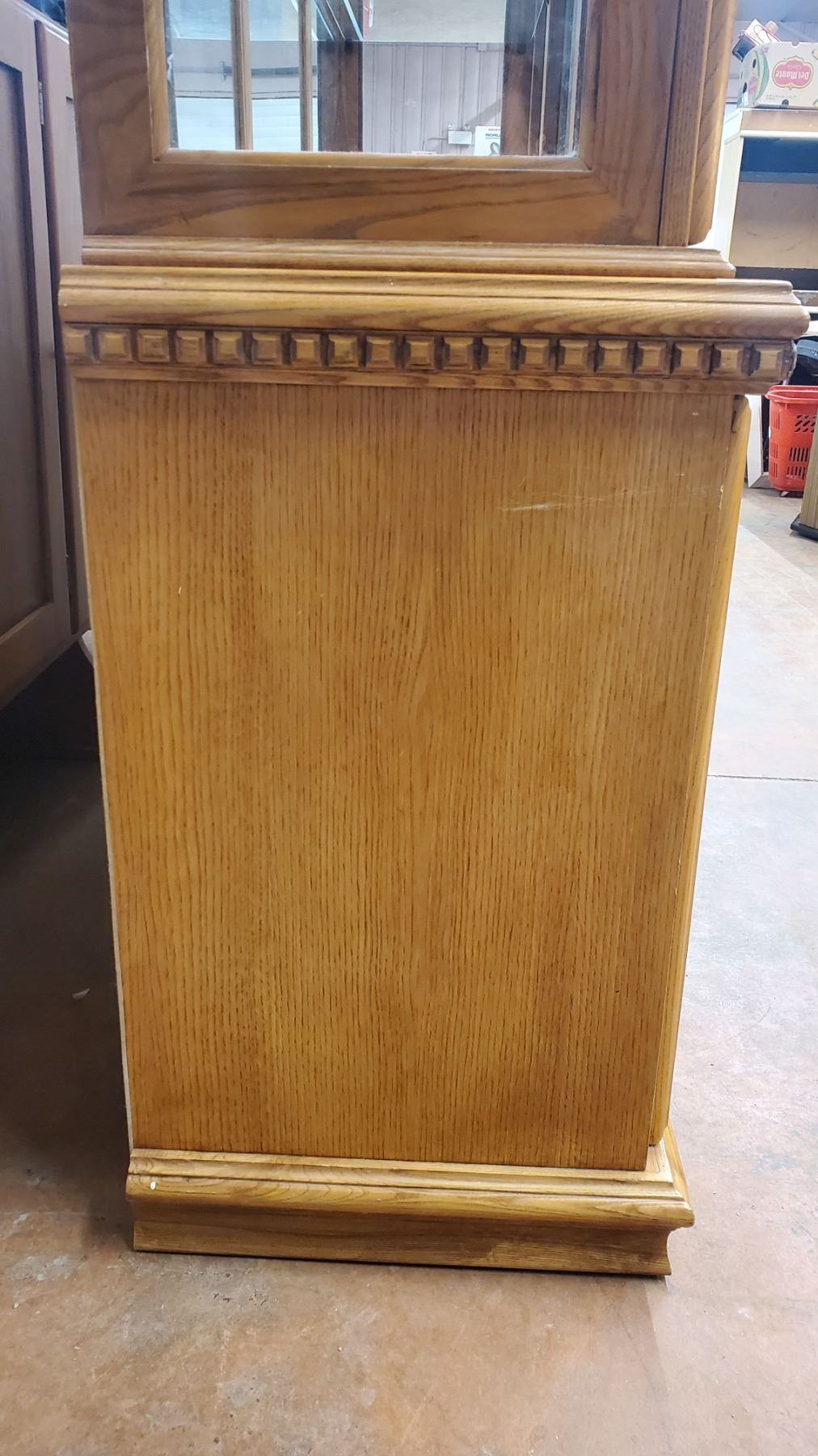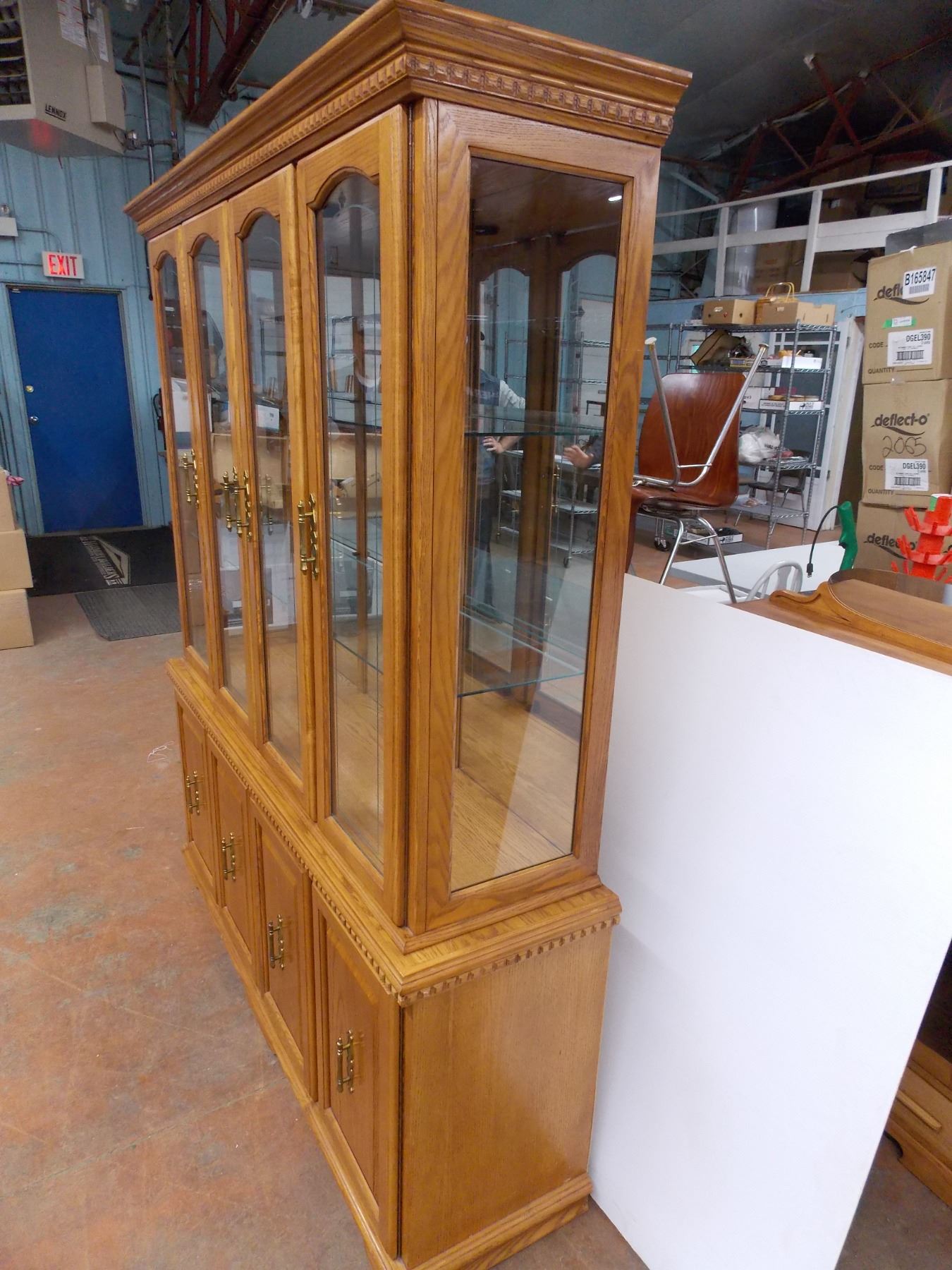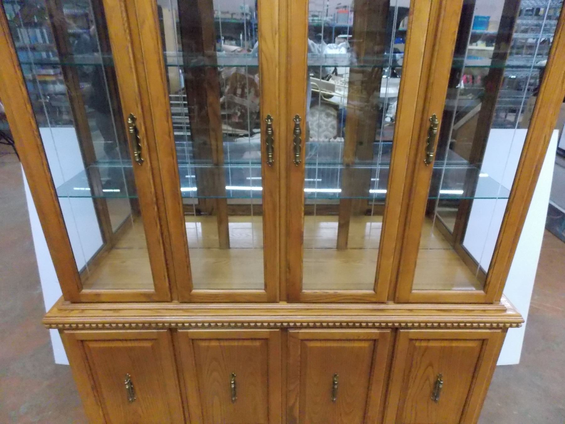 *Wood China Cabinet (2 piece) - working light, good condition - 64"Wx16.5"Dx77"T - Glass + Oak?