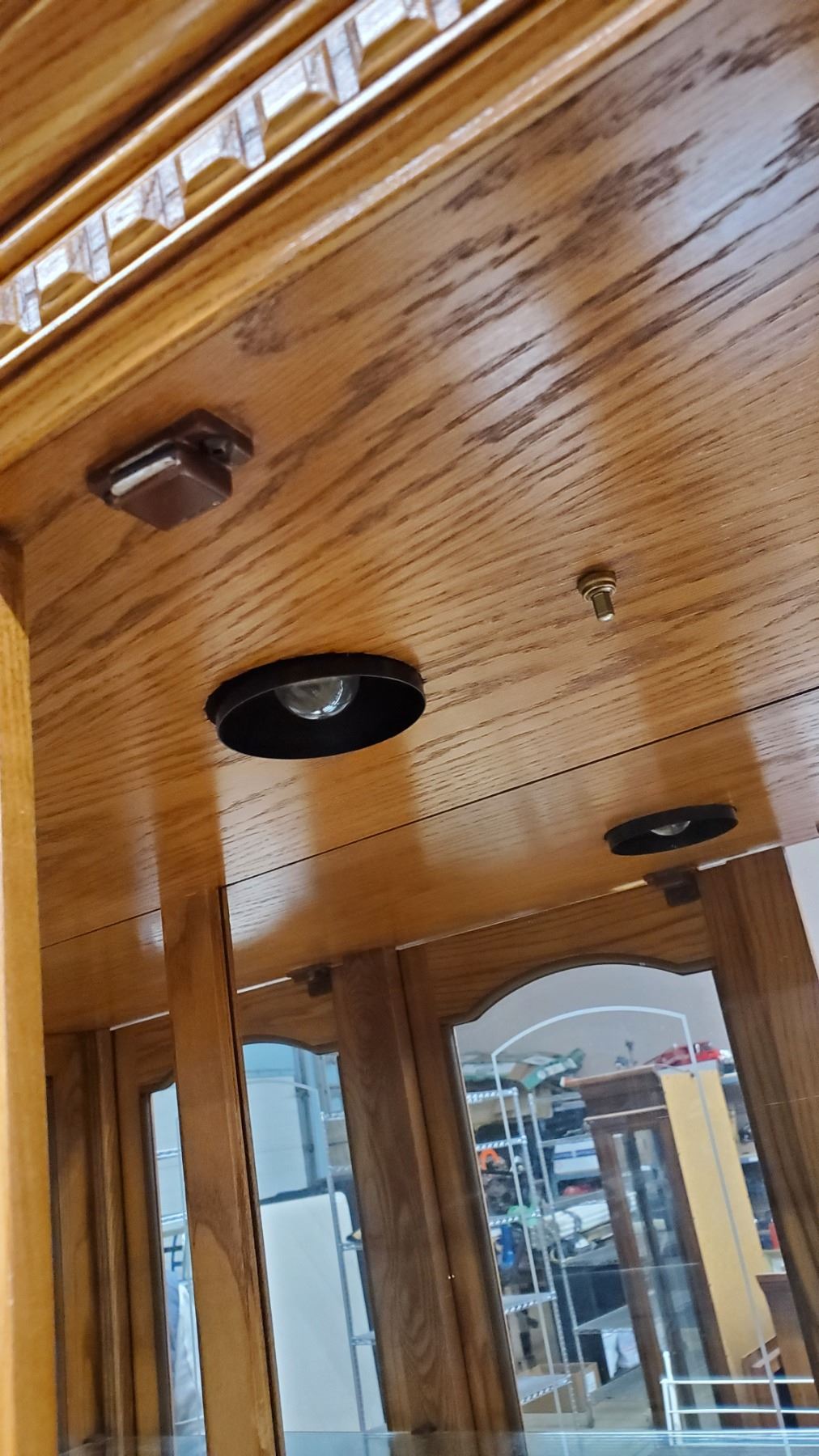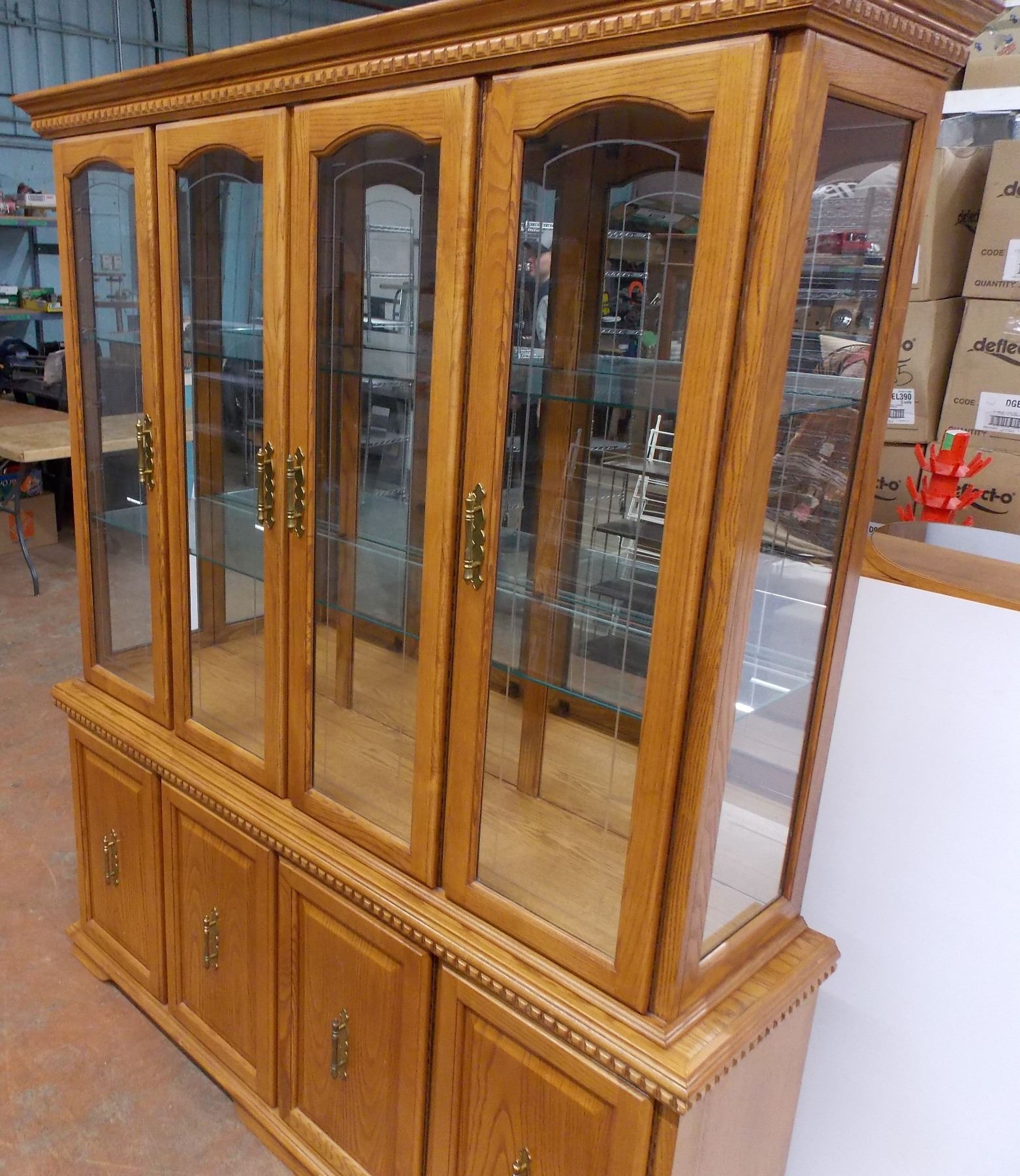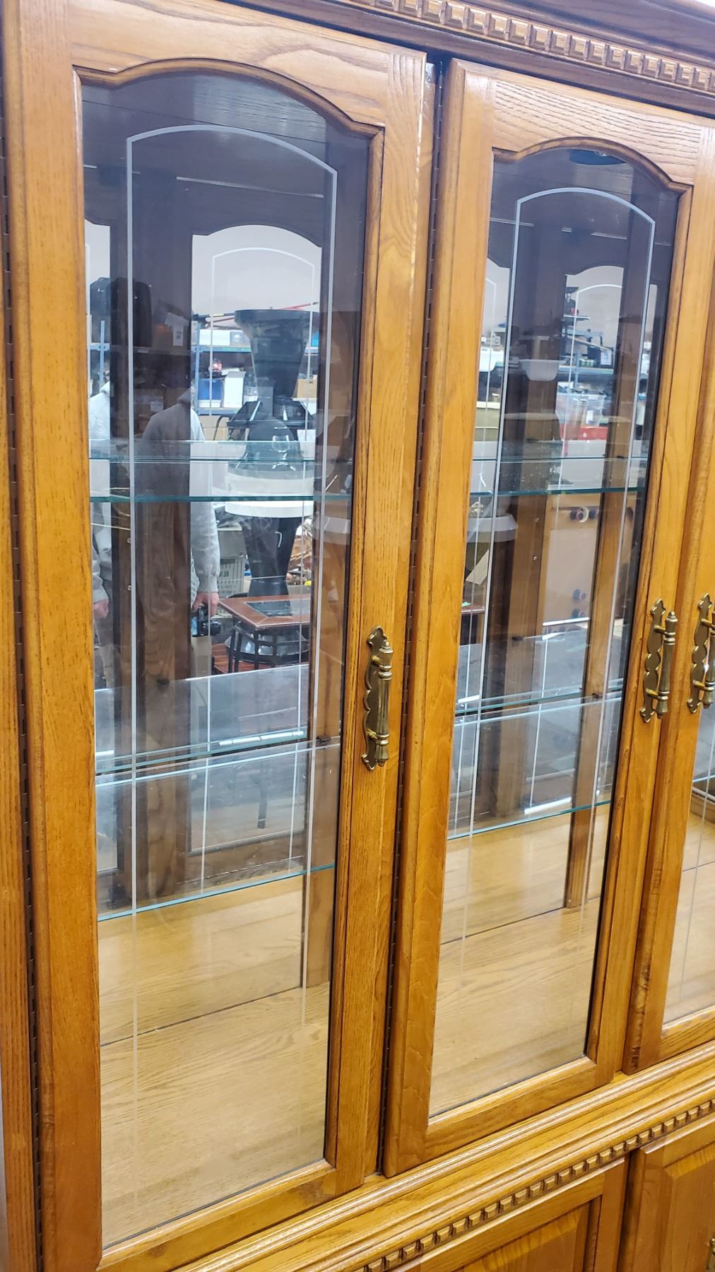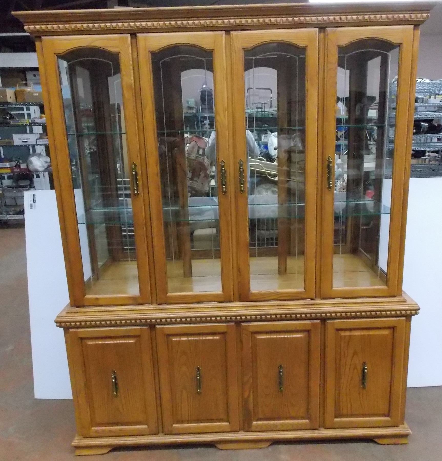 *Wood China Cabinet (2 piece) - working light, good condition - 64"Wx16.5"Dx77"T - Glass + Oak?