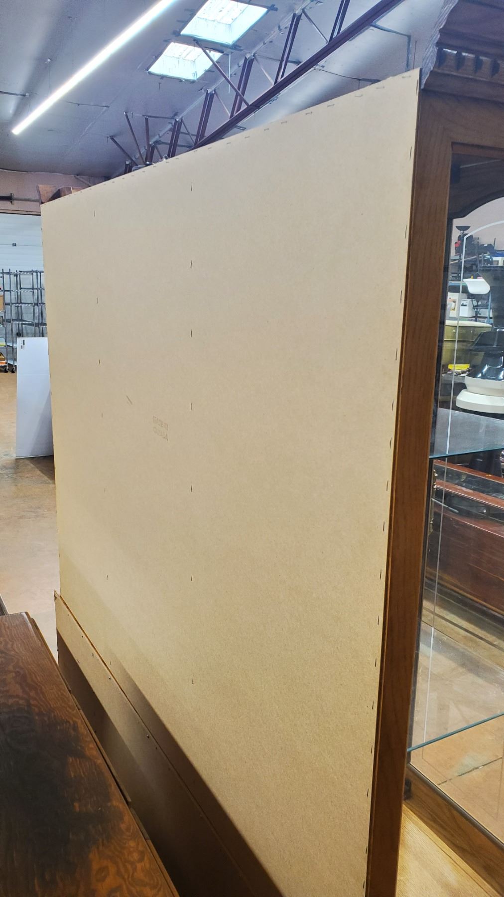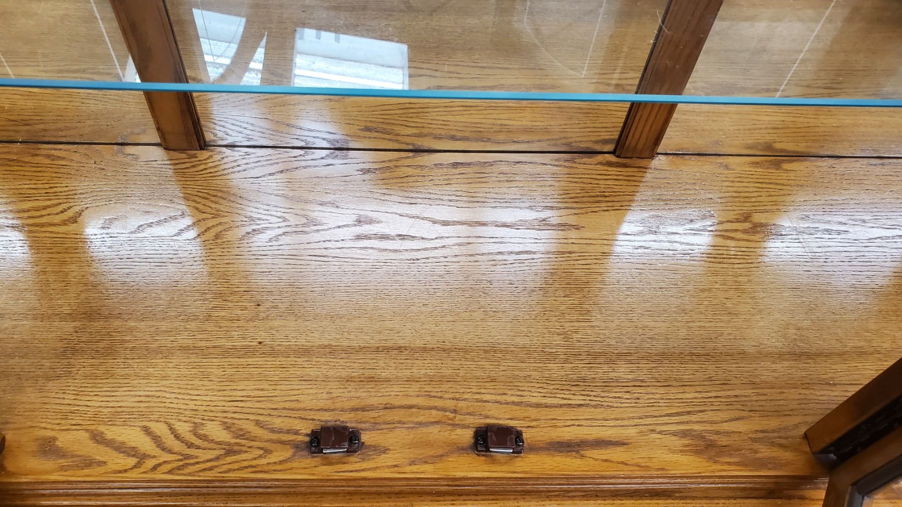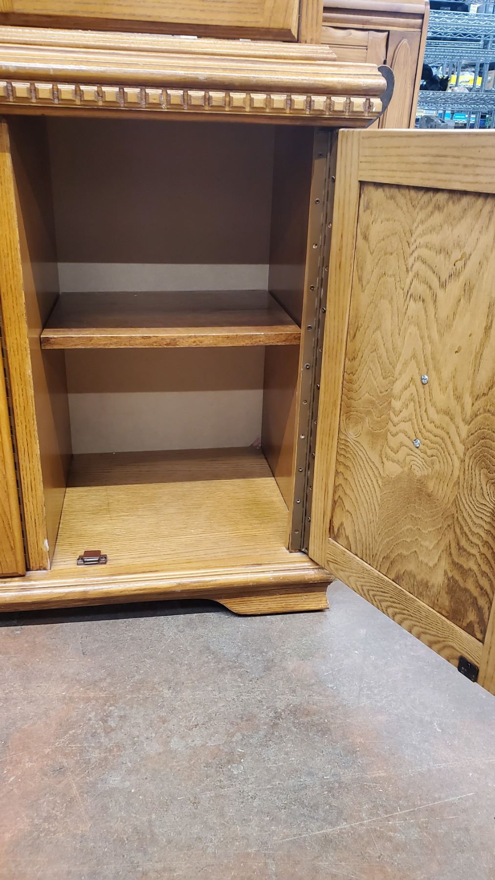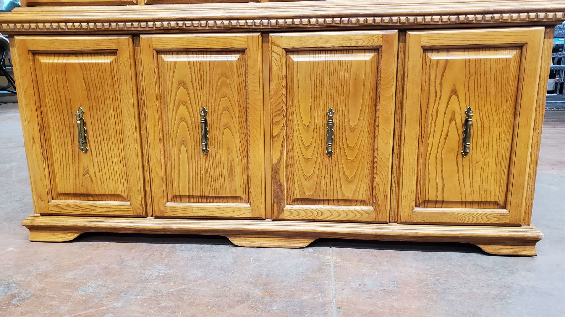 *Wood China Cabinet (2 piece) - working light, good condition - 64"Wx16.5"Dx77"T - Glass + Oak?