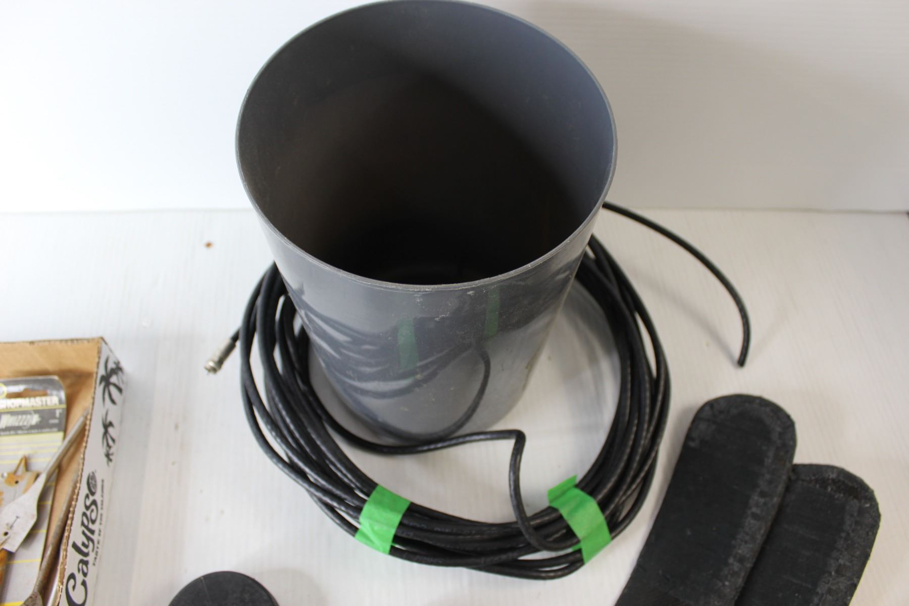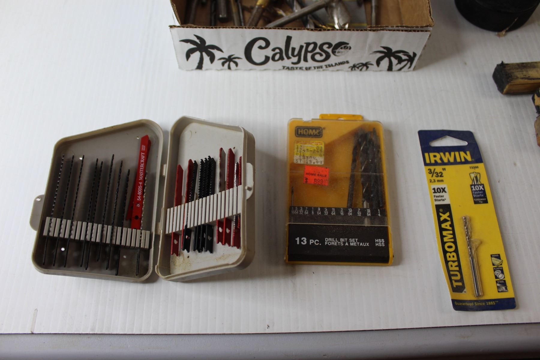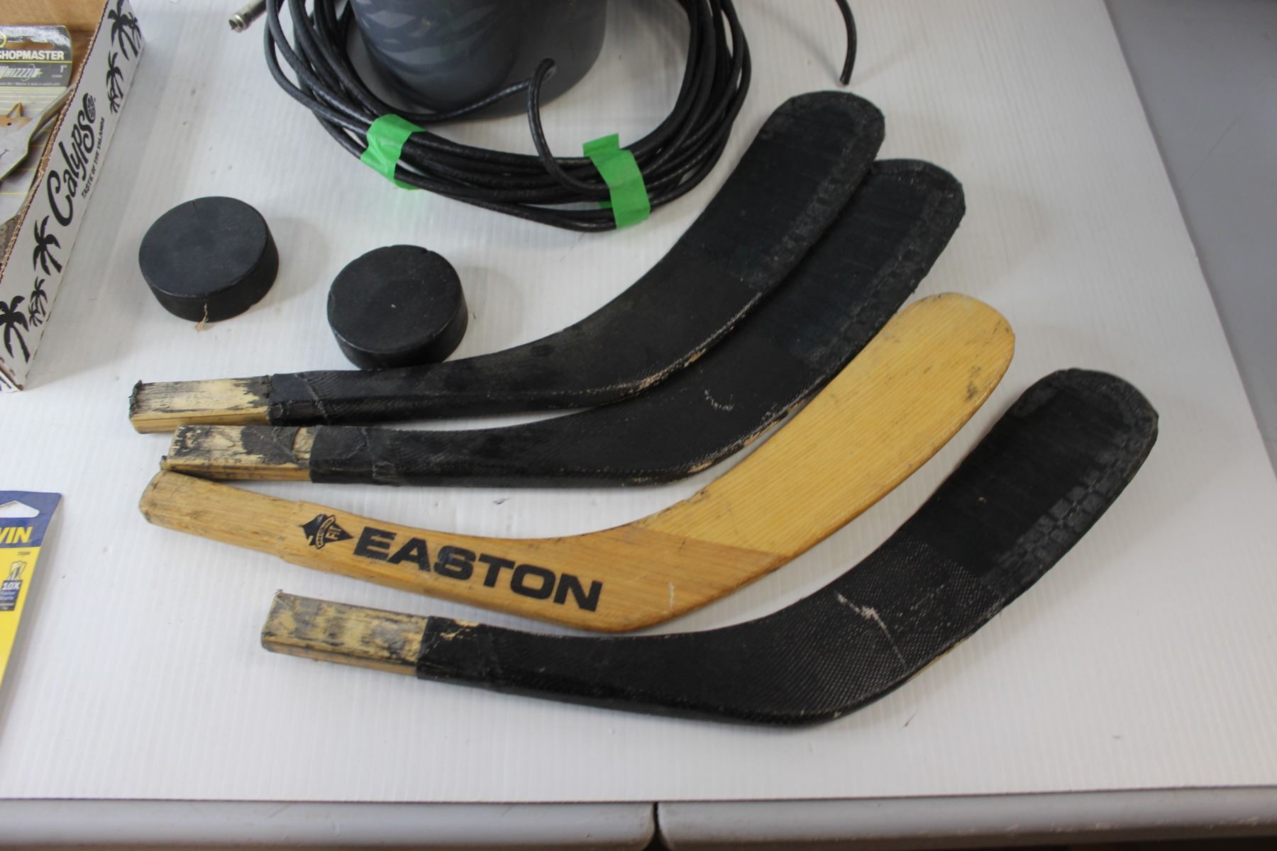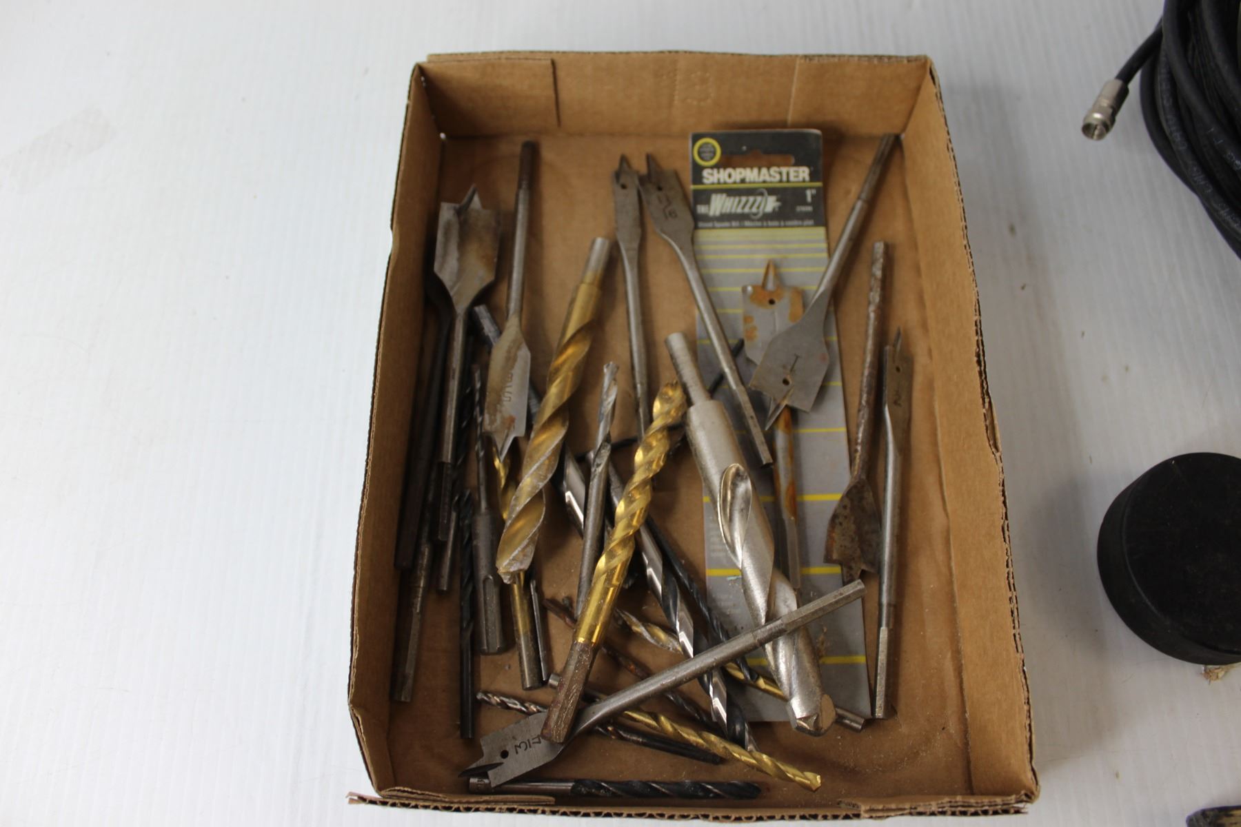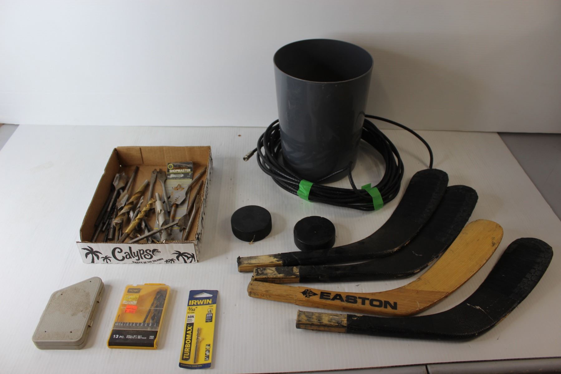 Wood Drill Bits, Drill Bits, Hockey Stick Ends, Garbage Can, (2) Hockey Pucks, Misc. Wire