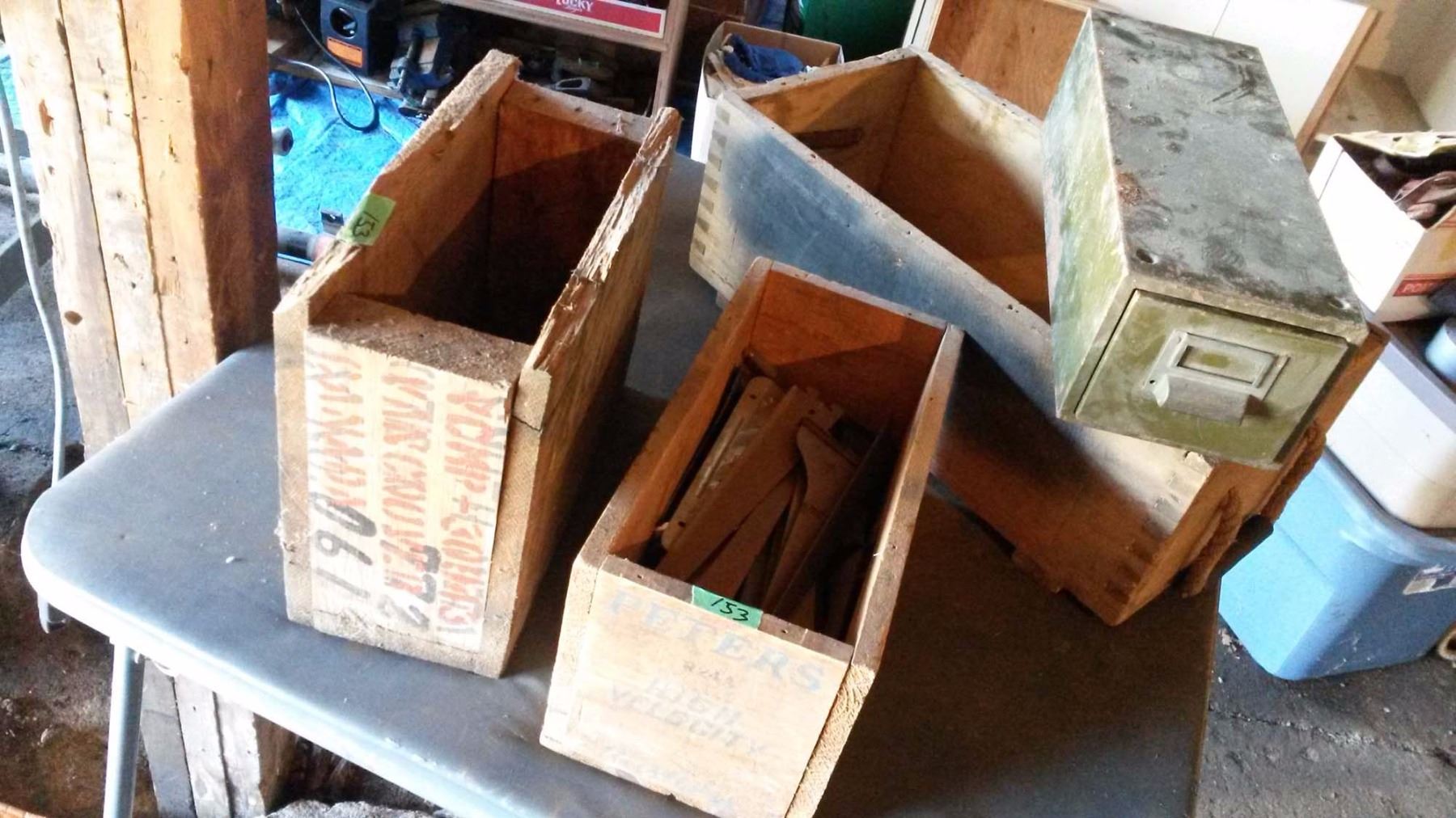 Wooden Ammunition Boxes (3), Metal Filing Drawer