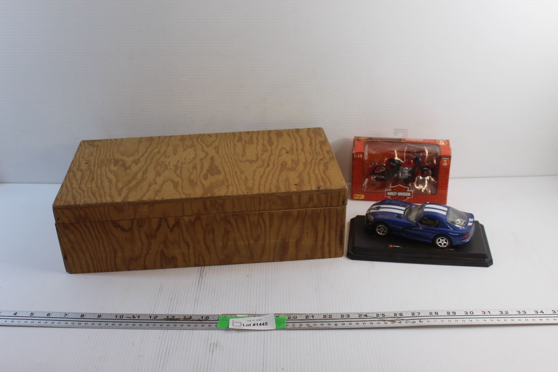 Wooden Box, Die Cast Dodge Viper Toy Car and Harley Davidson 1:18 Scale Motorcycle