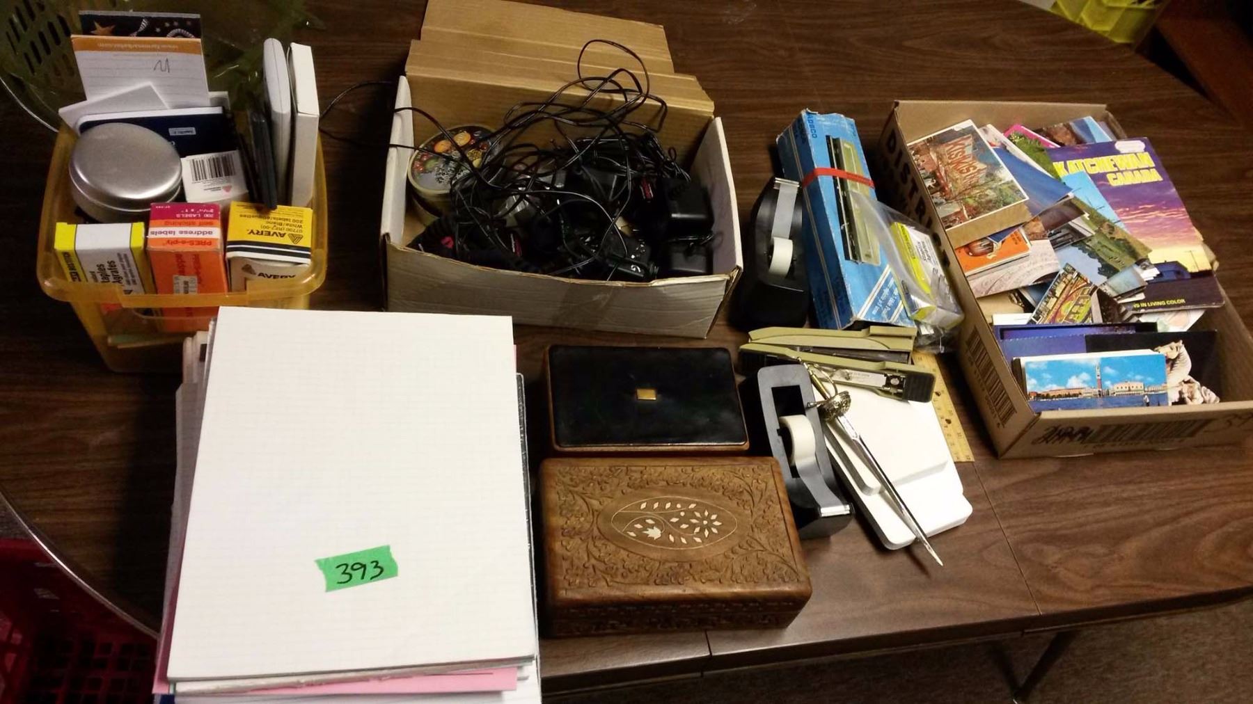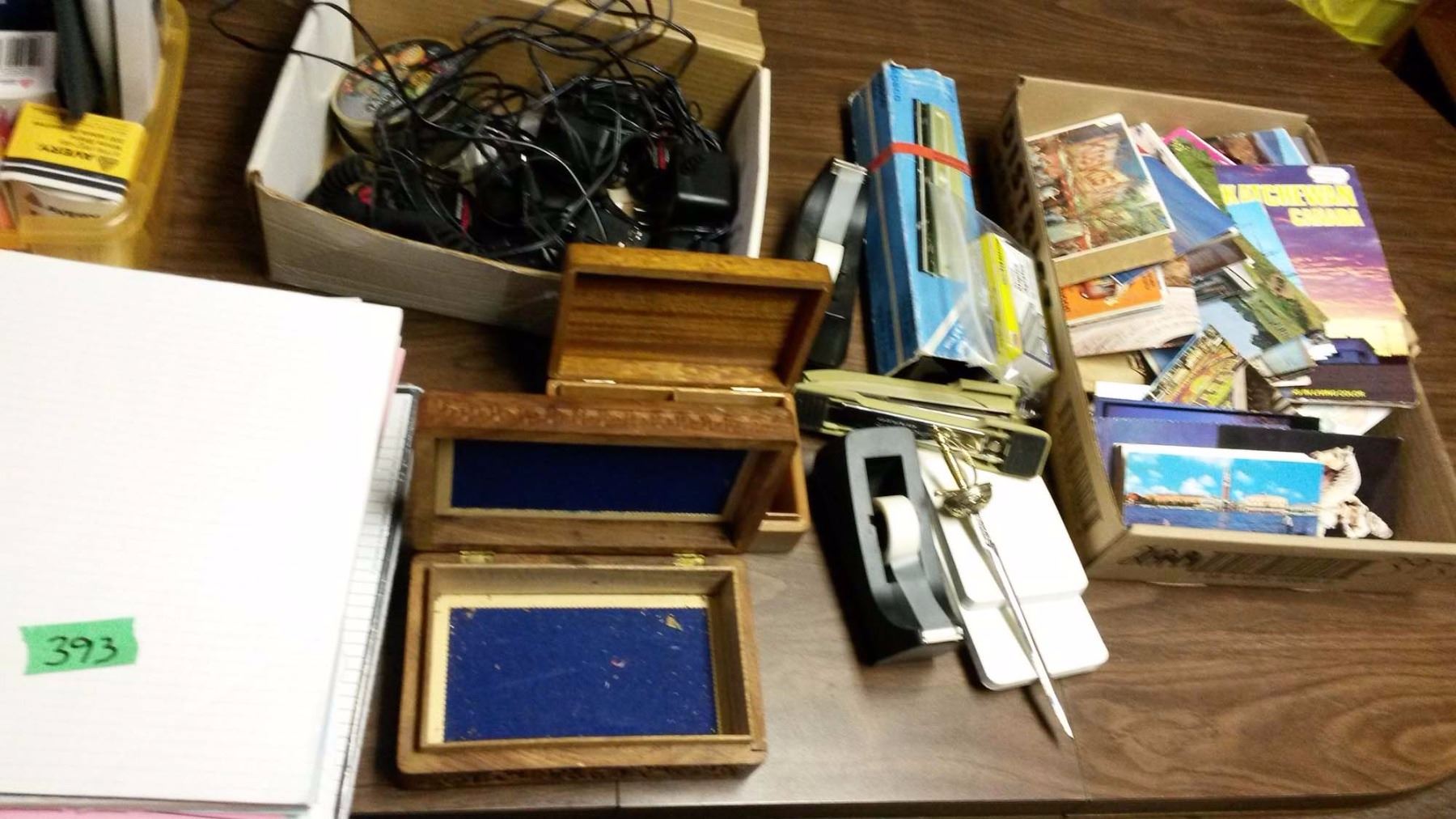 Wooden Boxes Of Postcards, Stationary Supplies, Misc.