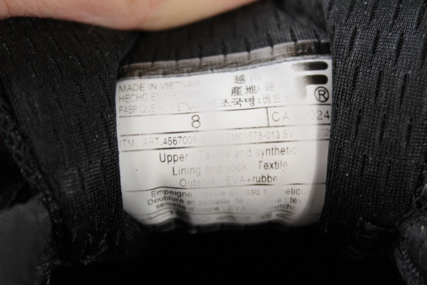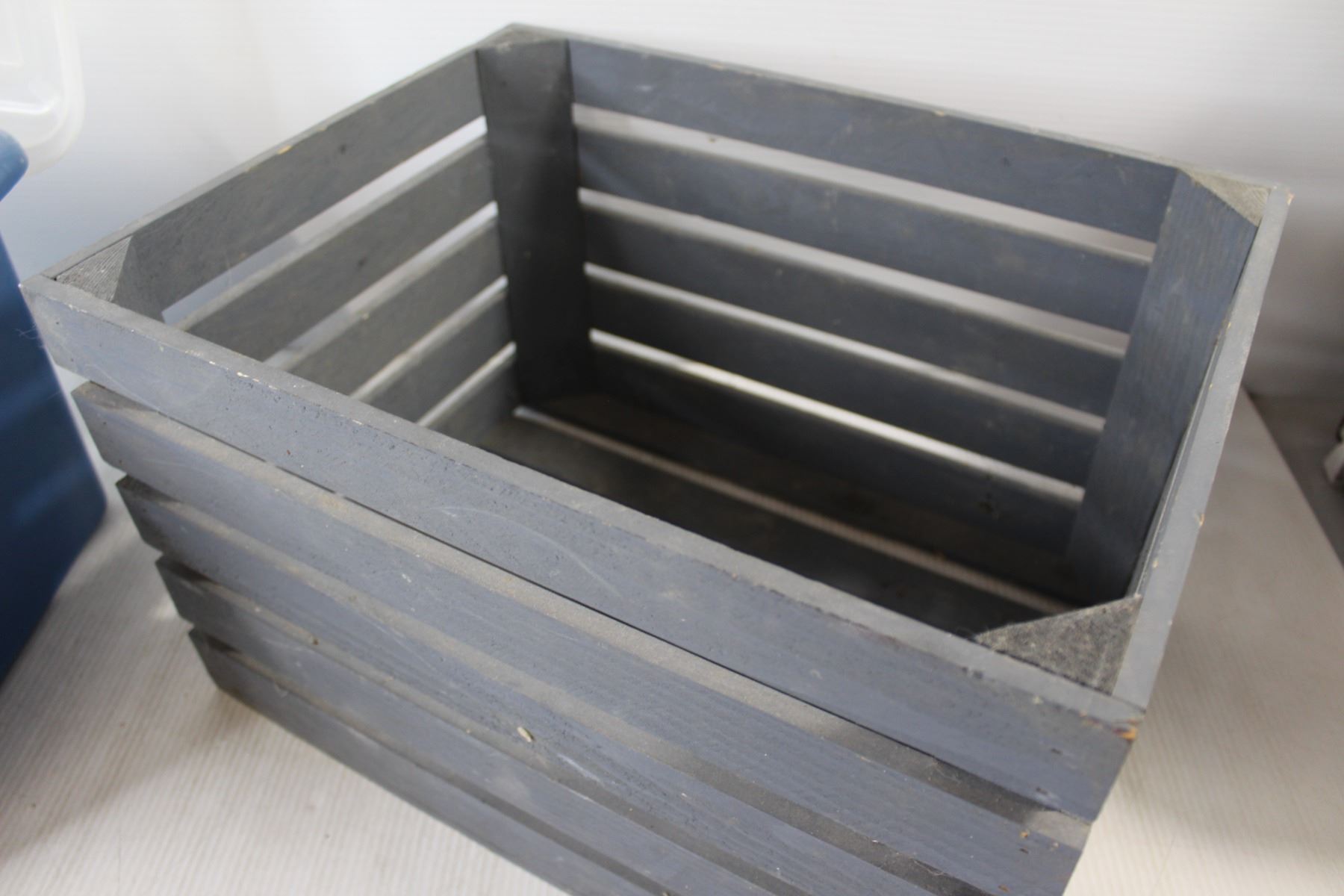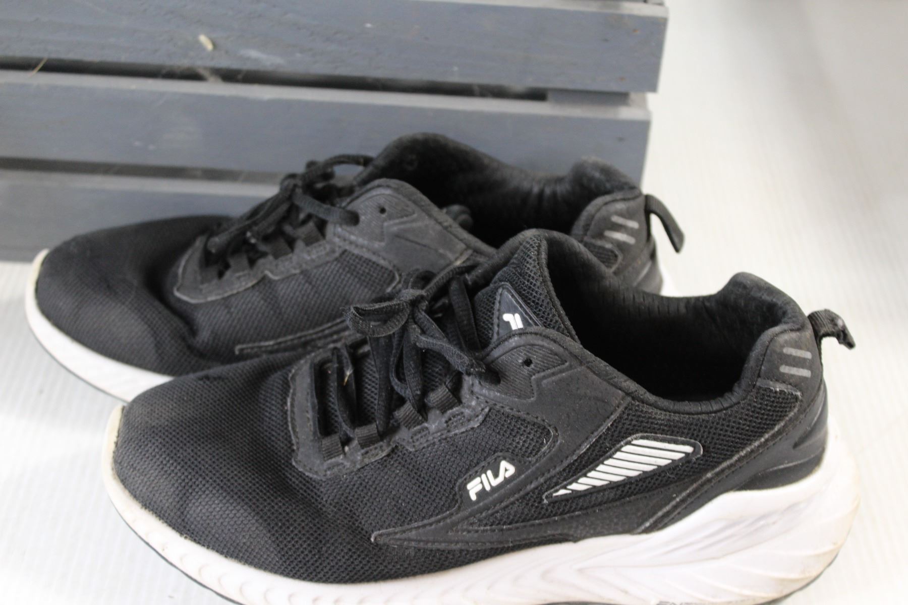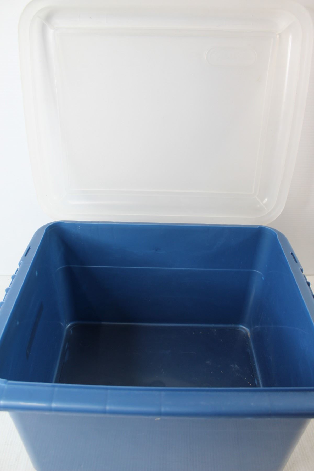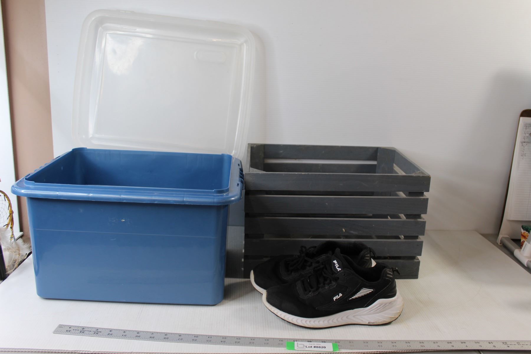 Wooden Crate, Pair of Black and White Fila Size 8 Running Shoes, Sterilite Plastic Tub Container