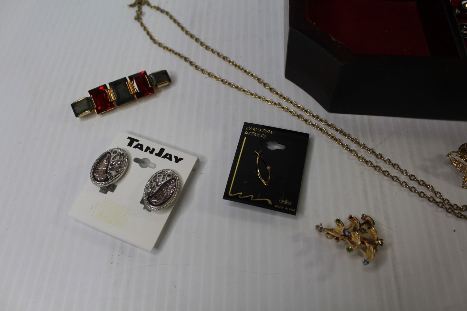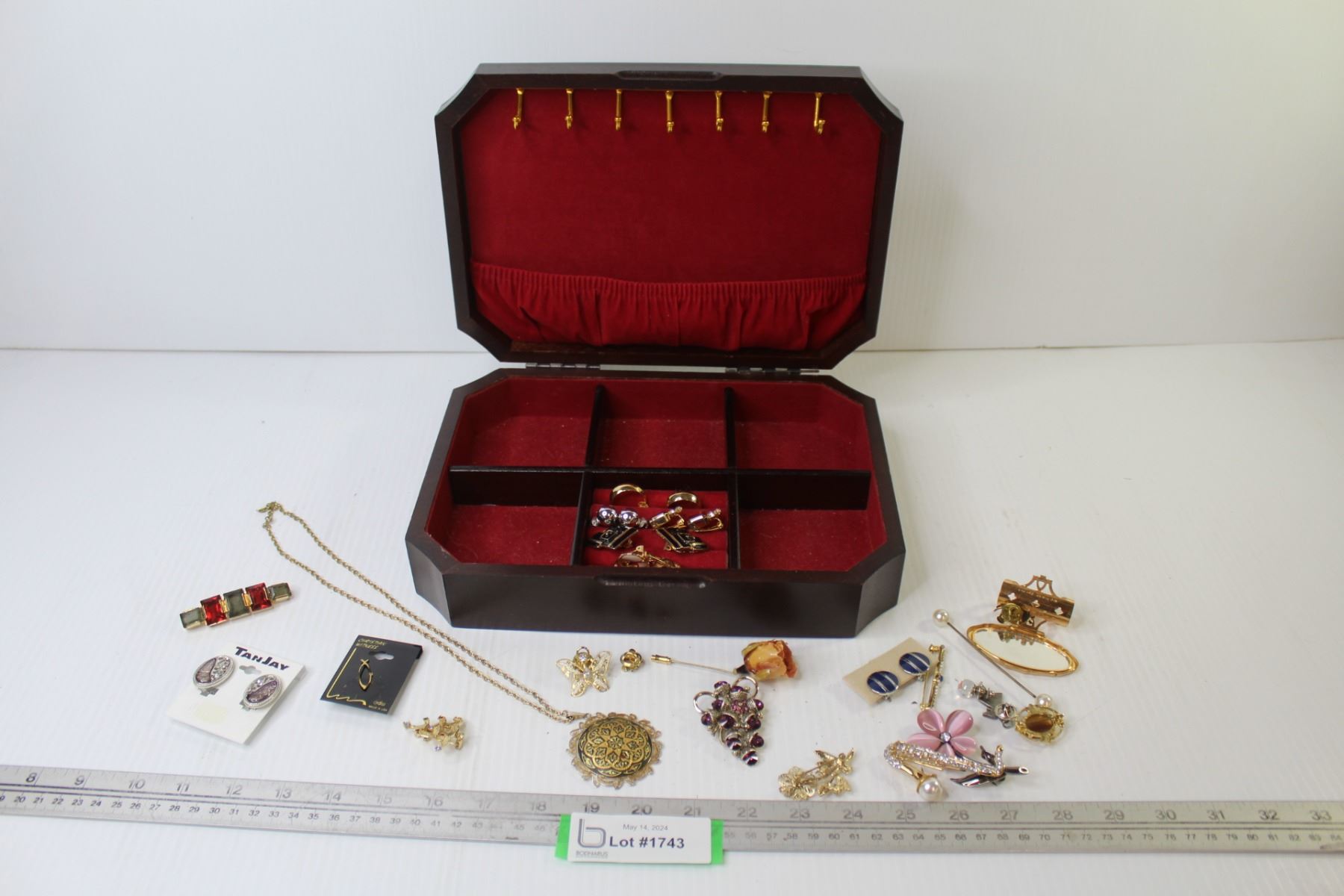 Wooden Jewelry Box w/Assorted Costume Jewelry - Brooches - Necklace - Clip-on Earrings - Hat Pins
