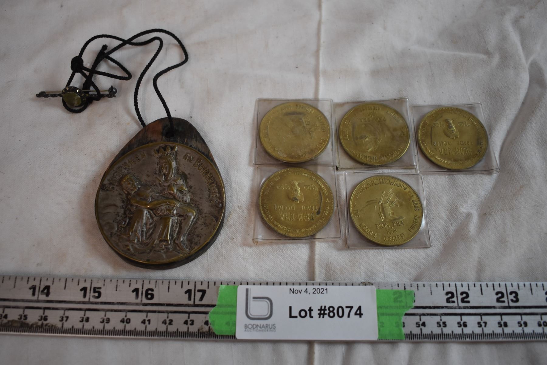 Wooden Medallion with 1968 Pioneer Trade Dollars